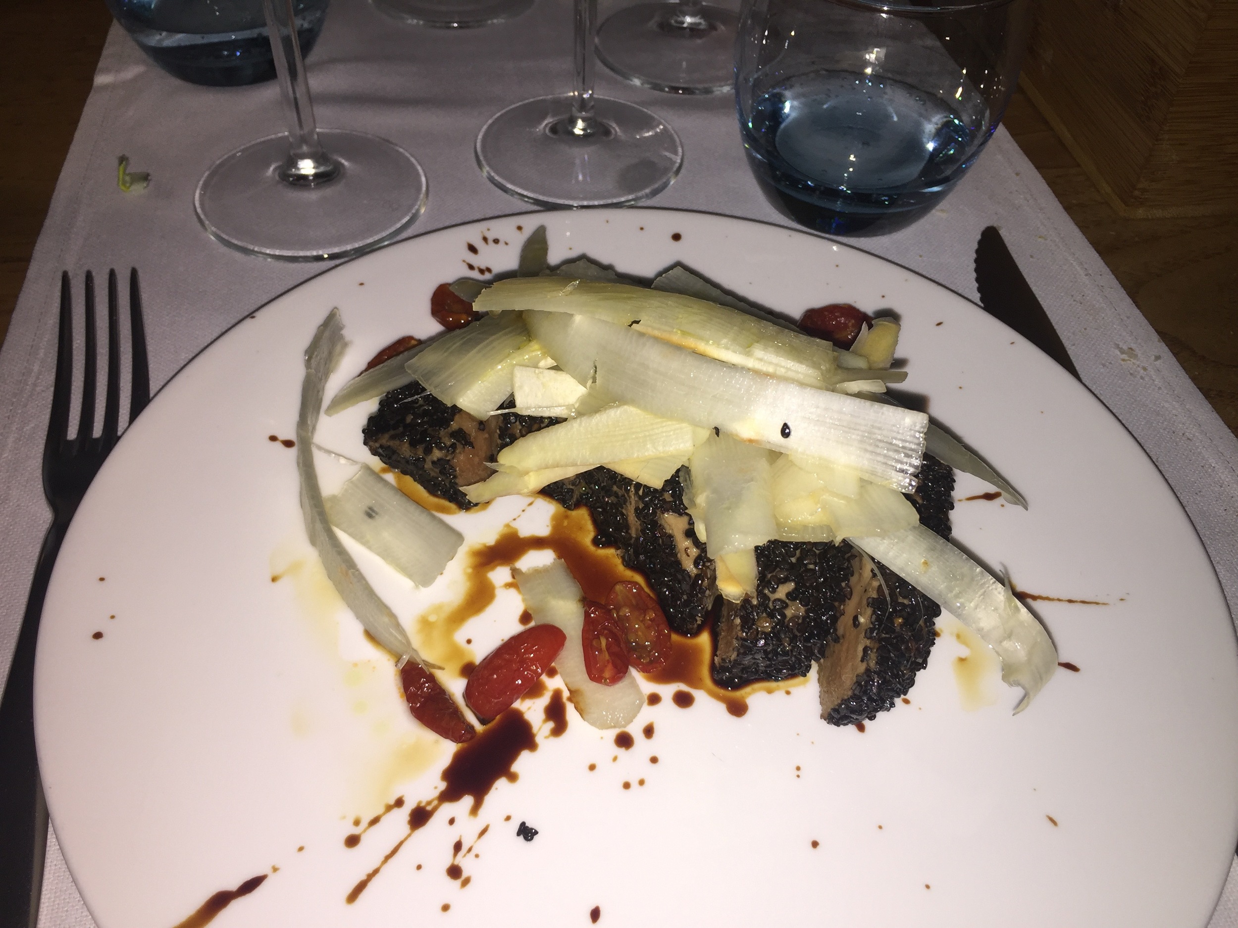 The first course consisted of mashed violet potatoes with red prawns and a Franciacorta wine sauce. A lovely combination, we take our hats off!