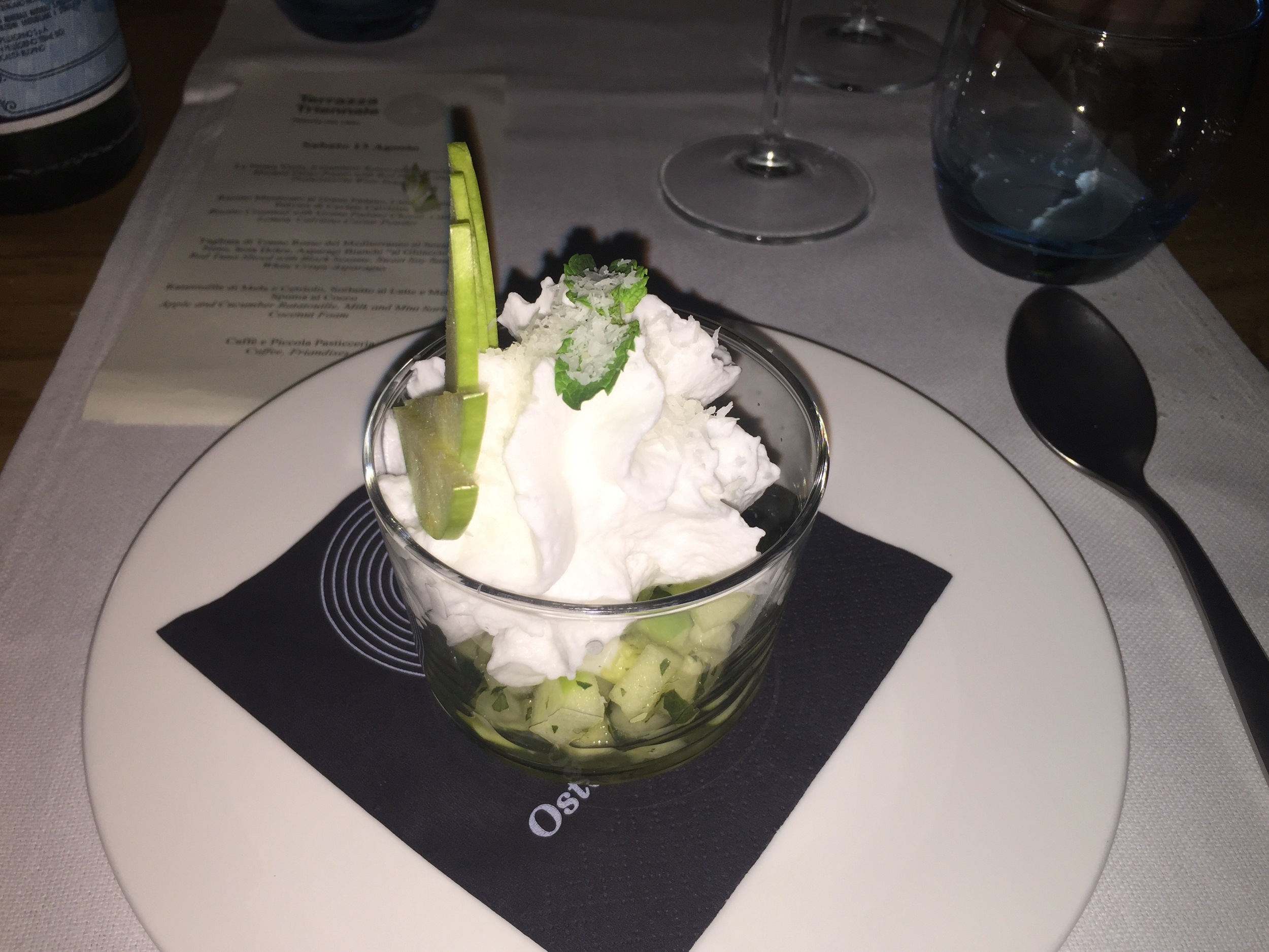 The dessert was lovely: fresh and gentle: An apple and cucumber ratatouille with milk and mint sorbet, topped with a coconut espuma. It felt so heavenly after such a hot day im Milano!