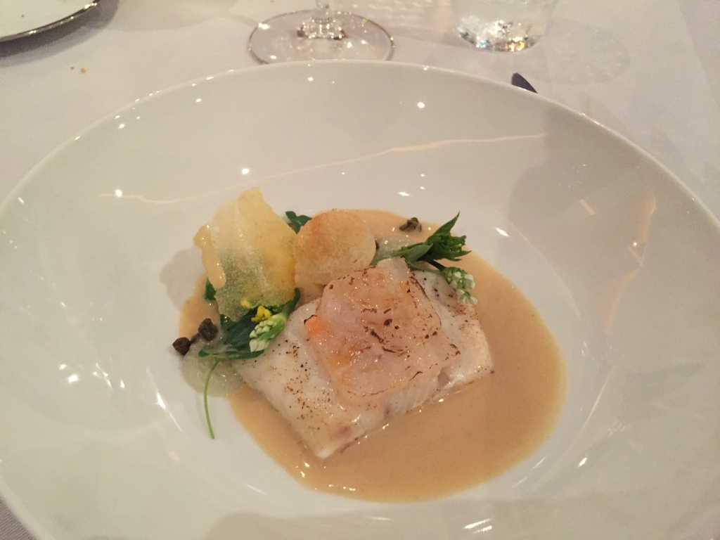 A filet of poached north sea turbot with sugar snaps and capers was accompanied by a potato sauce. Congratulations to the chefs - very well done!