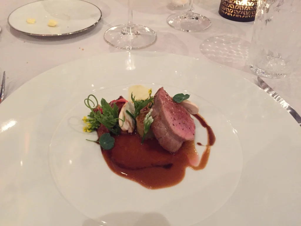 A fresh mixture of scallops, dried tomatoes, cucumbers and flowers, with gazpacho made the third course - paired with a 2014 Petit Chablis from Domaine Fourrey. A fruity and creamy, French white wine.