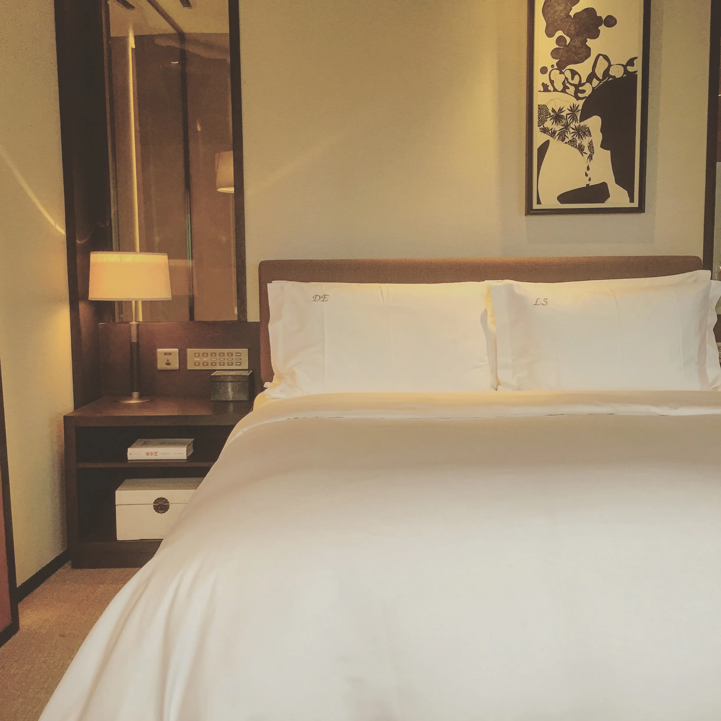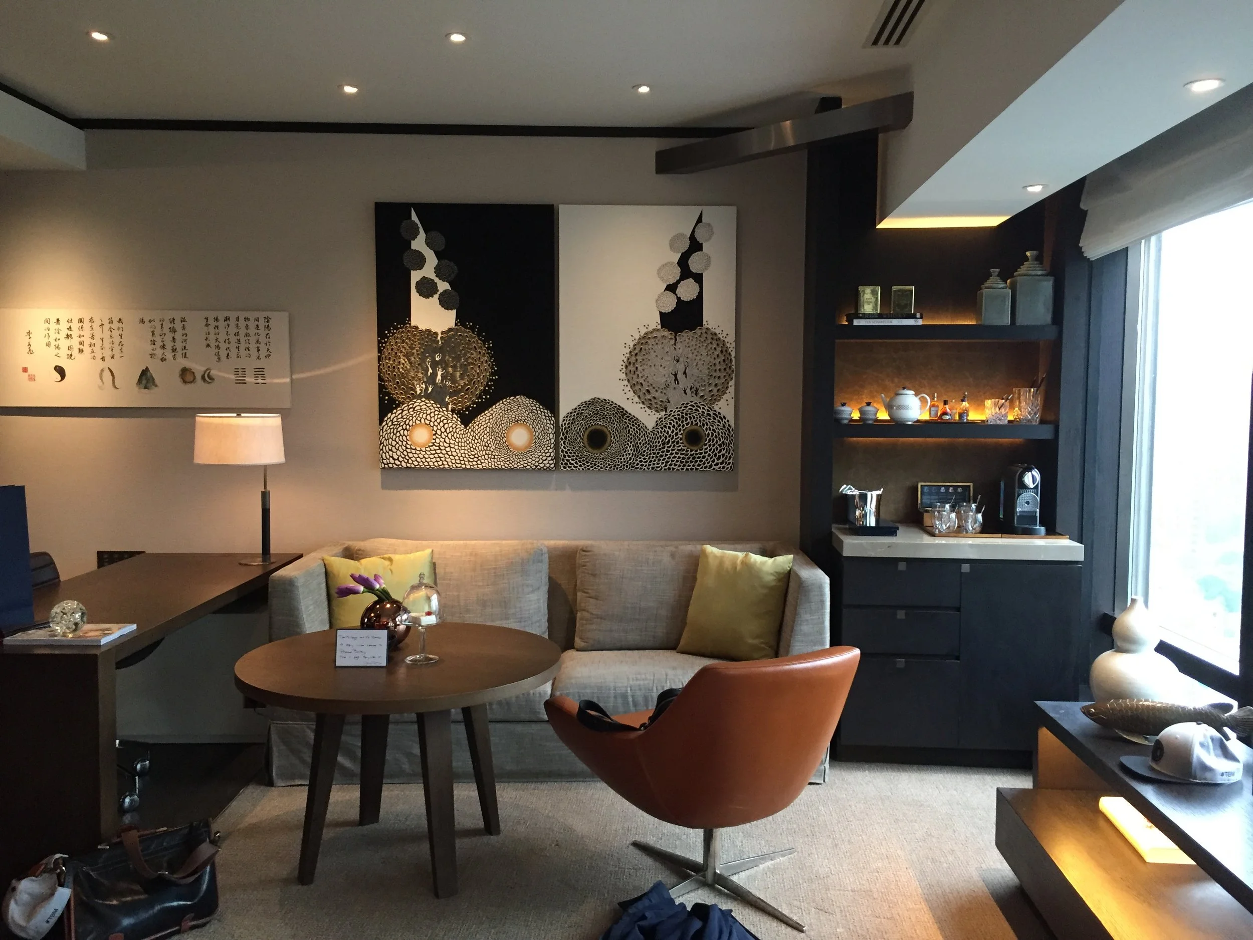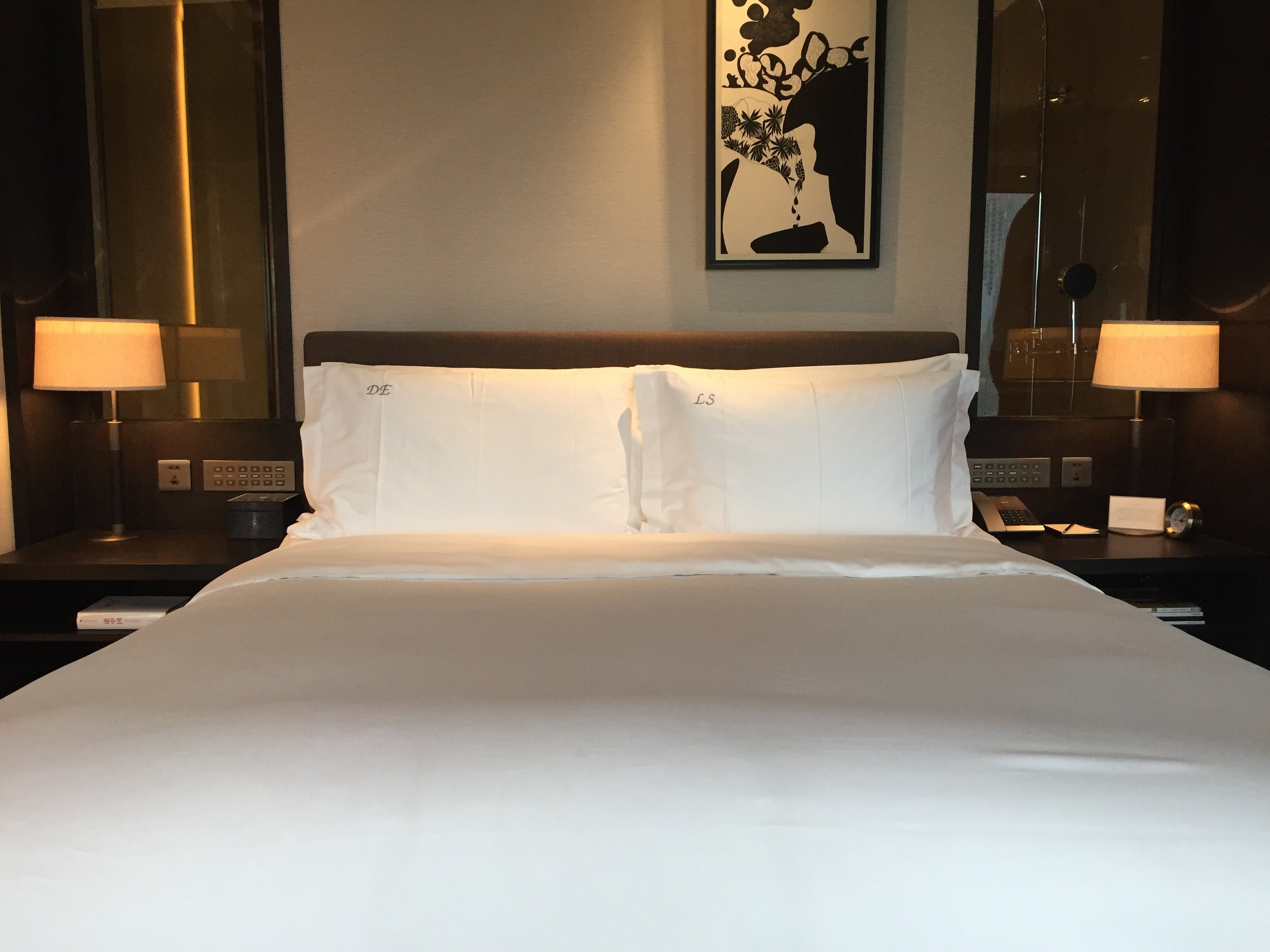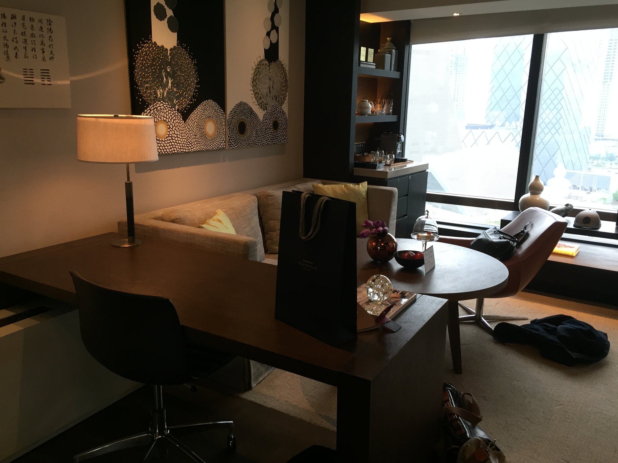 First, let us focus on our room - an entry-level Deluxe Room with access to The Manor Club (Rosewood Beijing's version of Club Lounge) and I have to add that the rooms are part of the most spacious entry-level rooms I have stayed in ever. I totally am in love with the interior decor, the attention to detail such as the vast amount of various book especially selected by curators plus the perfectly matching fabrics to the dark wood. If I would build my house tomorrow, it would not look any different. So we entered the spacious entree with the huge walk-in wardrobe to the left until we arrived in the middle of our semi-separated living room with a chic sofa, leather swivel chair, spacious working desk with comfortable seat as well as the stunningly designed minibar with amazing drinks, Nespresso coffee machine, plenty of Voss water as well as a handmade welcome amenity consisting of a white chocolate mousse cake with raspberry. Not yes convinced? Well, not a problem because the super amazing bed was upgraded with two monogrammed pillow cases, indicating our both initials such as D.E. and L.S. for Daniel and Lukas. I have to admit this was the first time such a thing happened to me and we both were blown away. Why in all sake would they just do this for a one night stay? It's because at the Rosewood Beijing guests are still treated like Kings and Queens even if the design more feels like a super modern British home.