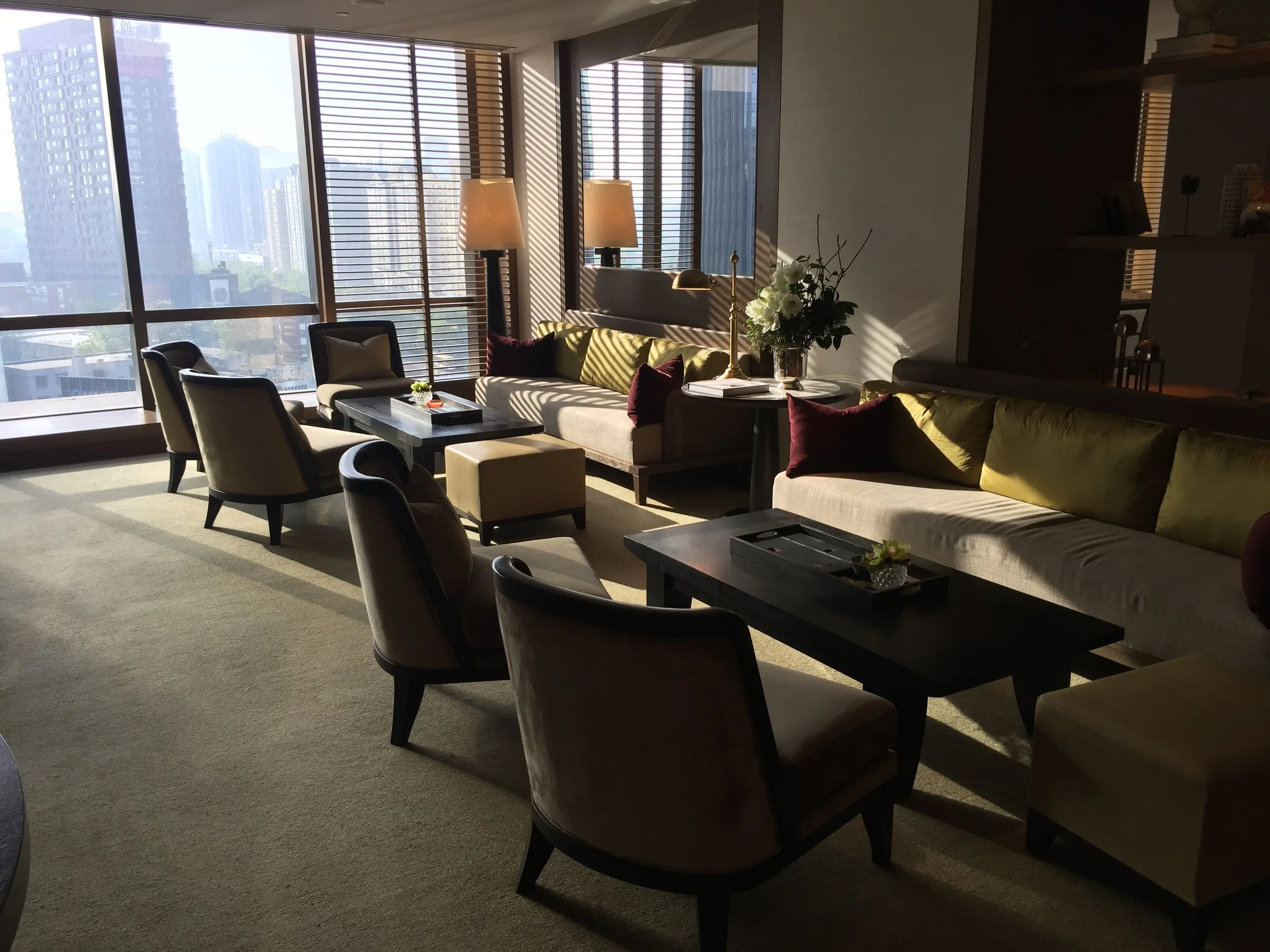 Seen enough of the room, we went down to the actually most exciting place of the hotel: The Manor Club Lounge. I have to say that I was a bit worried when I first entered the lounge because it is huge! Seriously there was plenty of space, with different living rooms, a terrace, and even a club room. Not even mentioning the vast buffet area where they had some snacks and small bites throughout the day. The only thing that I found quite interesting was the fact that alcohol is only complimentary during their happy hour lasting from 5-7pm. On the other times of the day, there was a charge for champagne, gin tonic, and other alcoholic drinks. But once they actually set up their Happy Hour, I was actually speechless. They did not just serve free flow Louis Roederer Brut and Rose, no they showed up with a trolley full of different Gins and plenty of tonic waters to make THE gin you always have or always wanted to try. Did I even mention the out-of-this-world buffet that comes along Happy Hour? With freshly cut Iberico ham, Italian grissini, the tastiest amuse bouche as well as the best sushi, the food presentation made it to the top hotel lounge in the world when it comes to my personal taste. The design adds for sure to the amazing experience, but Rosewood Beijing got my full attraction and honestly, I can't wait to go back to this lounge.