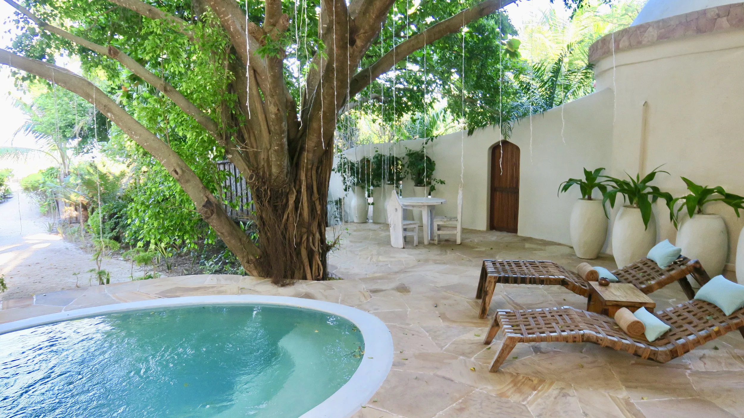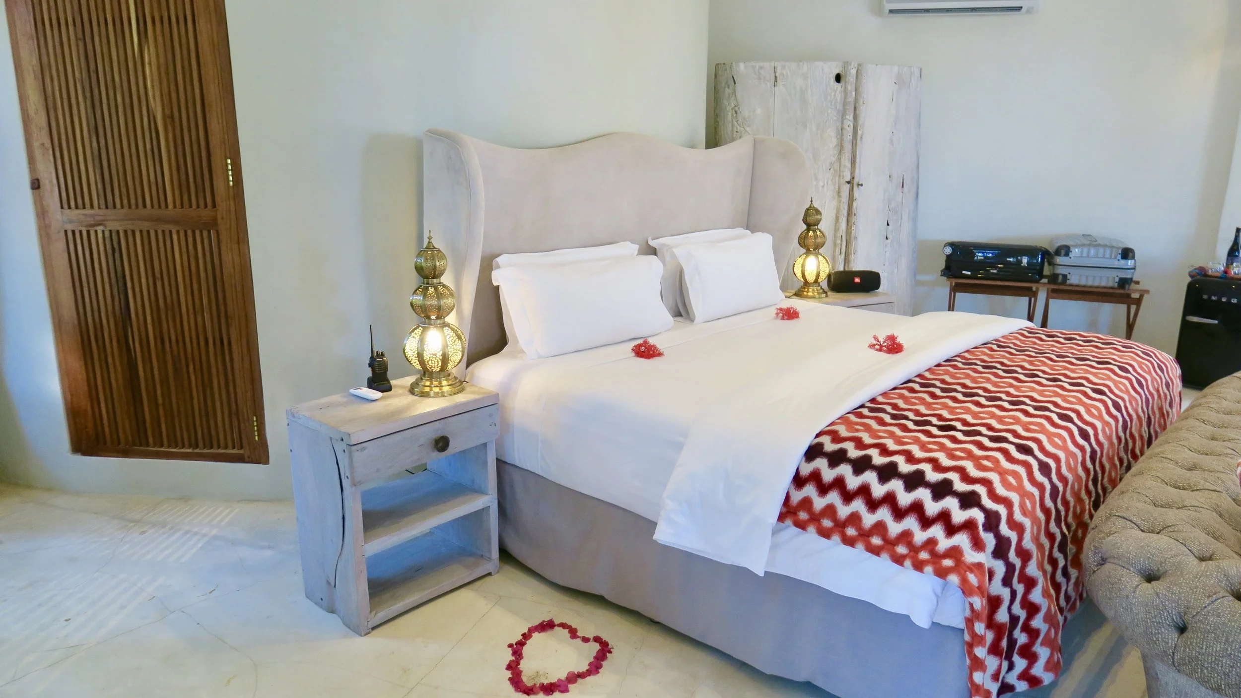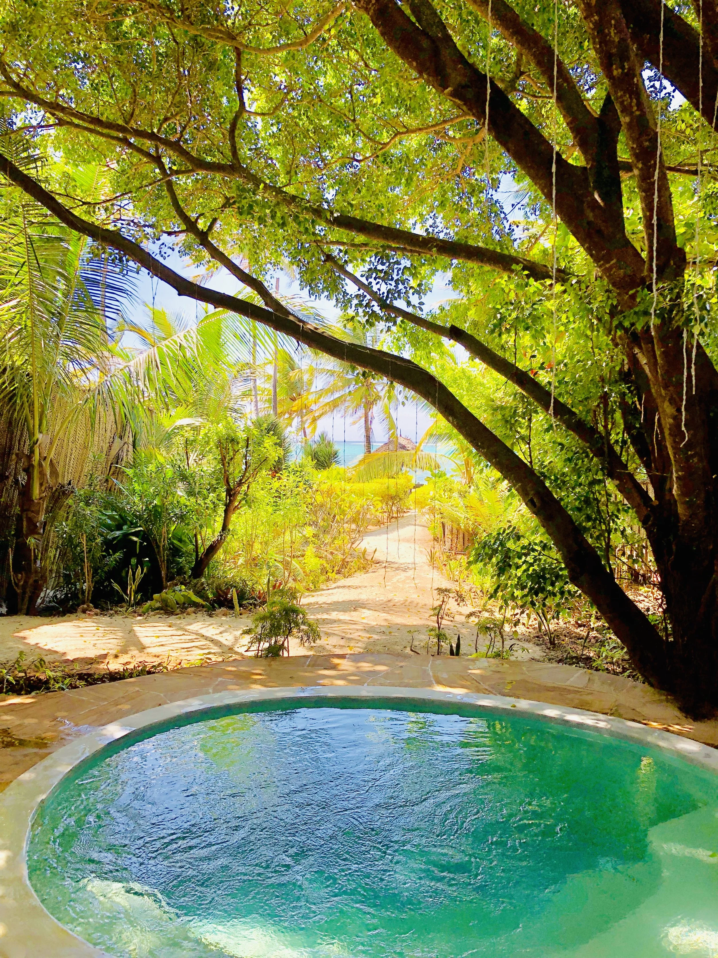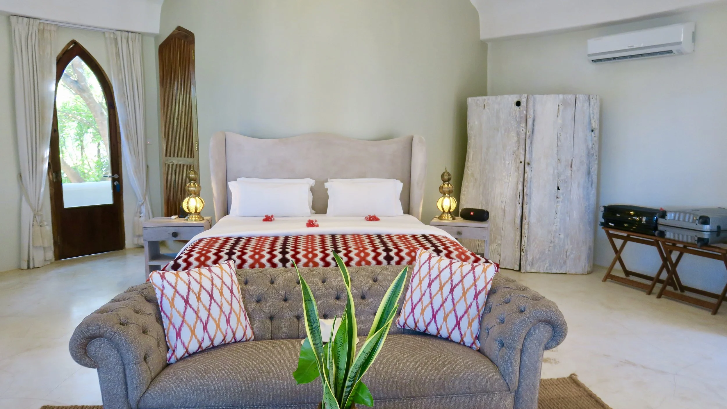 Back to our villa, which had a spacious open-air living room with a few sofas, a dining table and a small kitchen as well as a terrace with two lounge chairs and a plunge pool on the ground floor. The first floor came with windows and proper doors. The bedroom on the second floor was vast with another sofa, a small wardrobe and a posh double bed (the best we had in Tanzania!). Surprisingly, the minibar not only had soft drinks but wine bottles, next to the bedroom, there was a small balcony overlooking the sea as well as the bathroom on the other side. I absolutely loved the spacious walk-in shower with fantastic pressure, mosaic daybed in the centre, toilet, and double vanities along with fluffy towels and good smelling toiletries in a dispenser. Even though it did not seem evident to me, Xanadu has very ecological thinking behind the concept. I found it quite smart not to advertise it too much but still caring about the environment. Housekeeping did an absolutely fabulous job. Our villa was always in the best condition, and we did not realize them being here, even though we never left the room. I mean it was one of the three coolest hotel rooms we have ever had so obviously we had to enjoy it.