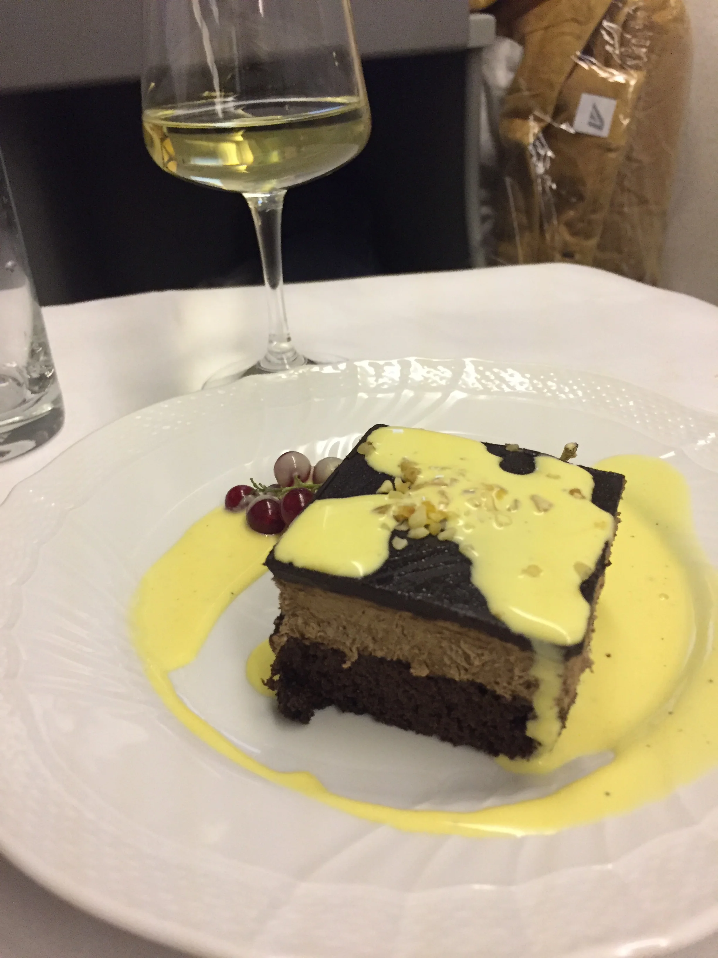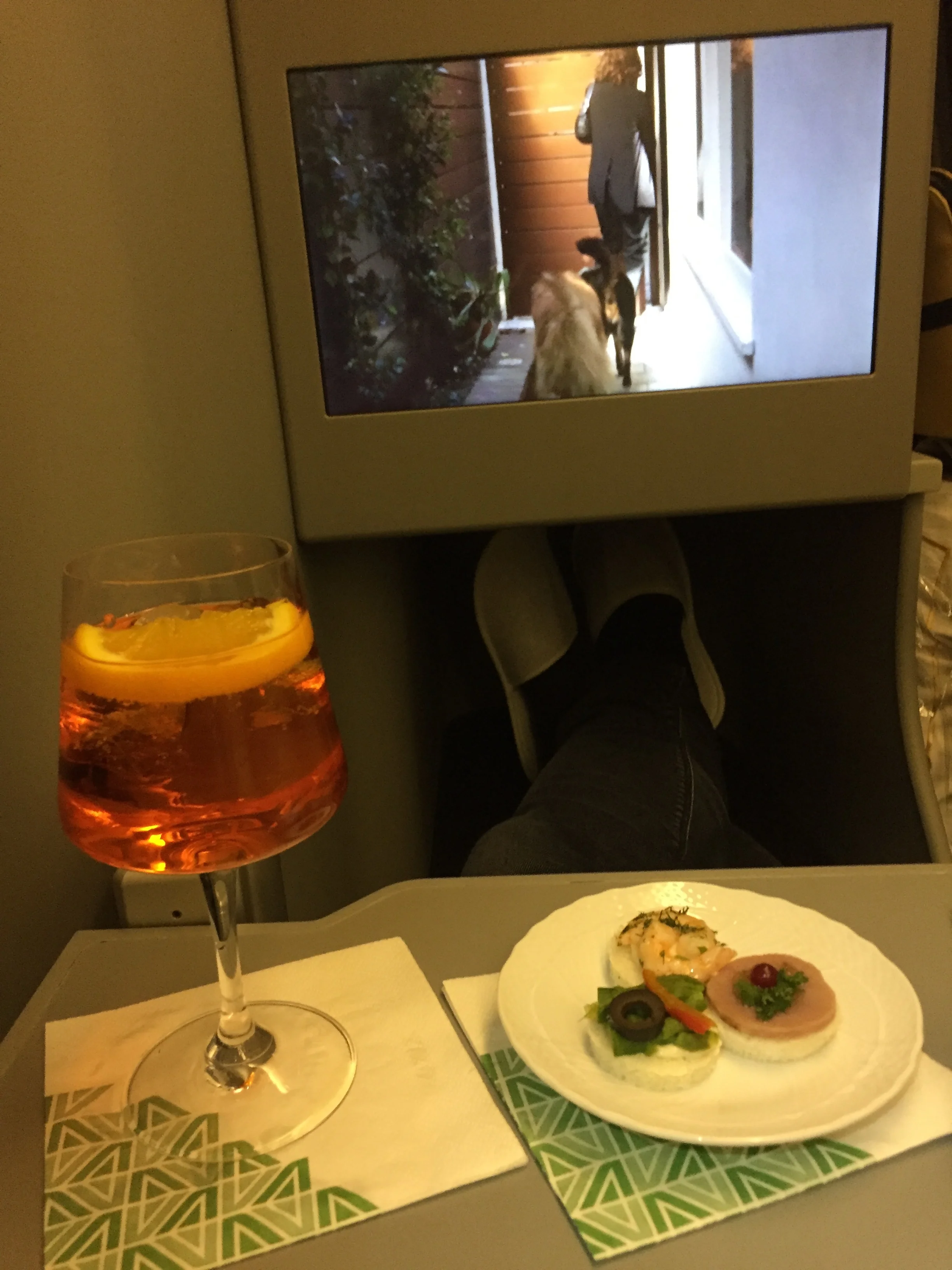 Just right after we took off with a delay of an hour, the crew came and asked for the dinner selection. Alitalia serves a four-course dinner plus some finger food along the Aperitif. It’s probably the airline with the best Aperol Spritz, and yes it’s tasty and has volume. I was served the first course: a cold seafood salad, followed by a pasta dish which I would describe as some of the most tasteful pasta I have had on a plane. The main course was a sea bass fillet with rosemary potatoes and grilled vegetables. I totally fell in love with the taste and the quality of the main course. Also the wine menu was quite alright with good white and red wines, tough the price was low and they weren’t of highest quality. Interestingly the poured my wine glass nearly completely full like 0.2 instead of 0.1 litres. This could be due to the fact that after dessert (which was the worst part of the menu by the way) nobody ever arrives again. So whenever you wanna drink or eat something you have to get up and go find someone. Alternatively you can just serve yourself at the bar in between the two business class cabins. Not sure if this was planned to be but I would have loved to have a coke or sparkling water. To be honest, it was quite hard to not drink anything during 10 hours. Fortunately I managed to sleep for a few hours - being too excited to meet my colleague and friend Lukas finally again.