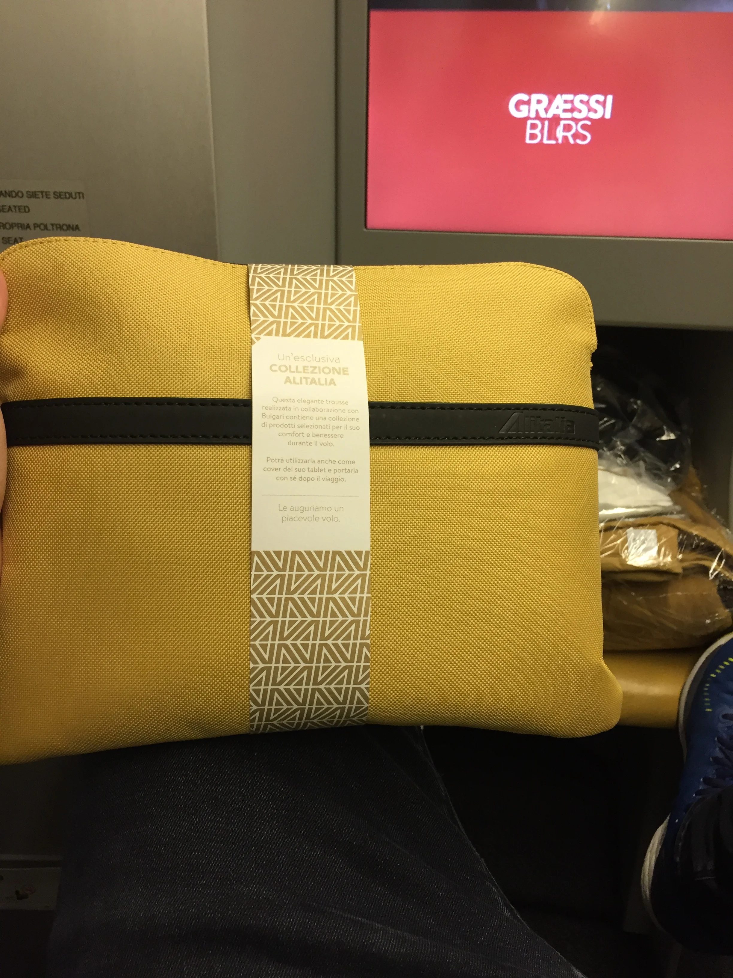 The general interior of the Business Class was very nice from my point of view. I had a seat and began to arrange all my stuff eg placing the headphones next to me and preparing the phone charger. After I have been all set, the purser came to my seat, introduced himself and shook my hand. I know this service from Austrian Airlines but was impressed to see this at Alitalia. He informed me about the ultra long flight and the flight time. The first stewardess arrived and handed me over the amenity kit as well as the menues. Alitalia‘s amenity kit is made by Bulgari and includes of course a Bulgari face cream, hand cream and lip balm along the usual products provided like eye mask, ear plugs and socks. The bag can be used as a tablet case, generally a nice idea and more exclusive than the kits at Iberia or Austrian. The pre-departure drinks were Ferarri spumante (Italian Champagne), orange juide and water. I didn‘t mind another glass of bubbles to sleep better (I know it is not the right way to sleep on a plane but personally it helps).