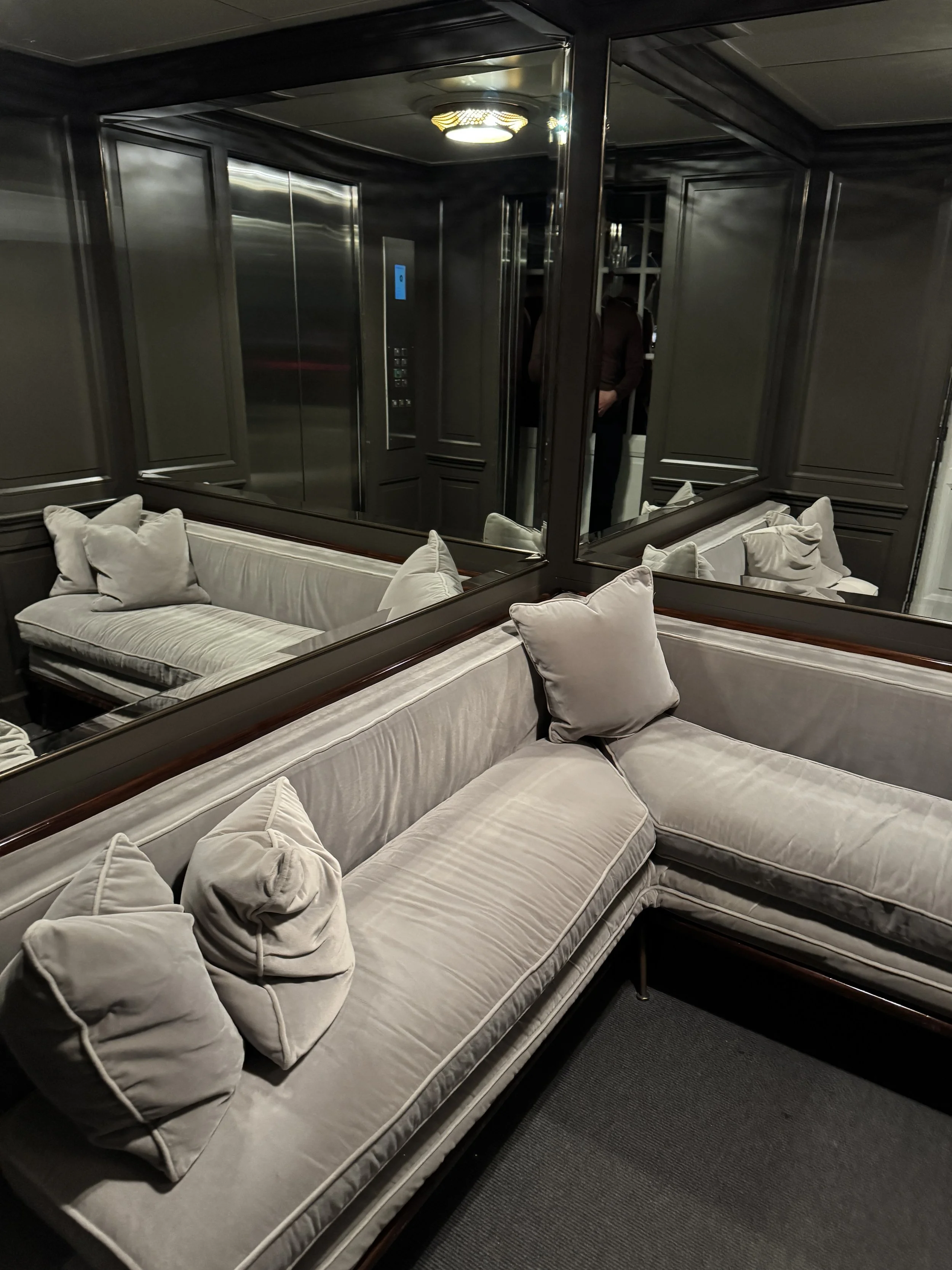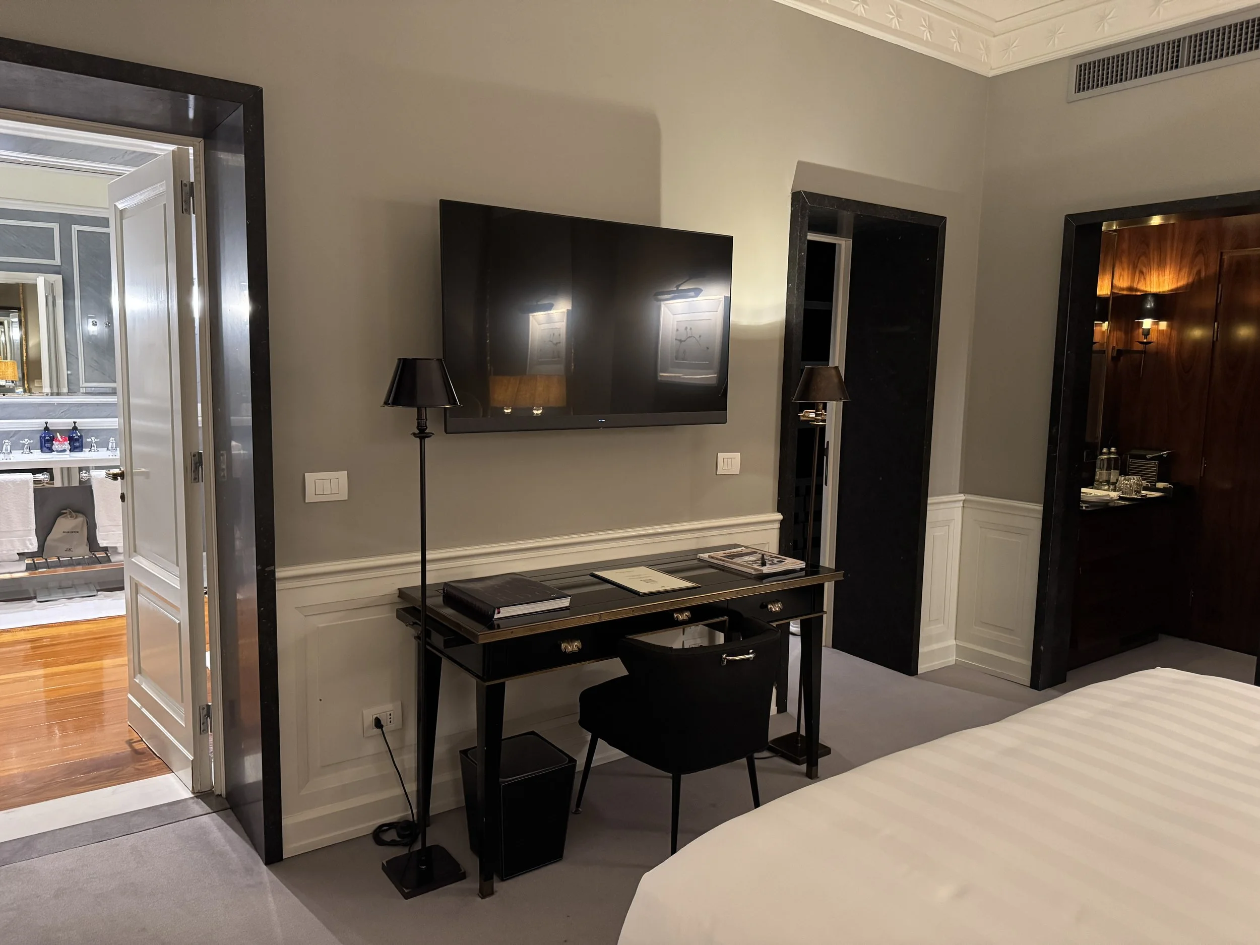 The room itself was designed in elegant grey tones and featured exceptionally refined materials. From plush curtains and soft carpeting to bespoke furniture curated by Michele Bonan, every detail felt intentional. It was refreshing to see furniture that does not appear in countless other luxury hotels. Everything felt cohesive and of outstanding quality — especially the mattress and the bathroom fixtures, including a generous rain shower head, elegant faucets, and beautifully crafted towel holders. Thanks to the ample wardrobe space, we were able to fully unpack and store our suitcases out of sight, leaving the bedroom uncluttered. This allowed us to use the two armchairs for in-room breakfast while still enjoying a sense of space and lightness. Above the writing desk, a brand-new Loewe television blended seamlessly into the design, flanked by two stylish floor lamps.