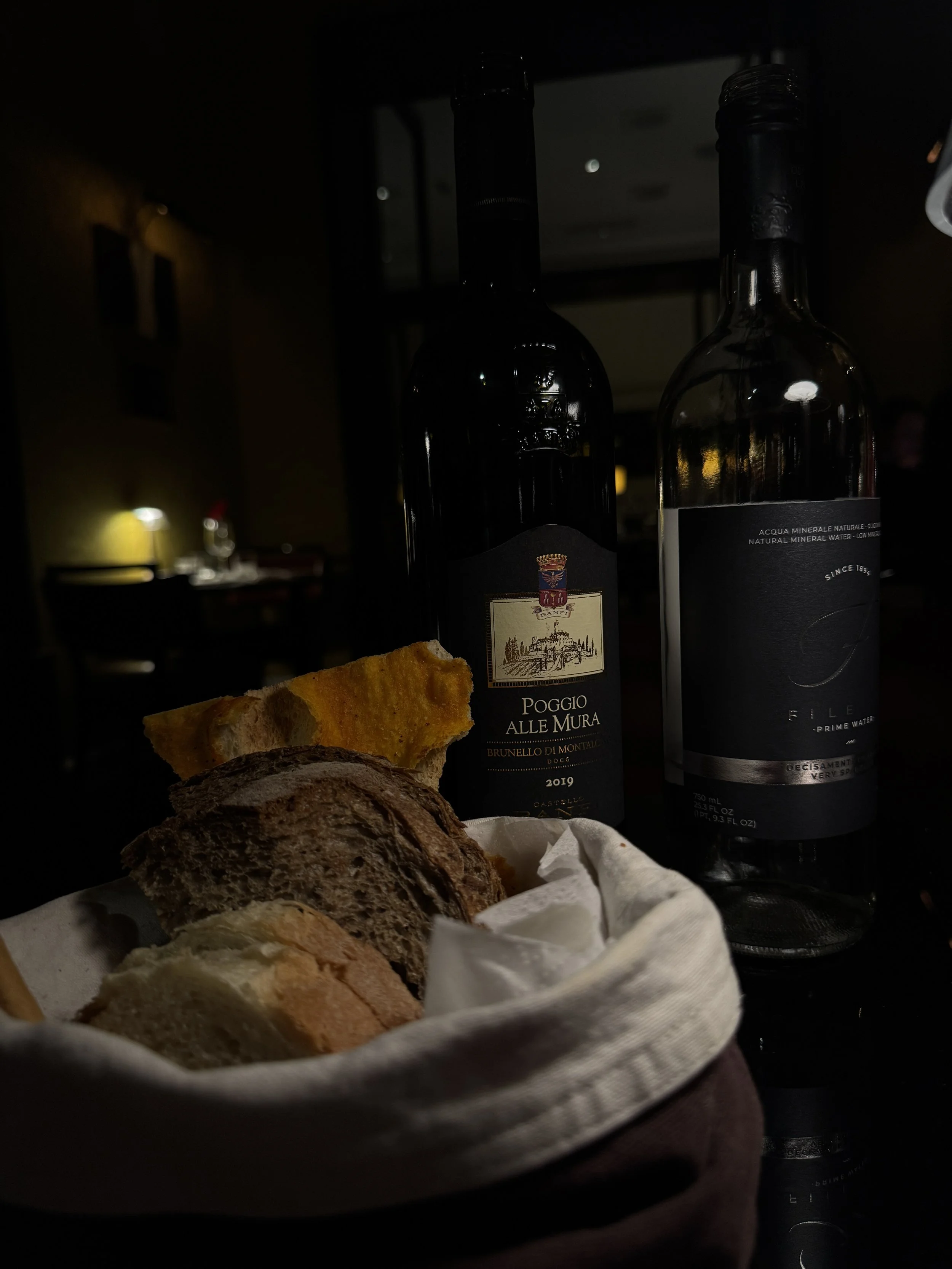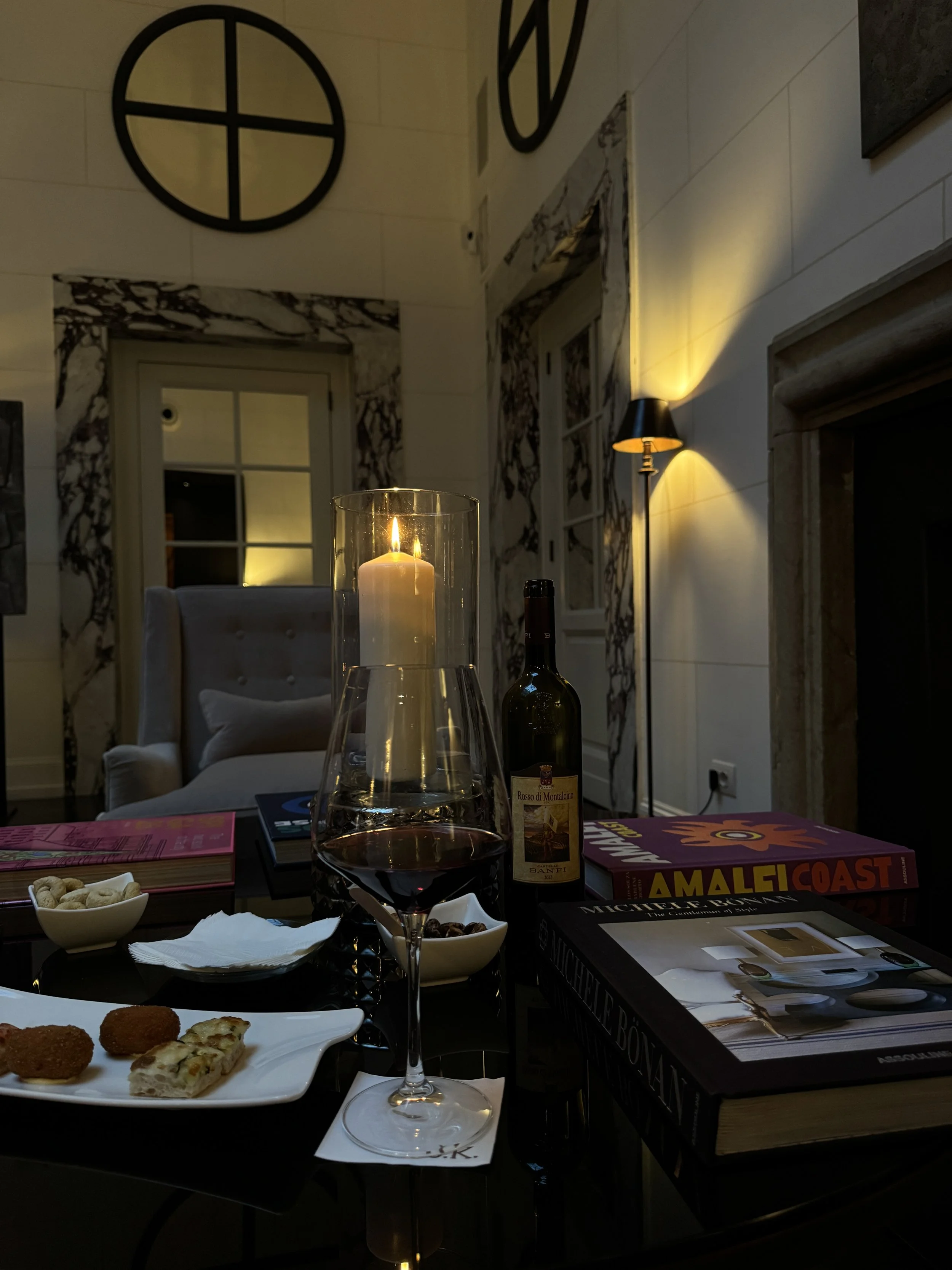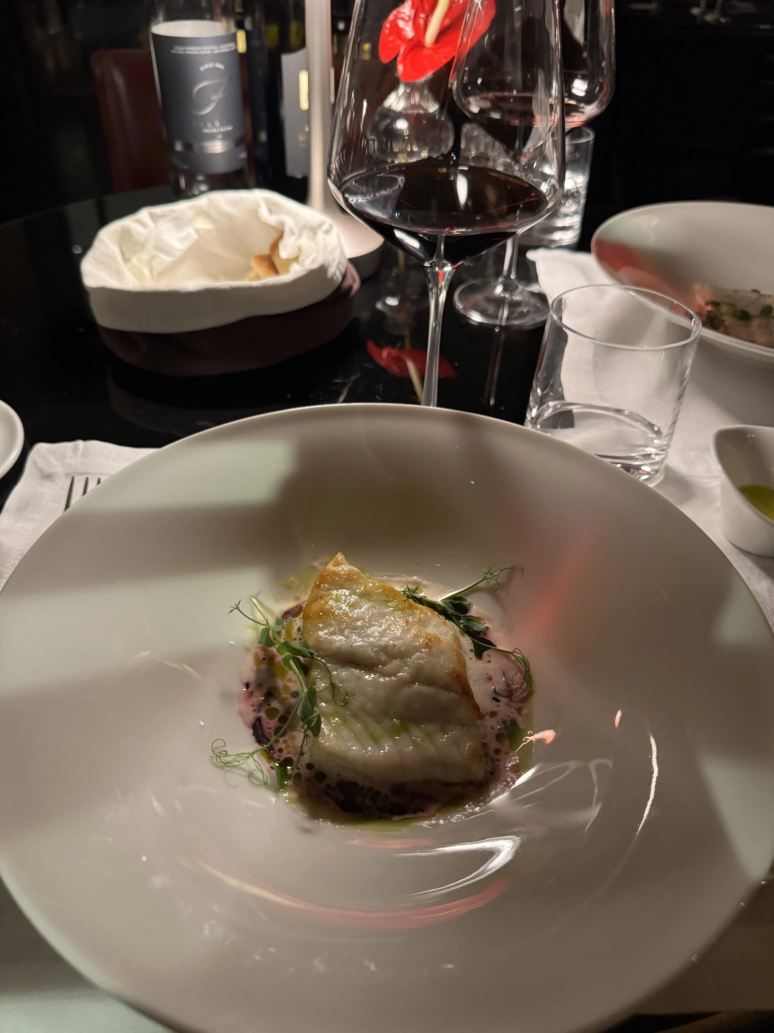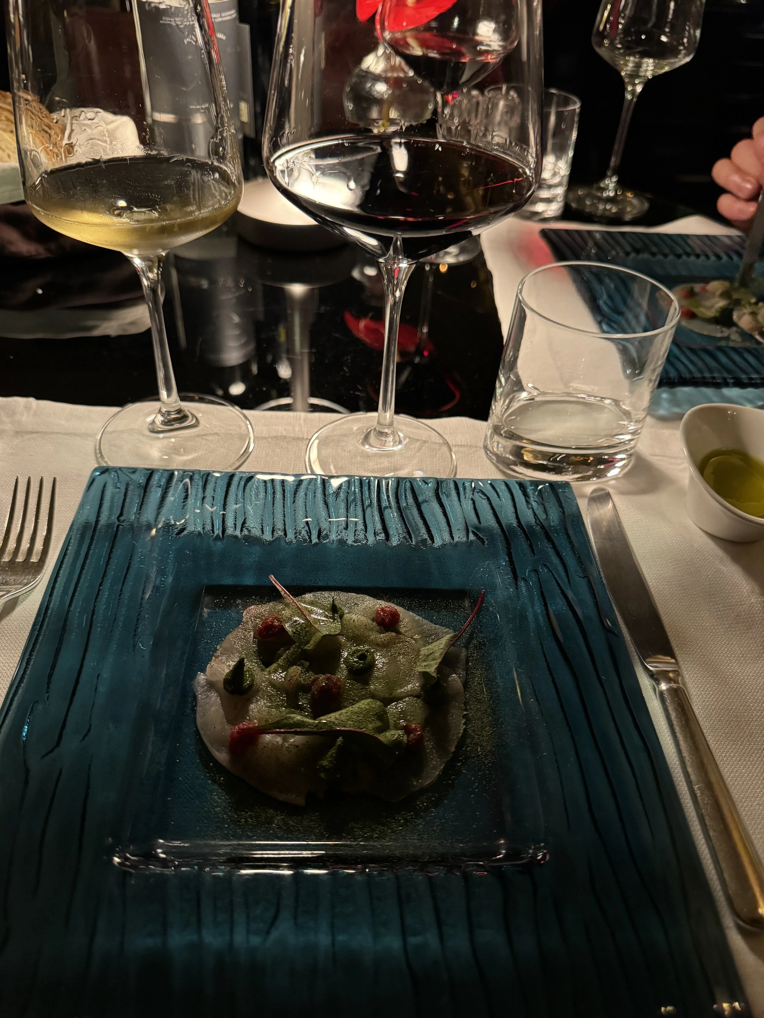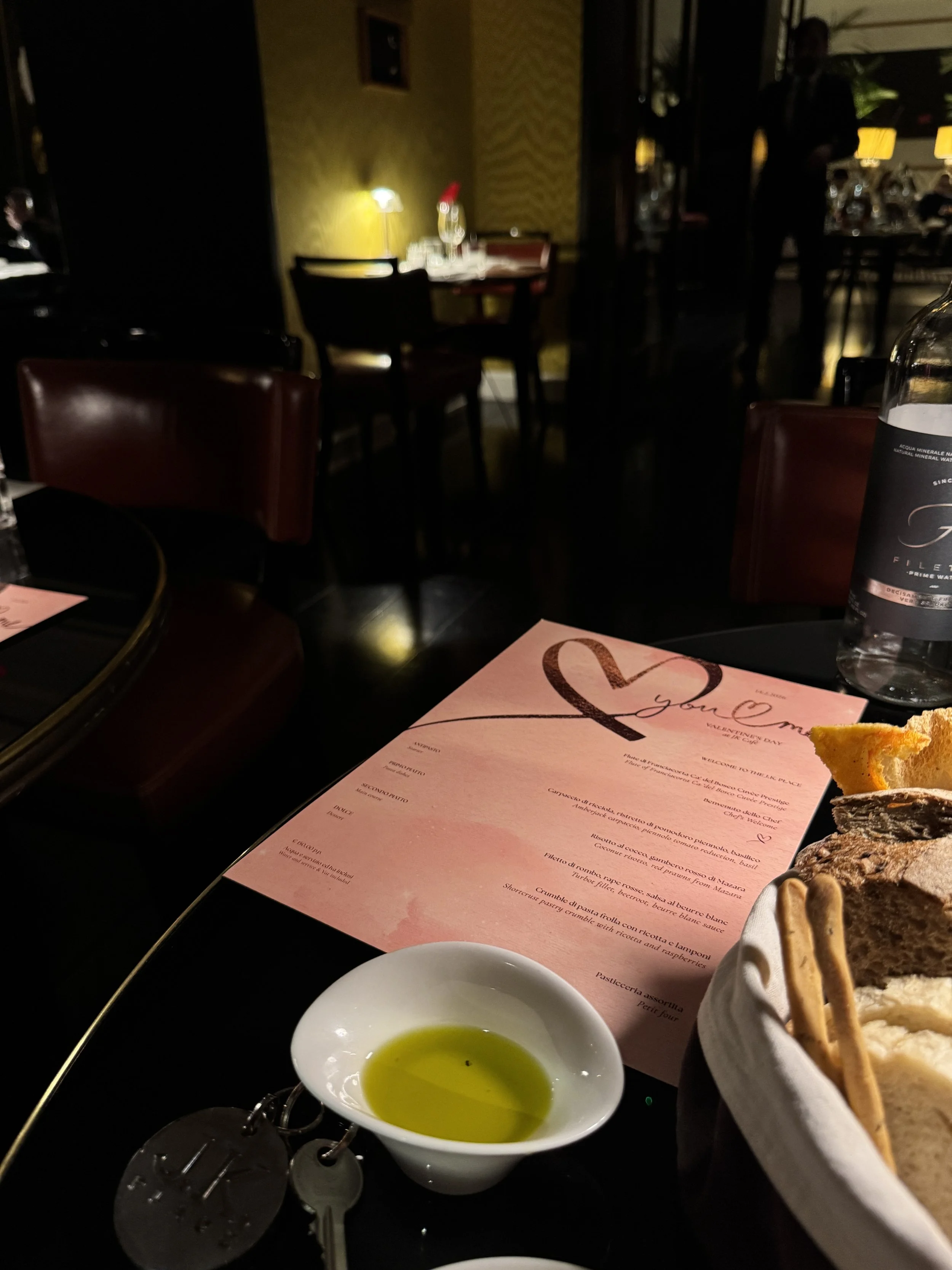 As our second day coincided with Valentine’s Day, we chose to remain at JK Café for dinner. The special set menu was priced at €150 per person and consisted of a refined four-course dinner. It began with a series of amuse-bouches and a welcome glass of Franciacorta, followed by a basket of irresistible homemade bread. The starter was amberjack carpaccio, delicate and perfectly balanced. This was followed by coconut risotto with red prawns — a surprising yet harmonious combination. For the main course, we enjoyed turbot fillet with beetroot and beurre blanc sauce. Dessert concluded the evening with a shortcrust pastry filled with ricotta and raspberries. As expected for a hotel of this caliber, prices are at the higher end. A glass of Rosso di Montalcino during aperitivo was €26, while a bottle of Brunello di Montalcino was attractively priced at €140. Considering the exceptional ambiance and stunning interiors, the pricing feels justified.