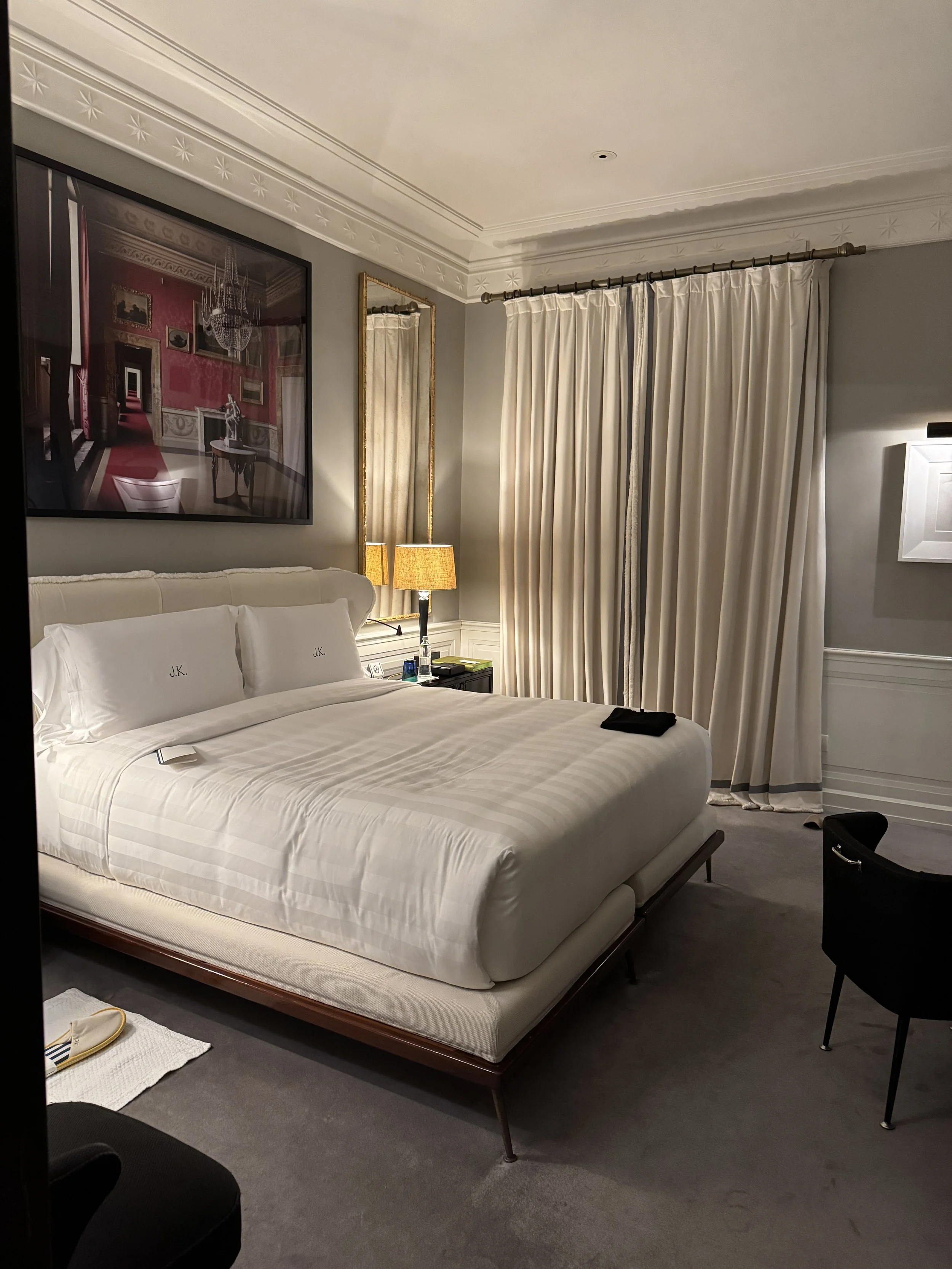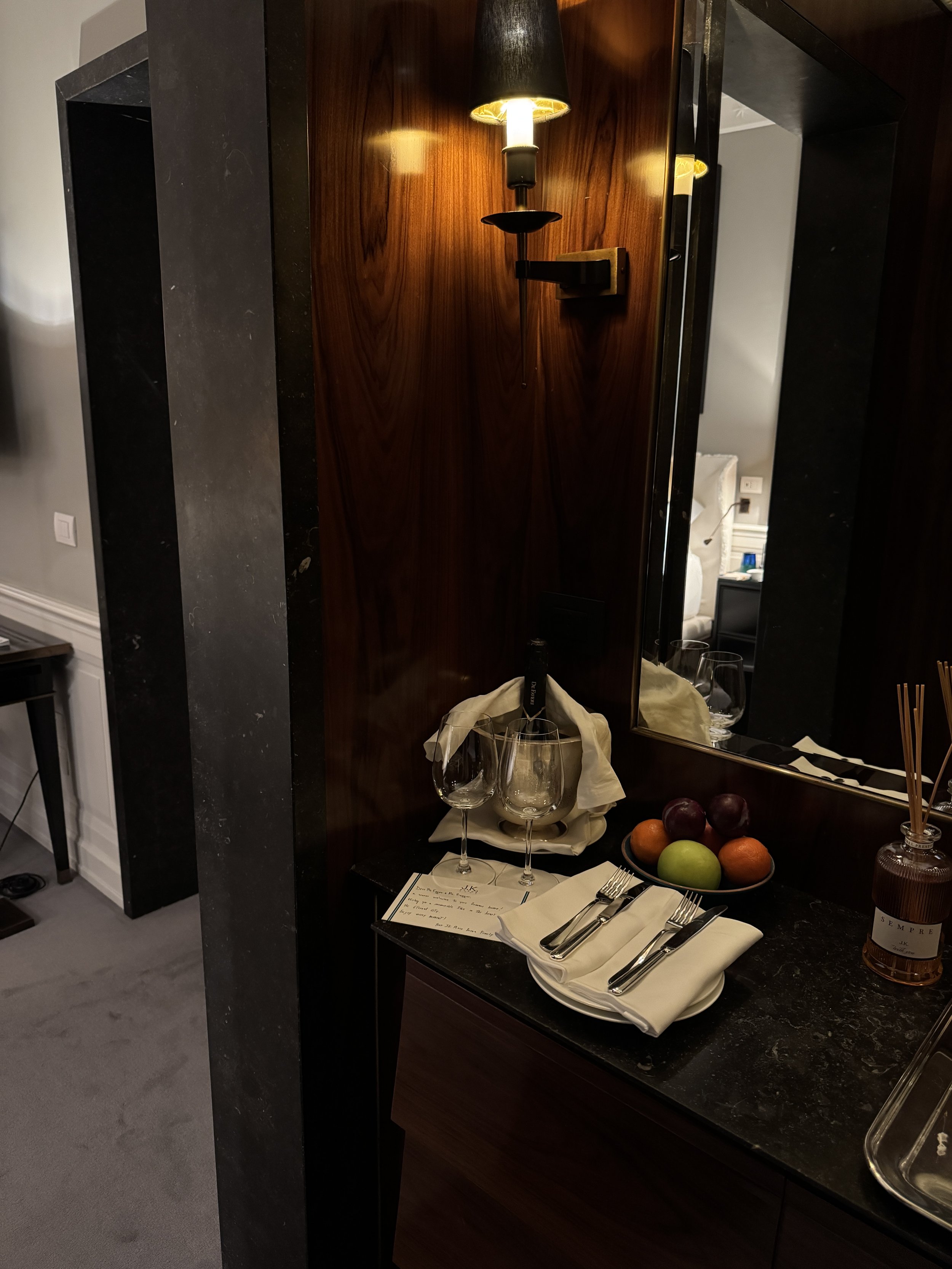 A simple example: when we casually asked where the crisps served at the bar were sourced from, a member of staff returned minutes later with a full package beautifully wrapped in a gift bag for us to take home. On our final evening, we entered the room to find stylish J.K.-branded caps placed on the desk as a farewell present. These are not grand gestures, but rather meaningful details that collectively define the experience. Everything feels intentional, curated, and delivered with genuine hospitality. J.K. Place Roma fully met our already high expectations and, on several occasions, even exceeded them. While the nightly rates are among the highest in Rome, the experience justifies the investment. Having previously stayed at two other high-end Roman properties — both operated by a London-based luxury brand and priced even higher — I would undoubtedly choose J.K. Place Roma again. The brand has once more proven why it ranks among my favorite hotel groups worldwide: it offers a consistent, reliable level of understated luxury, delivered with personality and warmth.