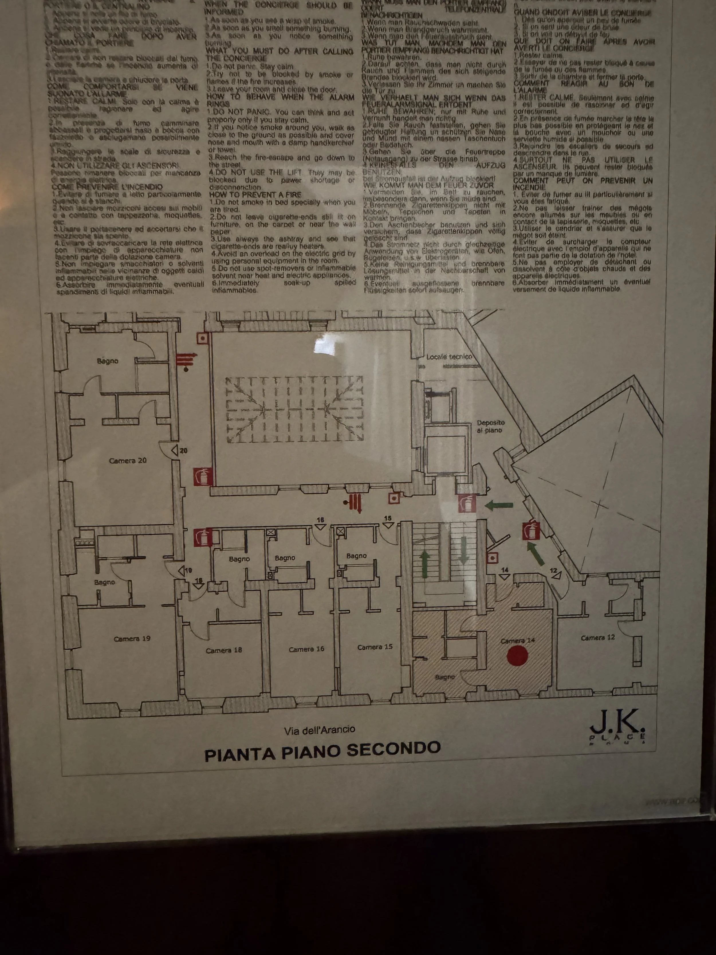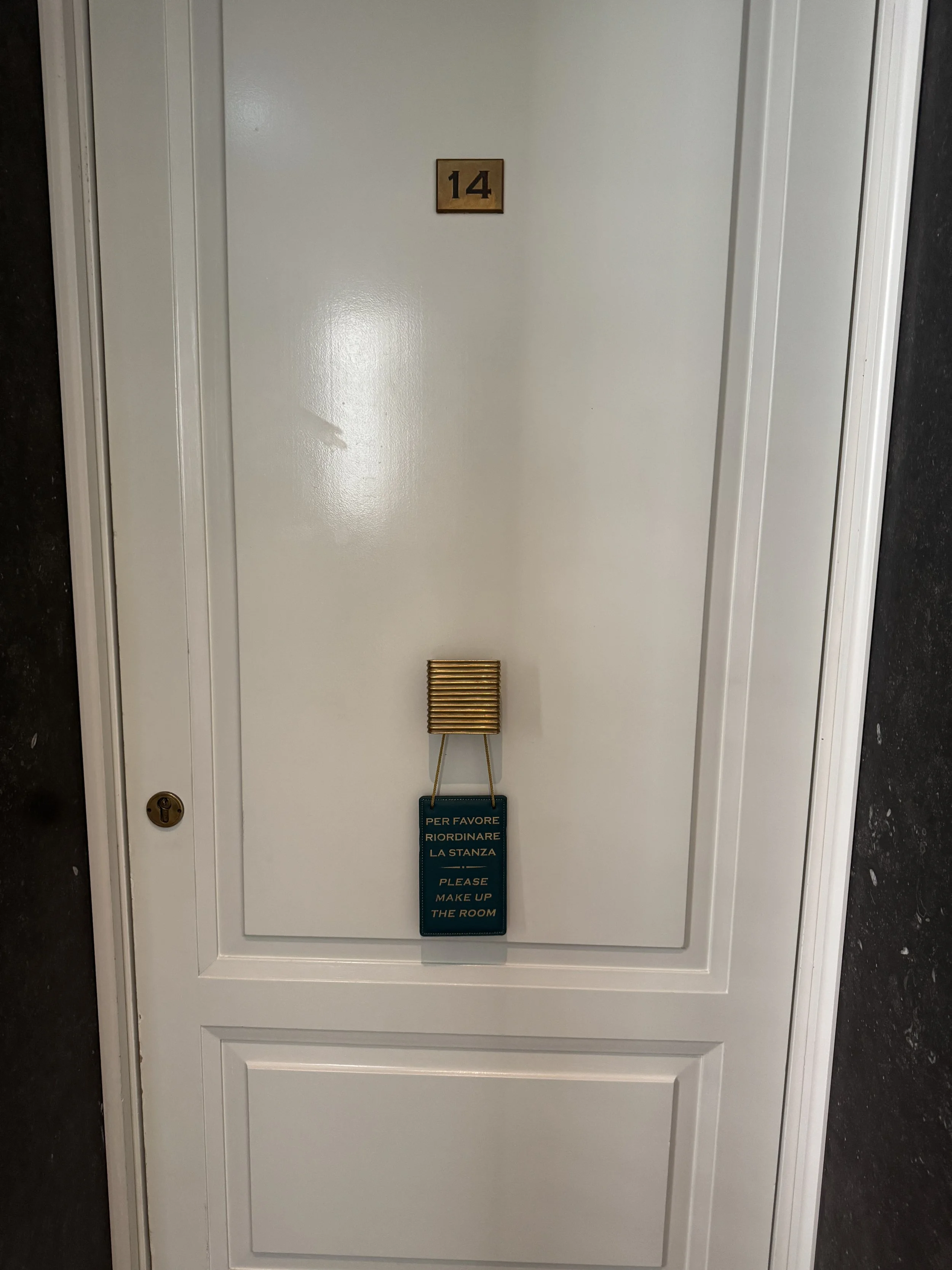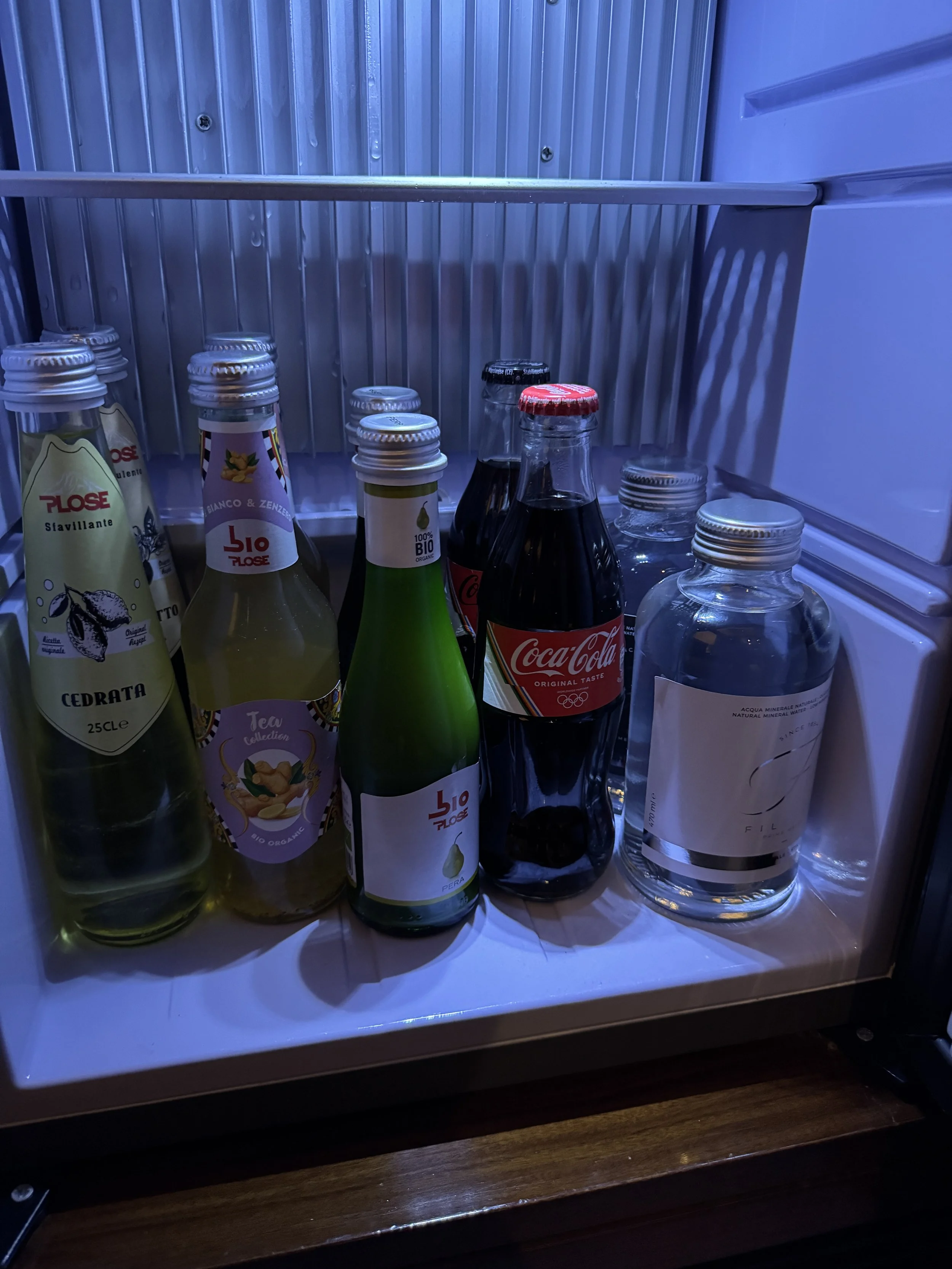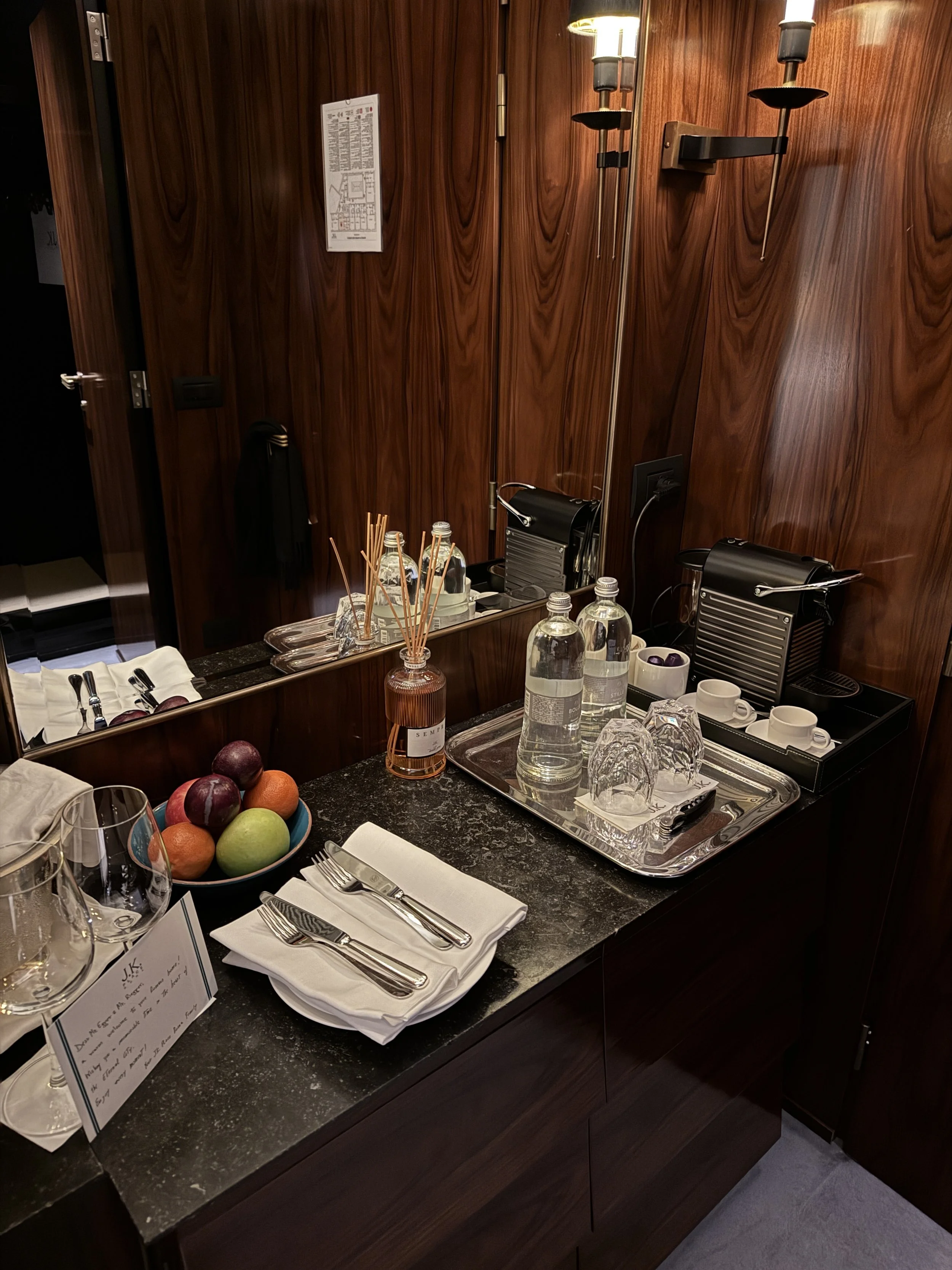 Before we were asked to sign a single document or provide a credit card, two glasses of Chianti Classico from Castello Banfi appeared. Only after enjoying our wine did we complete the formalities and receive personal recommendations from the team. Once finished, we were escorted upstairs to our Deluxe Room on the second floor. We were assigned Room 14, facing Via dell’Arancio — a charming, traffic-free street that remained remarkably quiet throughout our stay. The layout of the room immediately impressed us, particularly the presence of two separate walk-in wardrobes: one fitted with hangers, the other with shelves. It was the first time I had ever stayed in a room offering two distinct dressing areas entirely dedicated to clothing. For travelers who appreciate organization, this is a dream. Directly by the entrance stood a sideboard housing the minibar, a welcome bottle of Prosecco, a beautiful fruit basket, bottled still and sparkling water, and a handwritten note. As with all J.K. Place properties, the entire minibar is complimentary and stocked with high-quality sweet and savory snacks, non-alcoholic beverages by South Tyrolean producer Plose, and gourmet water from Italian brand Filette.