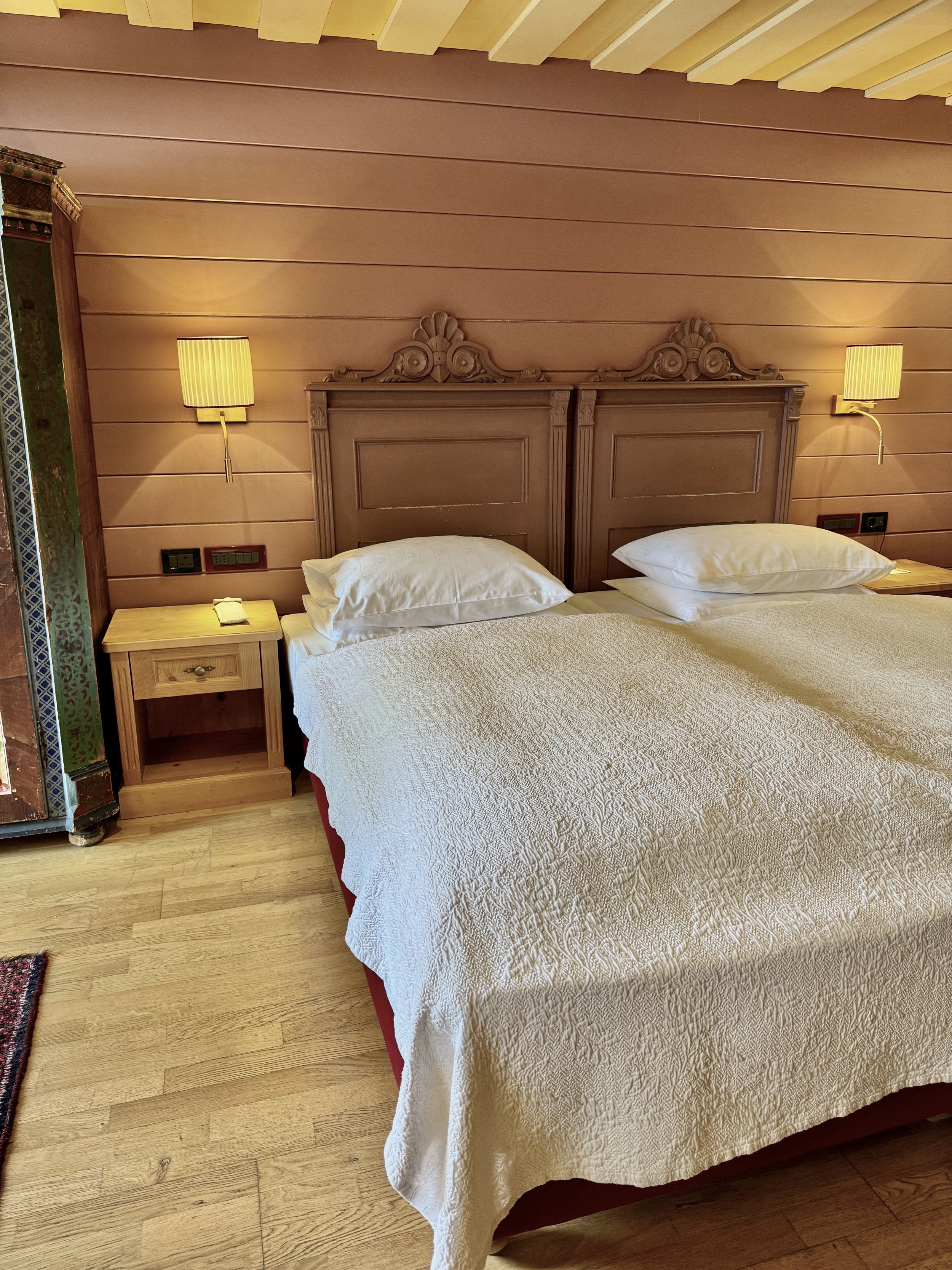 Check-in was very friendly and welcoming, even the General Manager himself arrived to say hello. Soon afterwards a lovely lady from the front desk accompanied us to our room on the first floor and introduced us to the facilities while walking upstairs. Situated on the corner of the hotel, our Comfort room (the hotel’s entry-level category) was South-facing and therefore filled with sunlight which made the arrival even more pleasant. Upon entering, one could tell that the hotel’s traditional approach does not stop at the rooms and suites. Each room is different in a special way and comes with locally made furniture that relates to the region’s traditional design. Our Comfort room was equipped with two single beds but together as a king bed, a seating area with a table and a chair, a wooden box with information material, a wooden wardrobe that had a small safe as well as the built-in wardrobe on the other side. The main highlight of the room was the spacious terrace with a table for two and two sun beds overlooking the surrounding buildings, the slopes as well as the Dolomites. I loved the temperature of the room which was neither too warm nor too cold especially with the sun warming up outside and inside. Overall I would say I found the room extremely comfortable, even though I would never furnish my home this way. However, La Perla has a very traditional and local approach, making the interior design a perfect match. I appreciate this concept and one could really see in the details that the furniture and hardware are not dated at all. There is a flat-screen television, wifi is fast and works perfectly, the lights work properly all over the hotel and the little details are just over the top here.