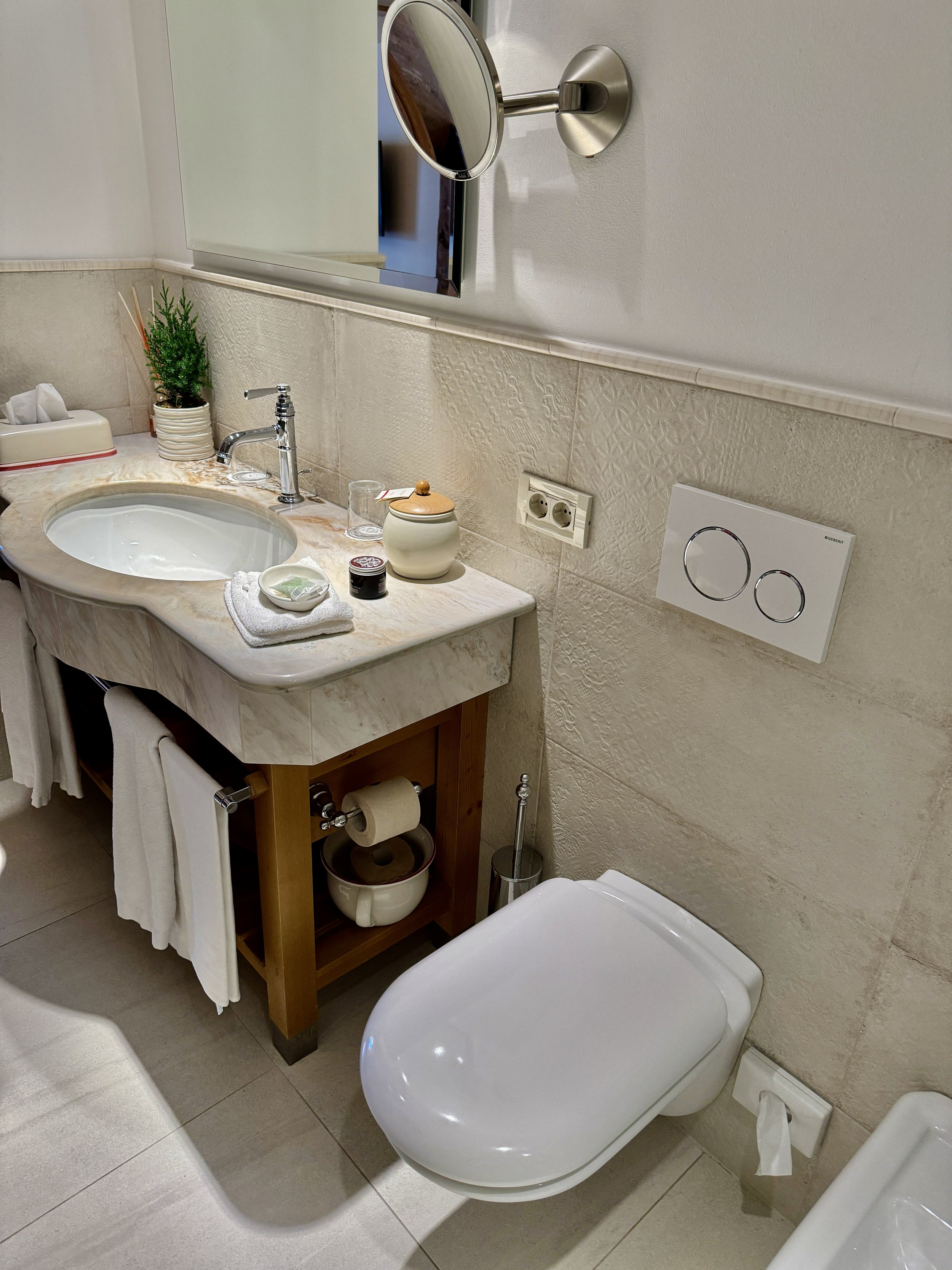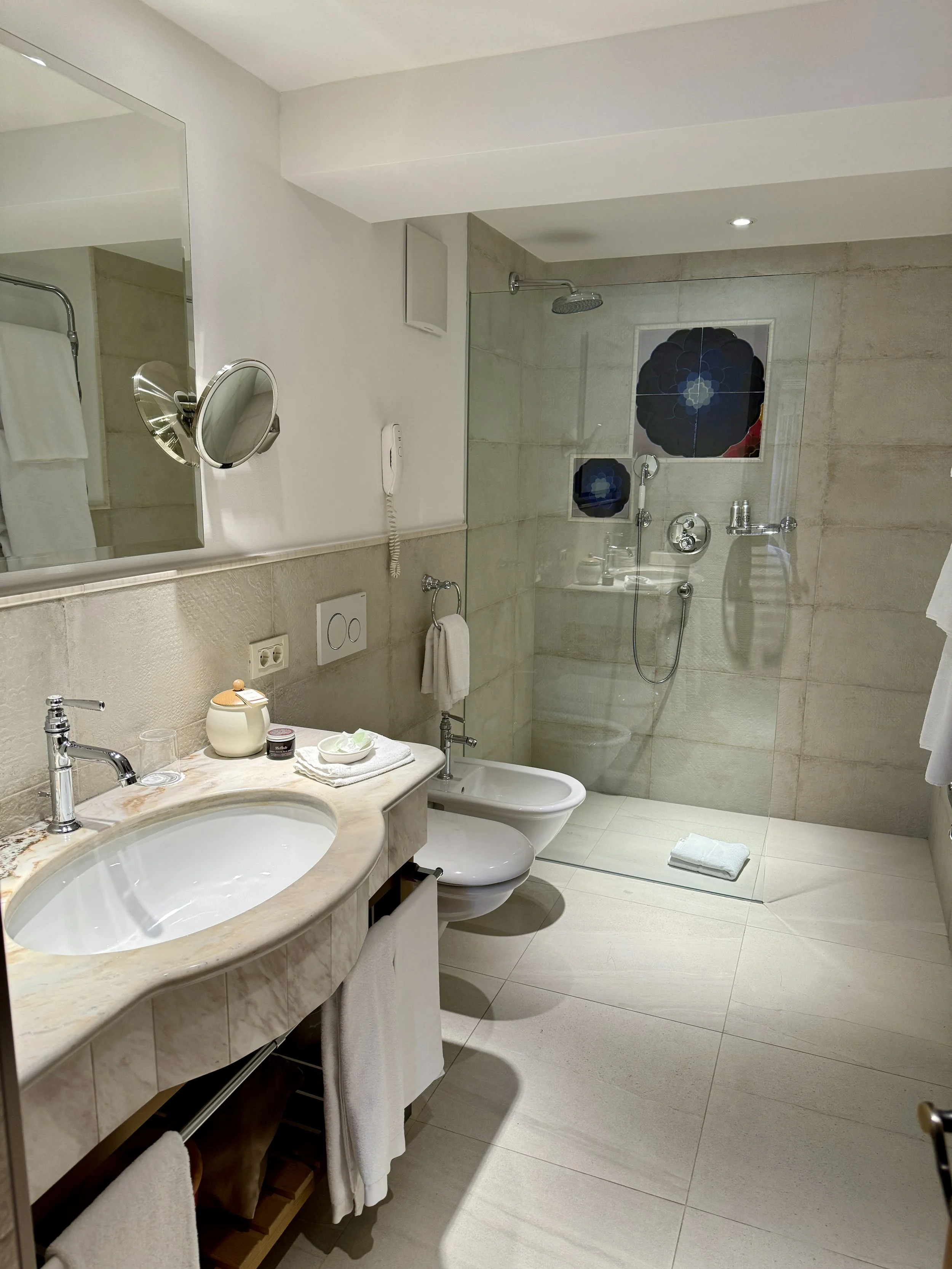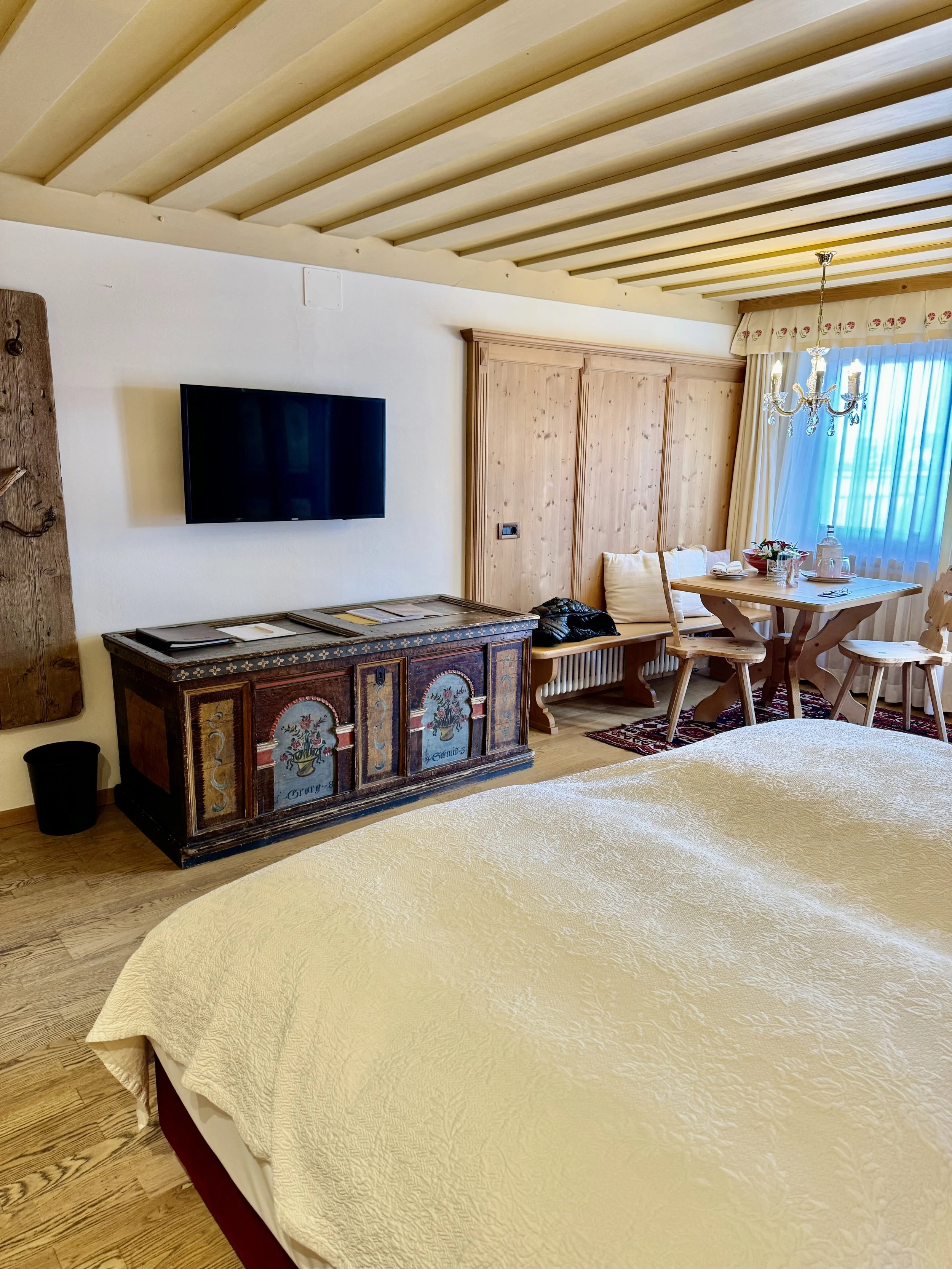 Speaking about the details, we loved the array of welcome amenities consisting of fresh fruits, local delicacies and the pre-ordered sparkling water (via the pre-stay form). Soon after we settled in the room, a bottle of Franciacorta arrived to refresh and toast a wonderful weekend in Alta Badia. Having talked about the traditional look of the room, the recently renovated bathroom is state-of-the-art and comes with a spacious walk-in shower, a single vanity desk along with a toilet and bidet. Even here there were lovely details such as additional toilet paper in an old chamber pot. Apart from the little details I loved the special toiletries that were produced by a local pharmacy and came in hotel-branded containers. The smell was sweet and matched the elegant ambience of the hotel. Housekeeping was excellent all over the property and made sure they were invisible to guests but always cleaned whenever one left the room. The towels were of the highest quality as were the bed sheets and I experienced one of the best sleeps in South Tyrolean hotels so far. One can tell that - despite not looking super expensive - the furniture is all handmade in Italy and of the best quality. Thanks to the dining table we could enjoy a round of chess after dinner and in case you are up for some fresh air or an outdoor lounging session in summer, the private terrace will do the rest for a perfect holiday.