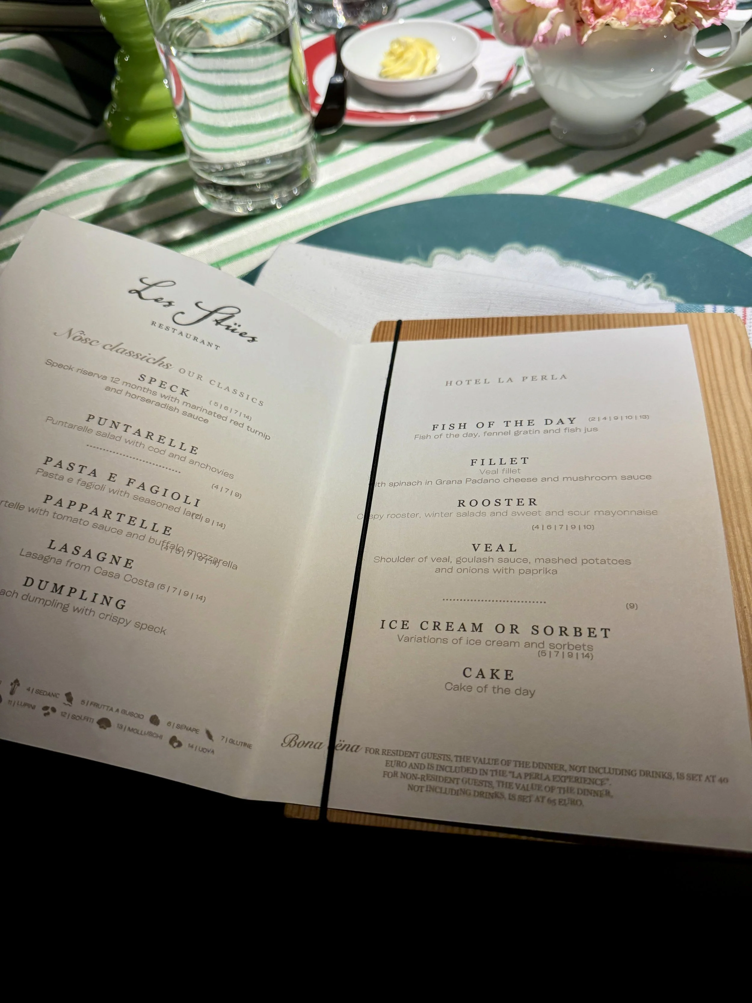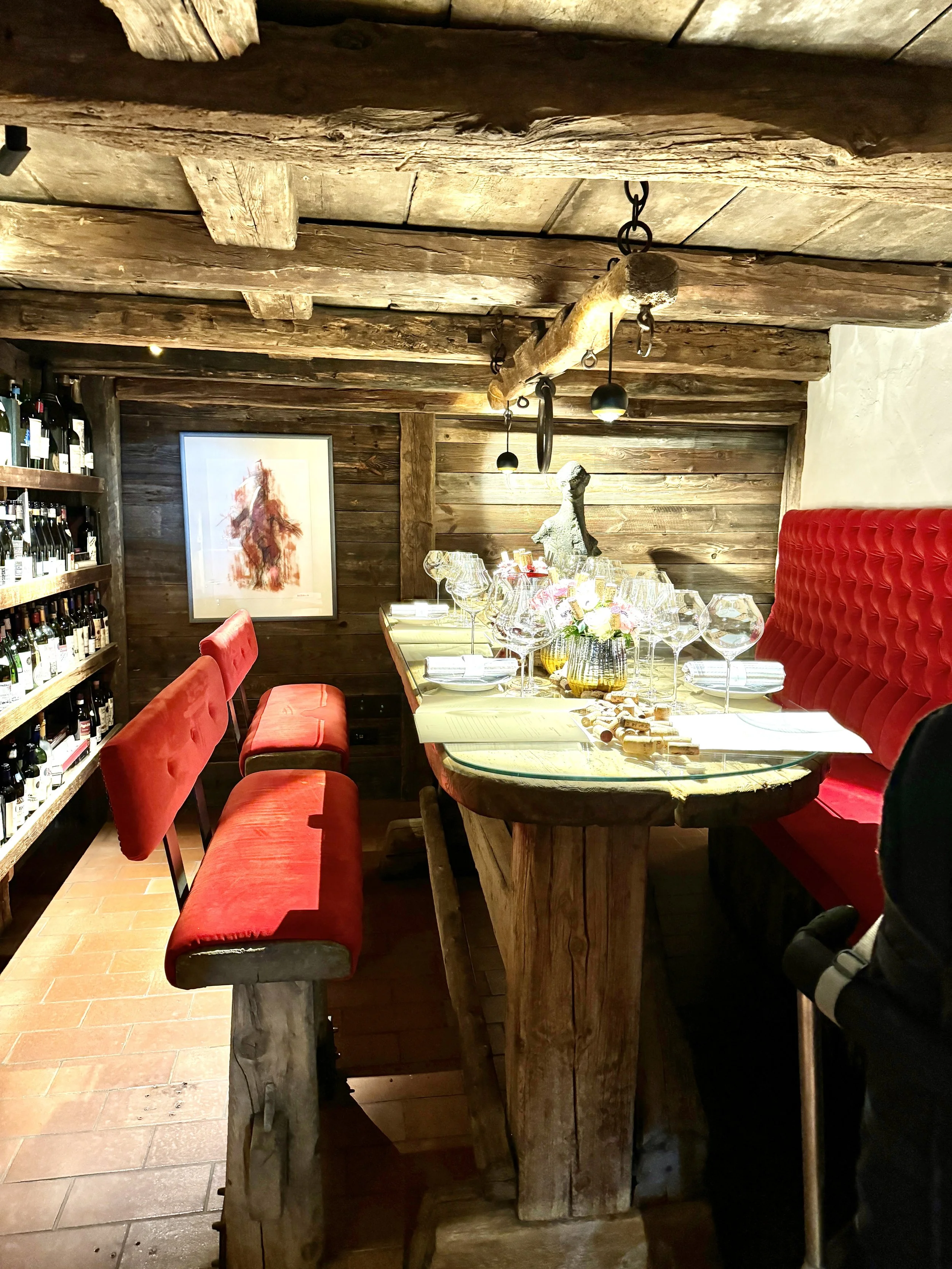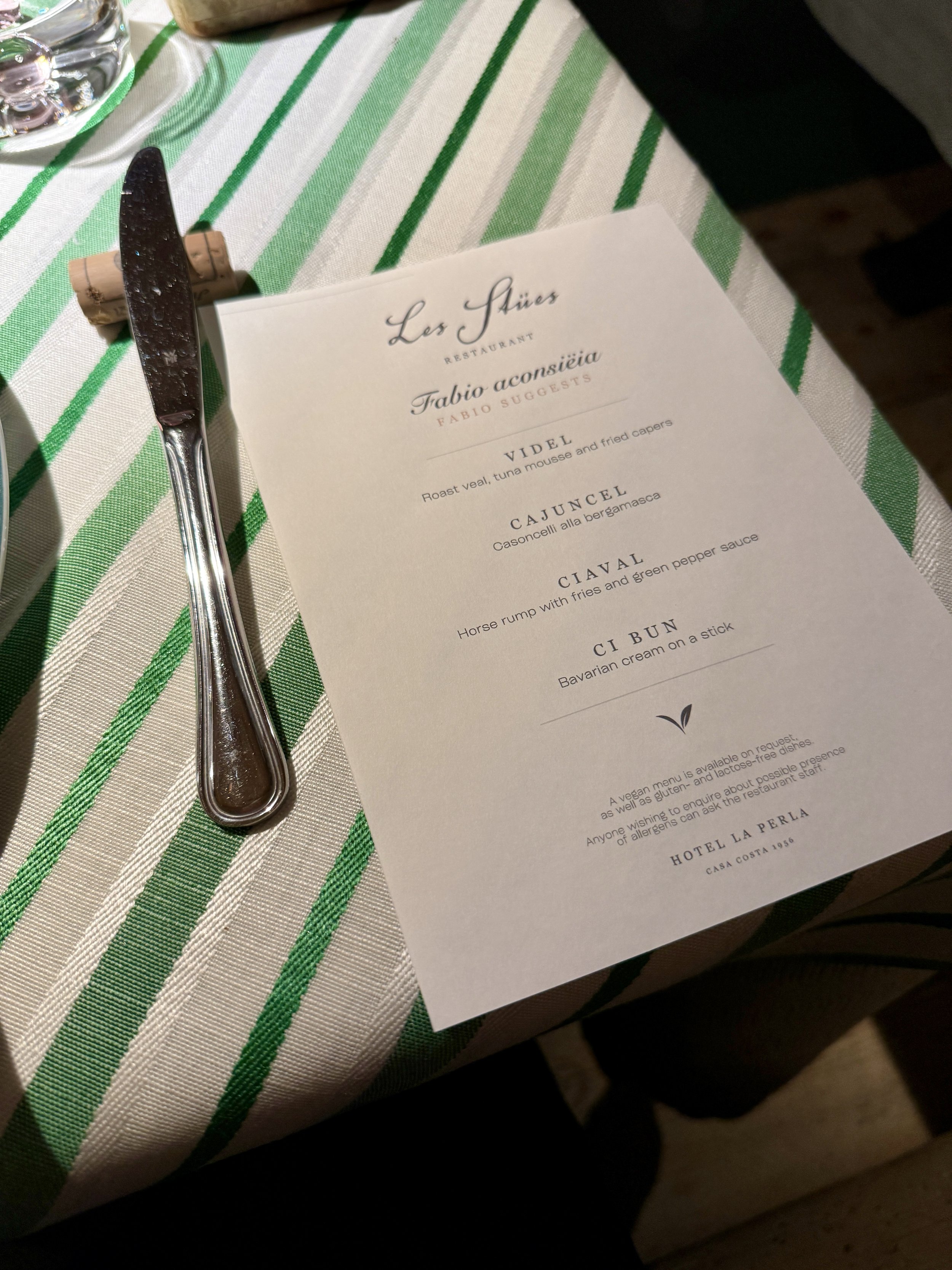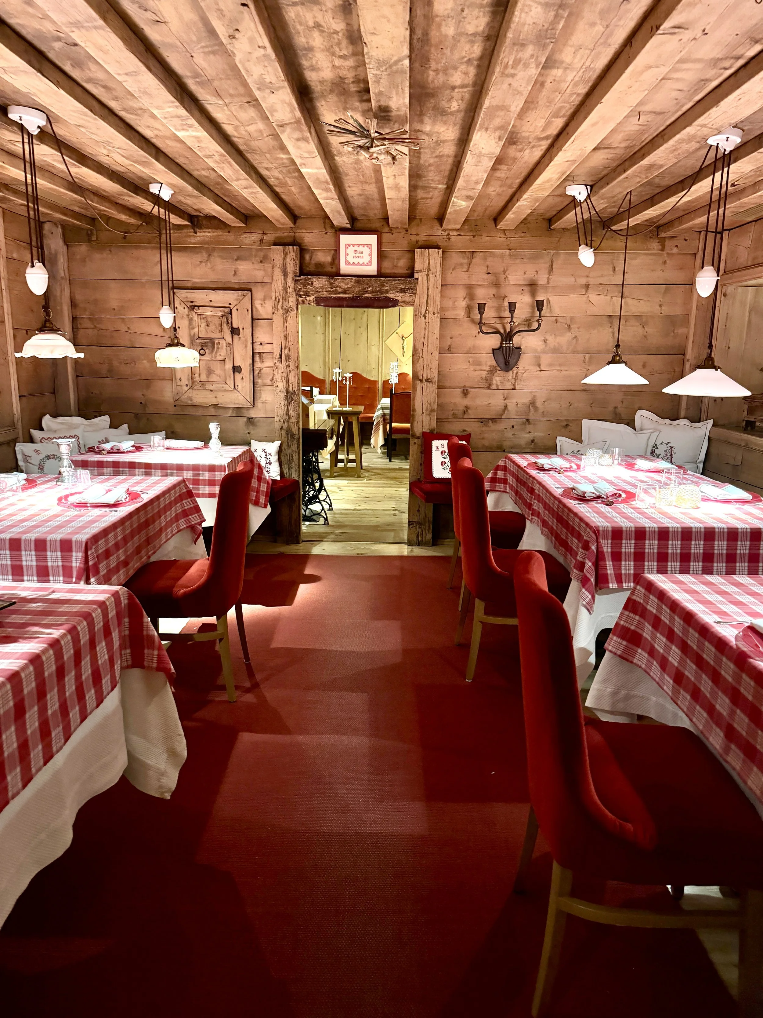 Dinner is usually included in the overnight rates at La Perla and unless you are booked on a special package, you will dine in one of the „Le Stües“ - La Perla‘s main half-board restaurant. Split over several individually designed and furnished chambers, this gives the normally vast dining area a super intimate and cosy feeling. While most hotels in South Tyrol come with a buffet, here the entire four-course menu is served and only an additional salad course can be picked up from a small buffet with high-quality products. Service in the restaurant - under the helm of a lovely maitre - was excellent and very attentive throughout our stay. One can order as many dishes as preferred but let me say that you will most likely not need any additional dishes as the portions are of good size. Needless to mention the food was excellent! No wonder that they hold their Michelin star for their La Stüa de Michil since 2002. In case you would like to order a bottle of wine, they will call out the hotel‘s sommelier who has a very fond knowledge of La Perla‘s massive wine selection. During our both evenings, we had the pleasure to try out some of Italy‘s best wines and amazing vintages. There is no set time for dinner so you can come whenever you feel like having an elegant feast among a superb setting all evening long.