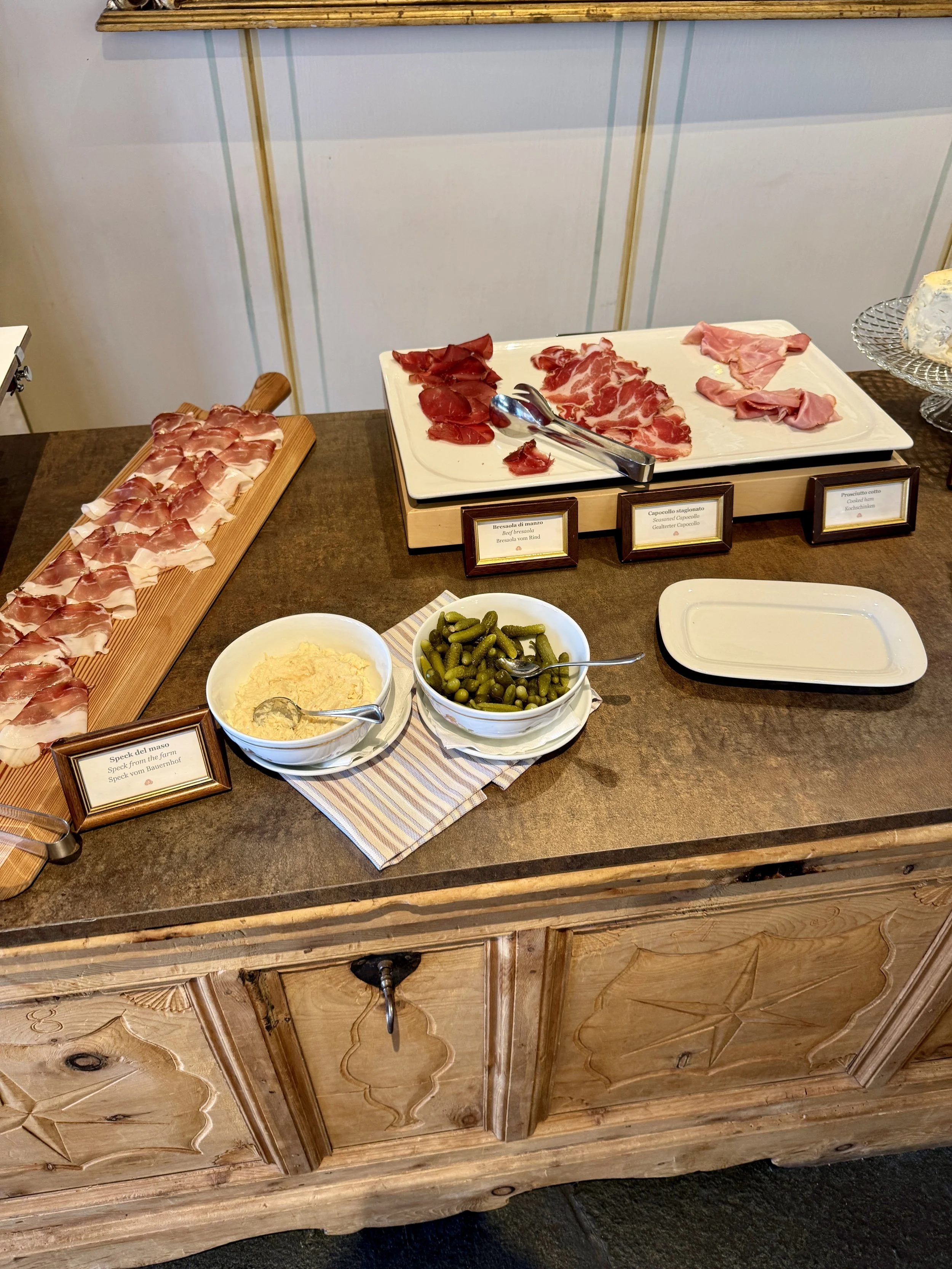 To make the full circuit before the last lift closes, one needs to leave Corvara by 10 am. We did the entire 26km of slopes in just under three hours but paused at three huts including Rifugio Fienile Monte, Emilio-Comici-Hütte and of course the famous Jimmi-Hütte with the Million-Dollar-View of the Sella mountain range. Sitting at Jimmi at the end of the ski day was the best reward for this intensive ski session. So that you have a perfect start (I recommend the clockwise tour from La Perla) and reach the Fienile hut at 1 pm, make sure to have a sumptuous breakfast before you leave. As luck would have it, La Perla has a sumptuous buffet in a separate breakfast room (one would wonder where they have all the space from). While some a la carte dishes are complimentary, others such as Avocado Toast and Eggs Benedict come with a surcharge (something I really cannot understand given there were two cooks behind the window who didn‘t seem to have any work to do). For a member of the Leading Hotels of the World, one should have the privilege of a complimentary Egg Benedict for breakfast, especially in such an elegant and upscale environment as La Perla has it. Service at breakfast was kind though not on par with the superb dinner shift of the hotel. All offered products on the buffet were of the highest quality and tasted excellent. I loved the freshly squeezed orange juice as well as the selection of local cold cuts and cheese along with an excellent bread selection.