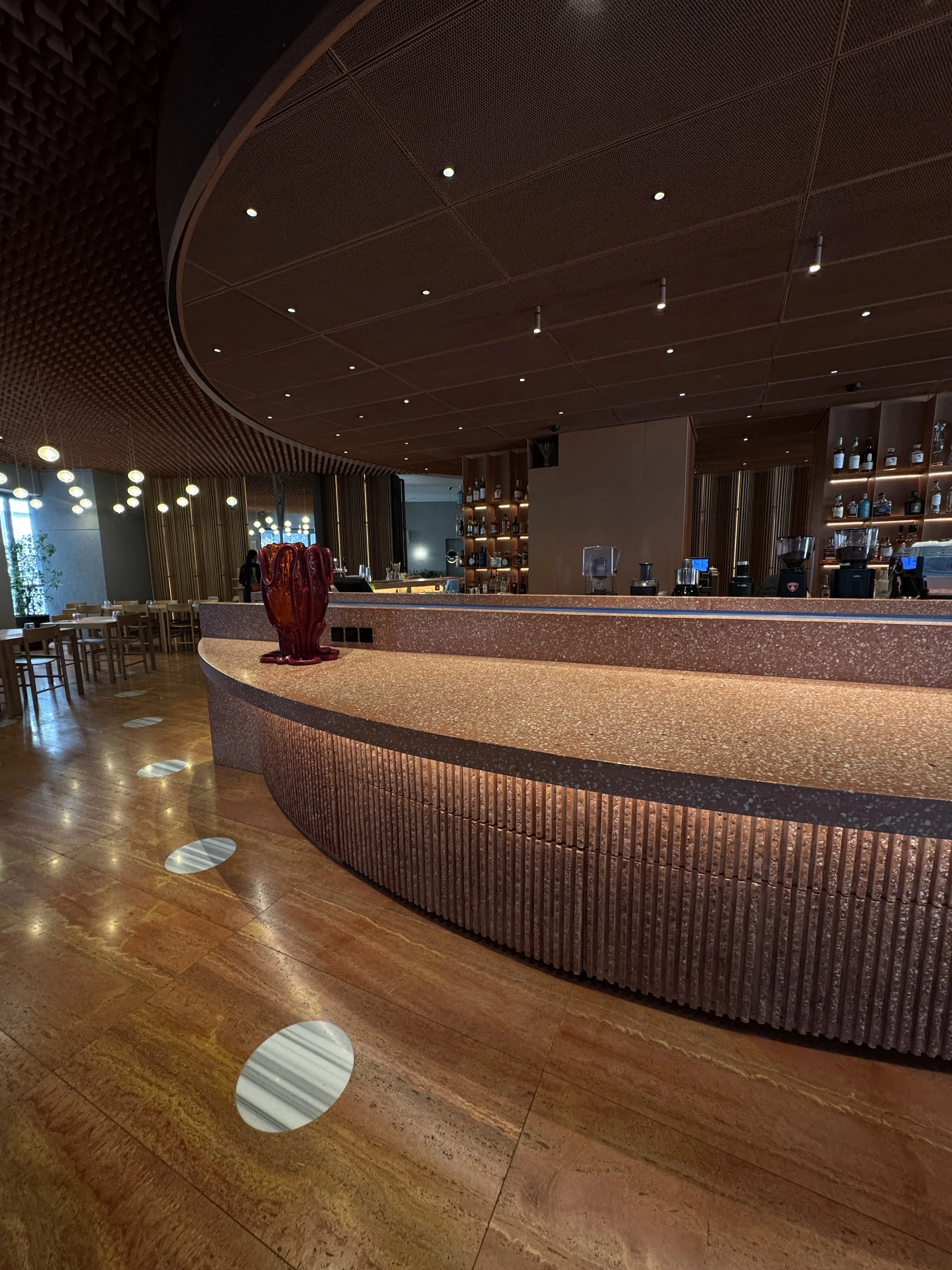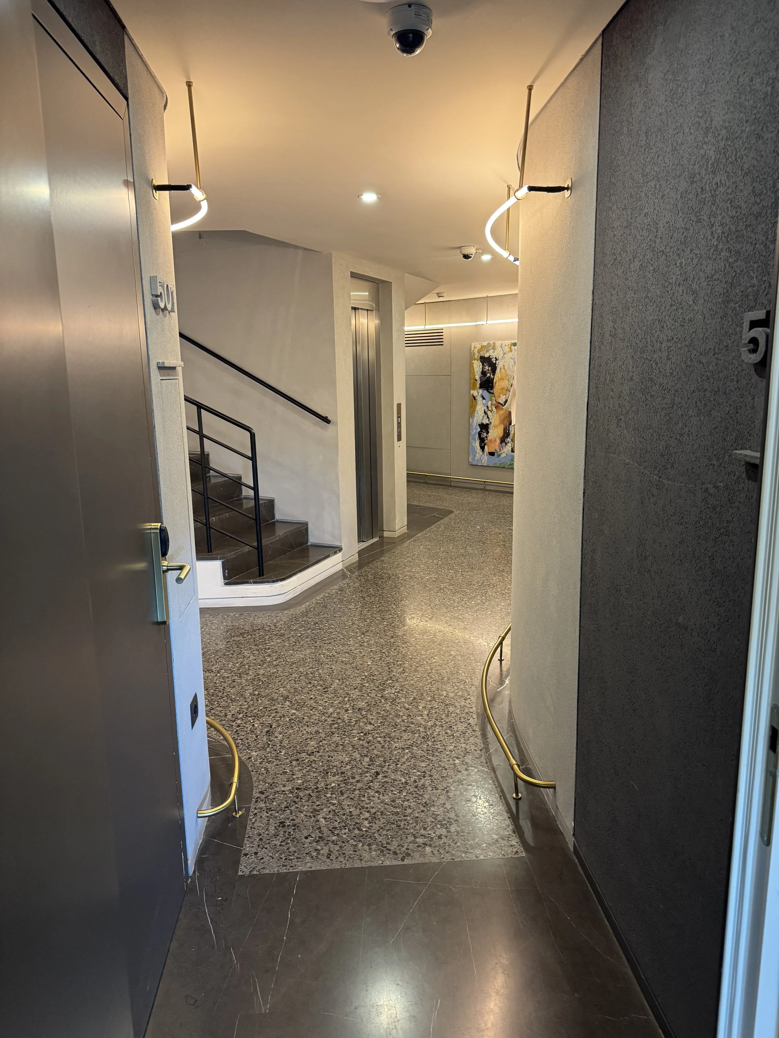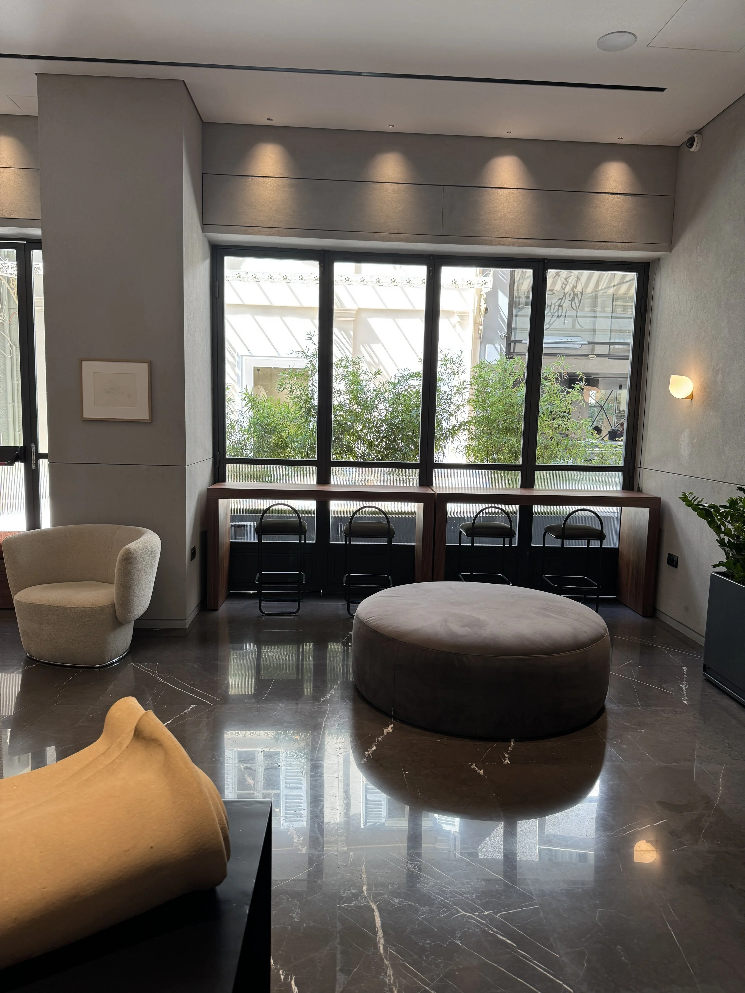 Beyond the rooms, Perianth Hotel embodies a spirit of understated design luxury. The Bauhaus-inspired architecture and interiors by the Greek design studio K-Studio strike a perfect balance between elegance and minimalism. Terrazzo floors, smooth lines, and warm lighting create a space that feels both contemporary and timeless. The lobby doubles as a stylish lounge, attracting locals and guests alike for afternoon drinks or pre-dinner cocktails. Throughout the property, curated artworks from Greek and international artists add a creative touch — subtle yet engaging. For those who like to stay active, there’s even a small but well-equipped gym — a thoughtful addition for a boutique hotel of this size. Location-wise, Perianth couldn’t be better positioned. Nestled between Monastiraki and Syntagma Square, everything from the Acropolis to Plaka, the Parliament, and countless cafés is within easy walking distance. We spent our evening strolling to the Grande Bretagne Hotel for a sunset drink before heading to our favorite rooftop restaurant in the city, NYX Rooftop, for dinner with breathtaking views.