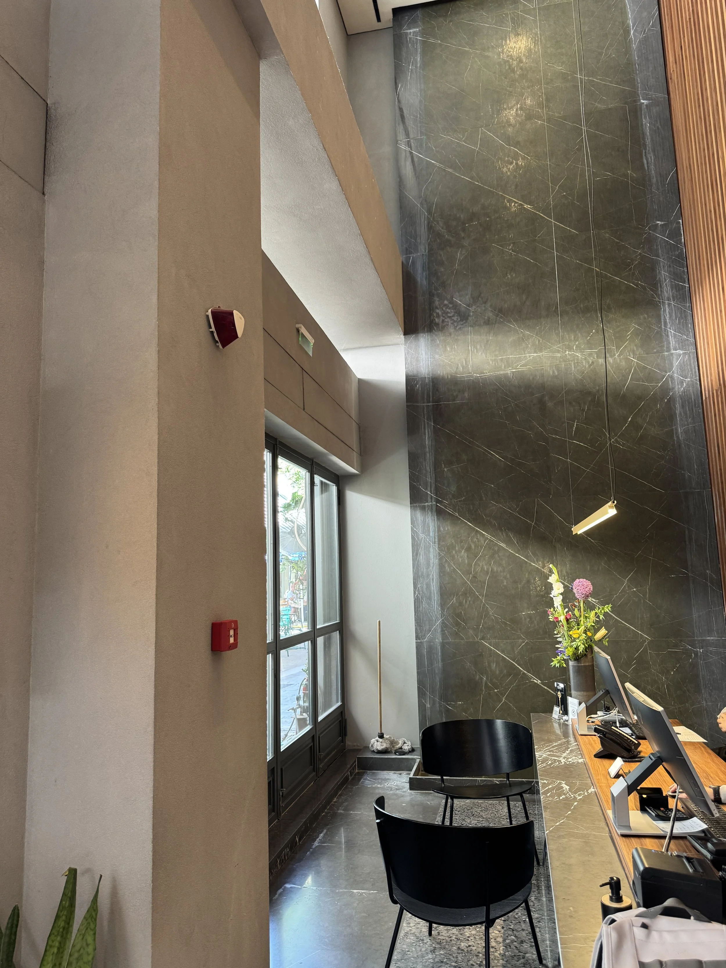 Athens is always worth a visit. Whether for a spontaneous autumn weekend, a week-long spring holiday exploring the surroundings, or simply a stopover before island-hopping across the Aegean, the Greek capital never loses its appeal. This time, our journey began right in the vibrant heart of Athens’ old town — at the Perianth Hotel, a boutique design hideaway that blends modernist cool with authentic local flair. Despite being located in the middle of it all, the hotel’s surroundings are unexpectedly calm yet effortlessly stylish — with small cafés, lively bars, and excellent restaurants within steps. We arrived by car and were dropped off in a tiny one-way street, slightly confused at first as there were no obvious hotel signs. It was the first day of our holiday, so we took it with a smile, opened Google Maps, and discovered the hotel was only a few steps up the pedestrian street in front of us. That short detour brought us to the charming Erinis Square, a cozy pocket of local life with outdoor tables belonging to the hotel’s Anther Restaurant — a perfect spot for an afternoon drink or a casual dinner under the Athenian sky. Just around the corner, the discreet main entrance led us to the small reception area where we were warmly welcomed and efficiently checked in. Within minutes, we had our keys and were shown the way to the elevators. Boutique hotels in Athens often have an intuitive layout, and Perianth is no exception — effortless, friendly, and relaxed from the very first moment.