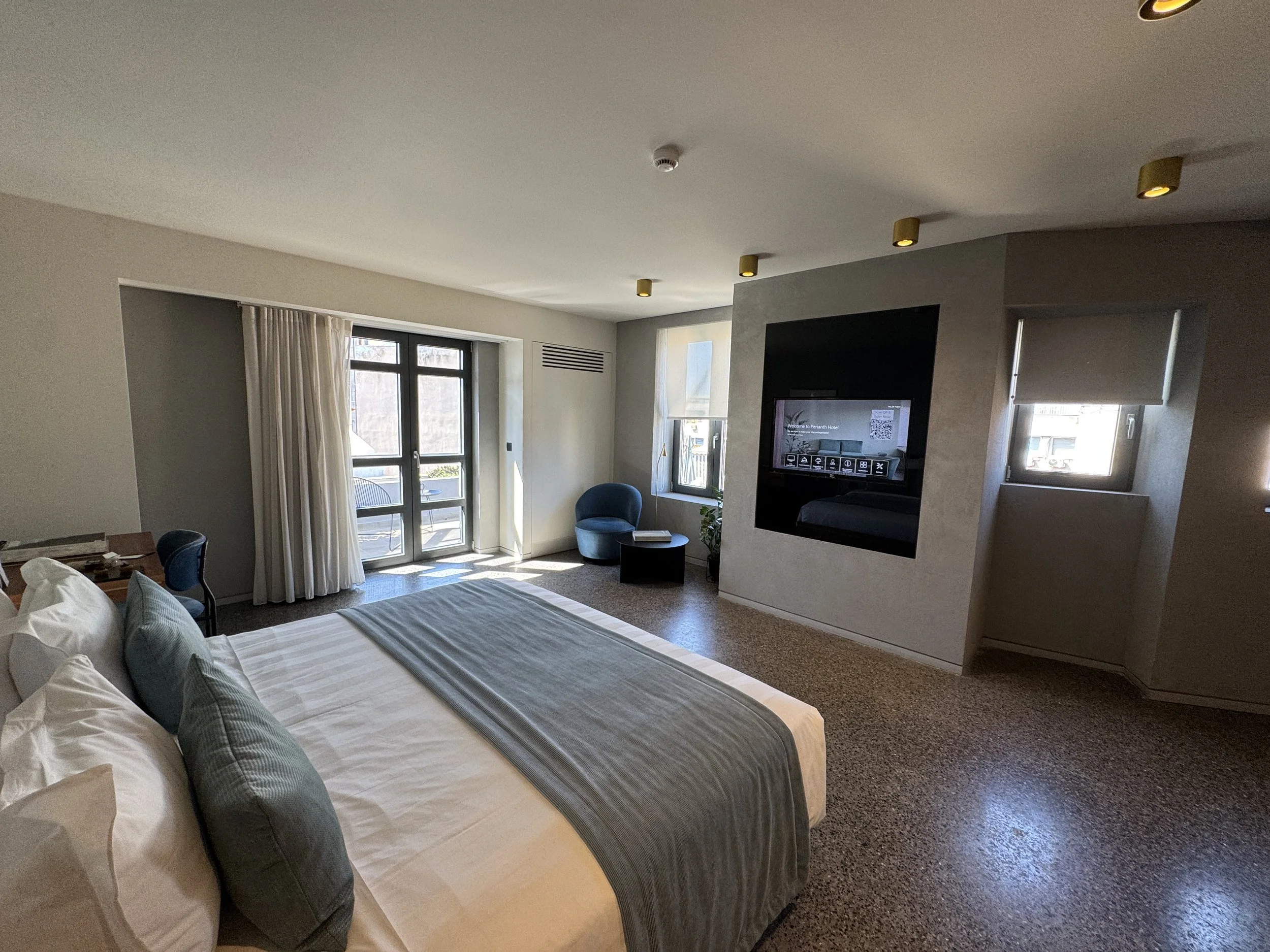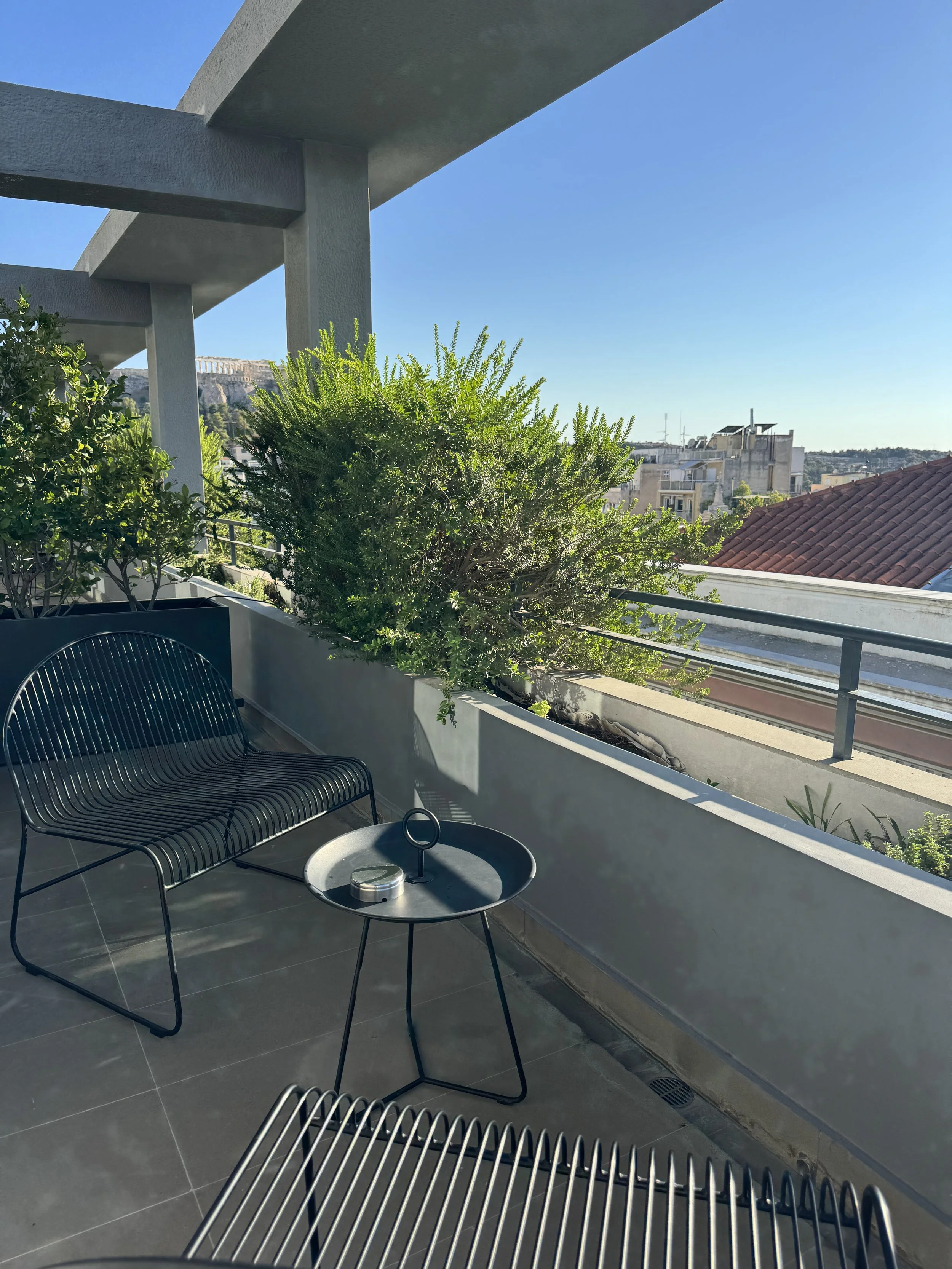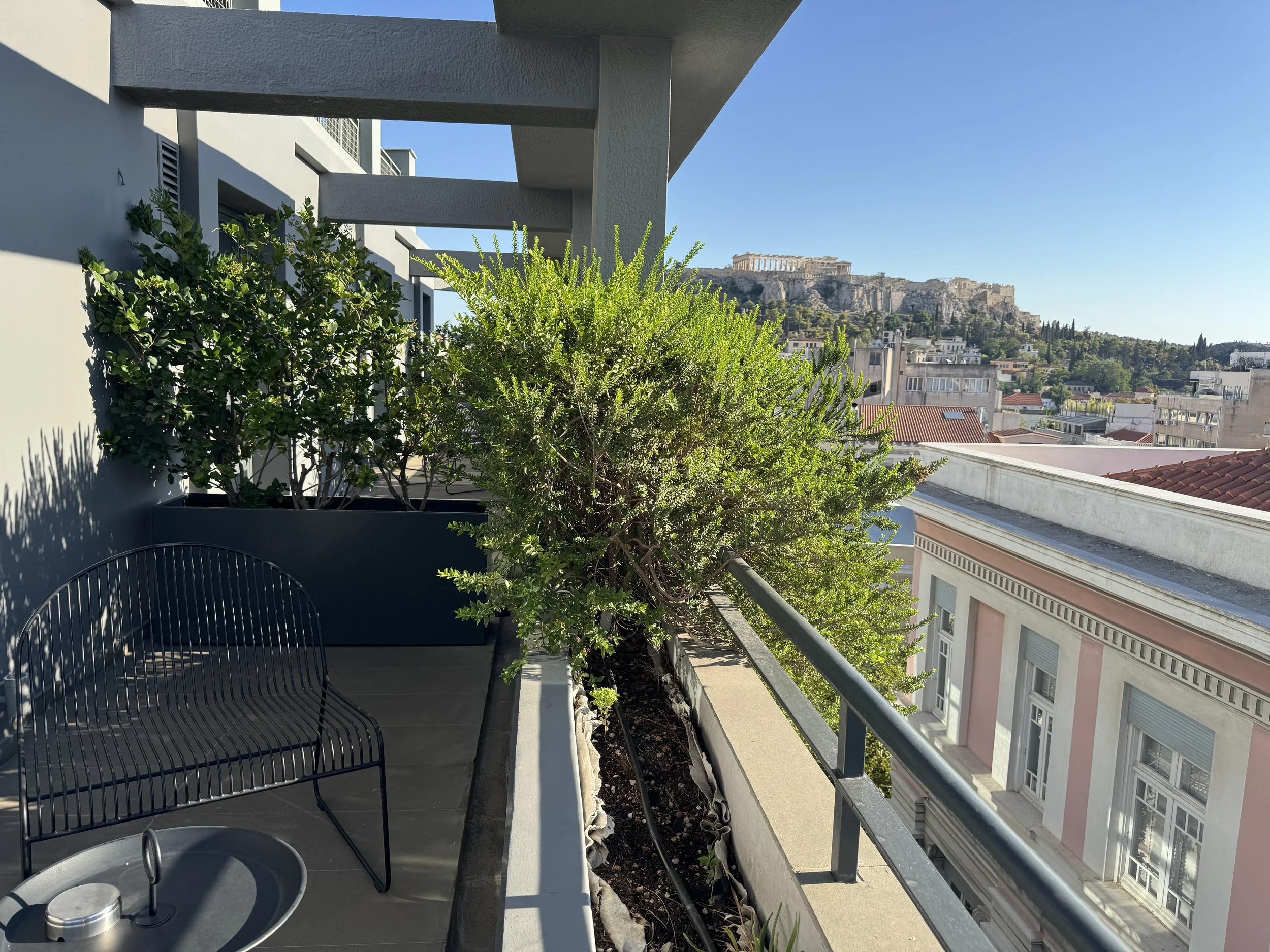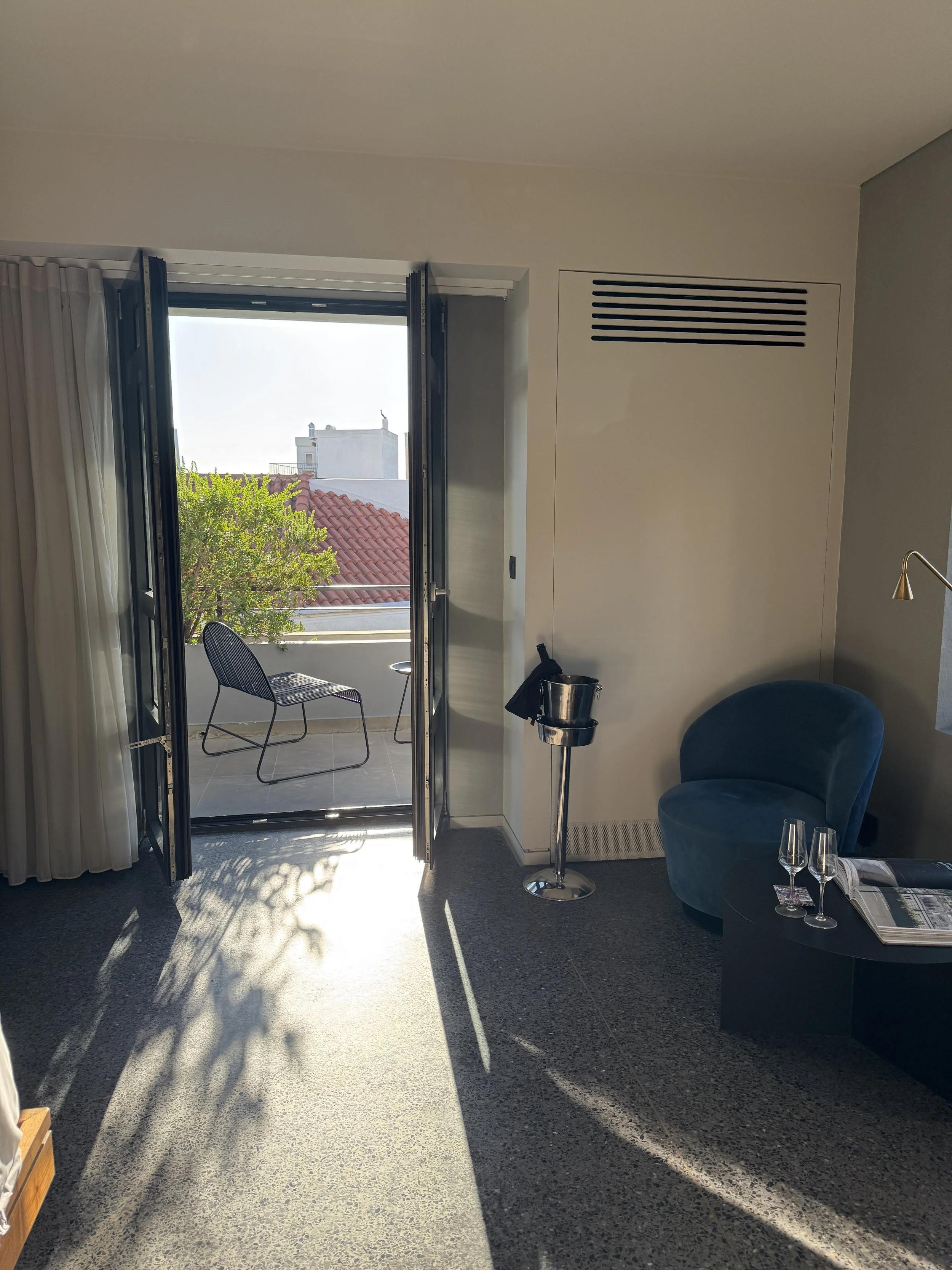 What makes Perianth Hotel special is not just its design or location — it’s the way these elements come together to create an atmosphere that feels both elegant and effortless. From the warm welcome and thoughtful amenities to the silence of the night and the beauty of that terrace view, everything felt in harmony. The service was genuine and discreet, the architecture quietly stunning, and the experience unmistakably Athenian. Even during the hottest days, the terrazzo-floored interiors remain cool and refreshing, providing a calm retreat from the vibrant energy of the city. If you have the chance to splurge, go for Room 600 — the Penthouse Suite. With its private jacuzzi, panoramic rooftop terrace, and a full-size bar, it’s no wonder this suite is often used for fashion shoots and weekend getaways by local insiders. For most travelers, though, the Junior Suite with Acropolis View hits the perfect balance — spacious, serene, and undeniably stylish. Perianth Hotel embodies what modern Athens is all about: design, culture, light, and effortless hospitality. It’s not just a place to sleep, but a place to feel the rhythm of the city — calm above the chaos, and unmistakably Greek.