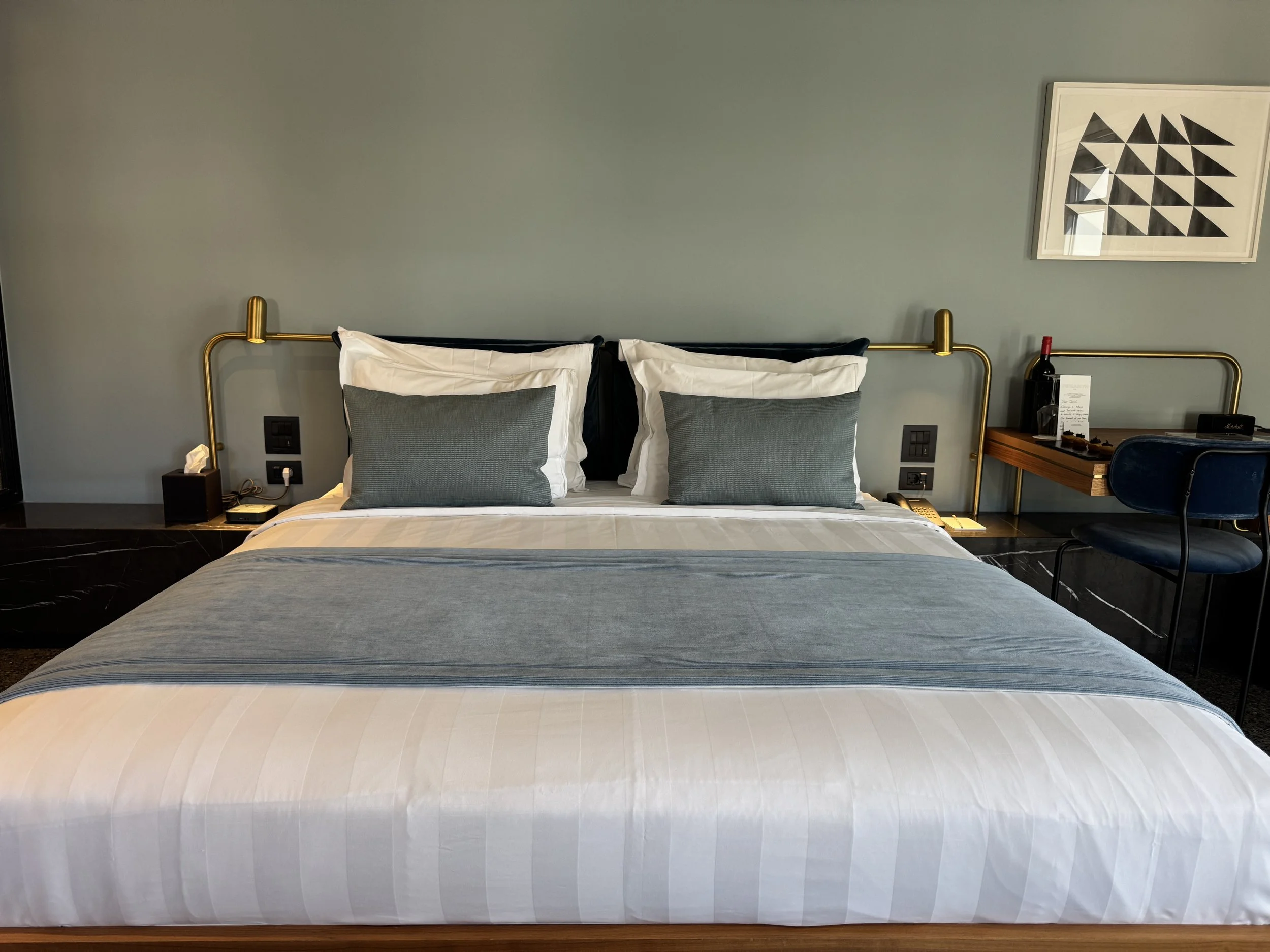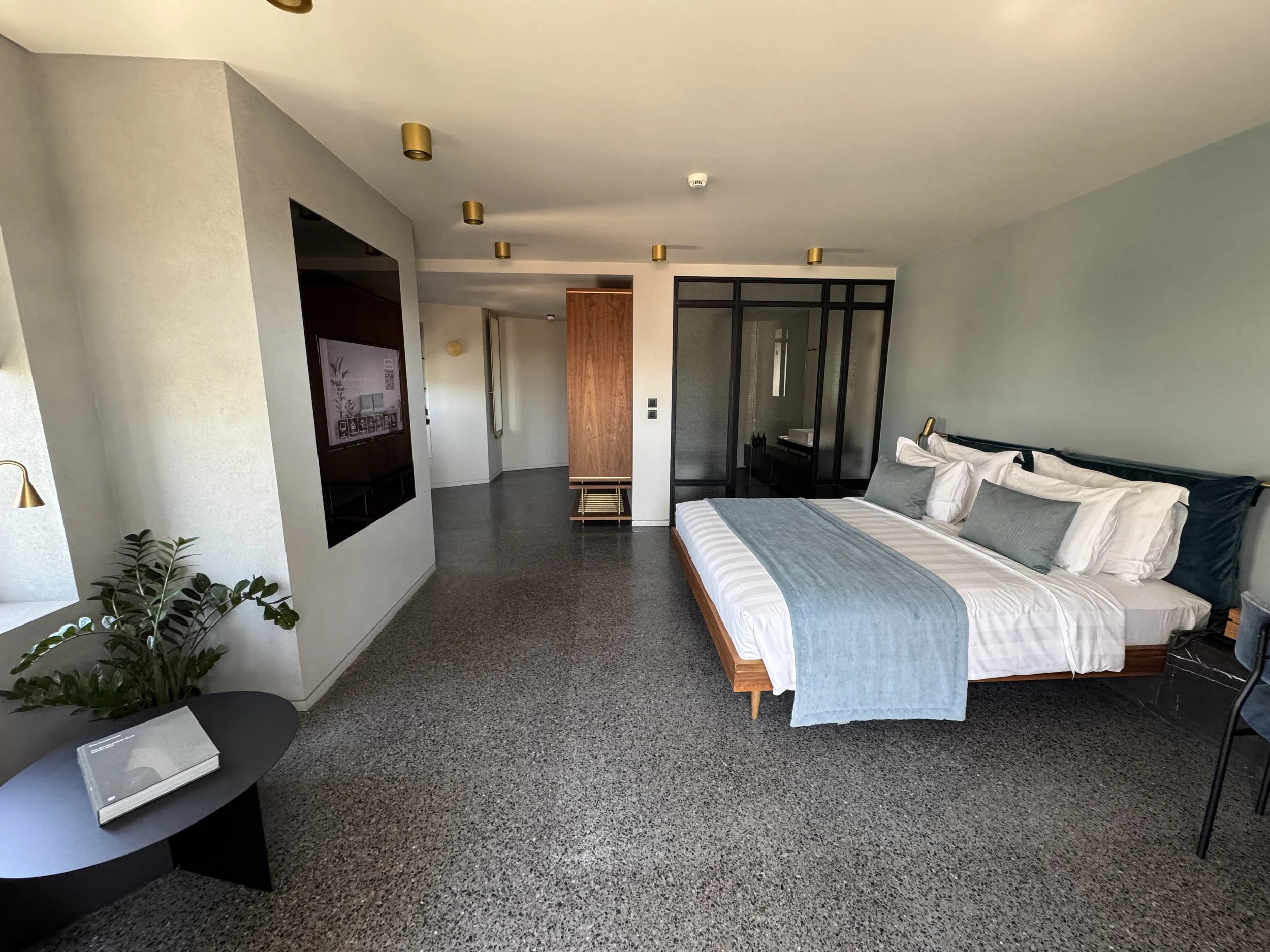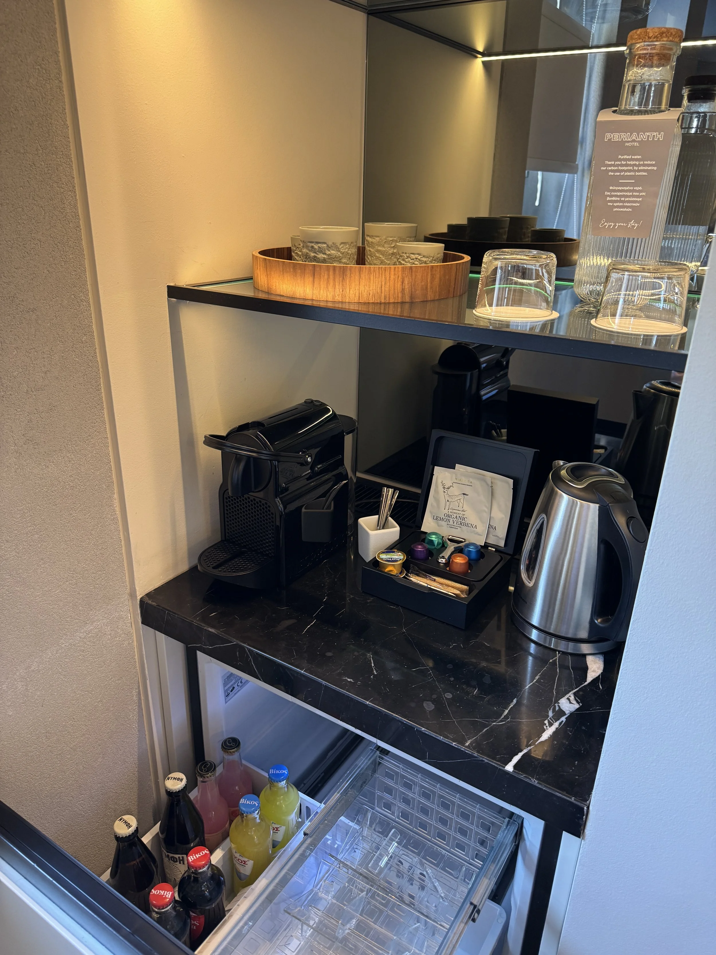 Inside, thoughtful details made the suite feel both personal and polished. A handwritten welcome note and a small selection of Greek sweets awaited us on the writing desk — small gestures that truly make a difference. The bathroom, located opposite the bedroom, was beautifully designed: spacious, bright, and equipped with a huge walk-in shower and a large vanity desk. Toiletries were from Grown Alchemist, a high-end natural brand whose scent filled the space with understated sophistication. There was also a complete range of guest amenities — from a toothbrush set to shaving kits — meaning you could forget half your toiletry bag and still be perfectly fine. One detail that deserves praise is the in-room ordering system via the television. Curious, I decided to test it and ordered a bottle of rosé sparkling wine. To my surprise, it was delivered to our room within twenty minutes, without any service charge. It’s rare to see such efficiency and integration work so seamlessly in a boutique property. Despite its central location, the soundproofing at Perianth Hotel was exceptional. Our suite remained perfectly quiet throughout the night — a true luxury in a city as lively as Athens. Having previously stayed in a nearby hotel on a busy street, this peaceful night’s sleep was a pleasant revelation.