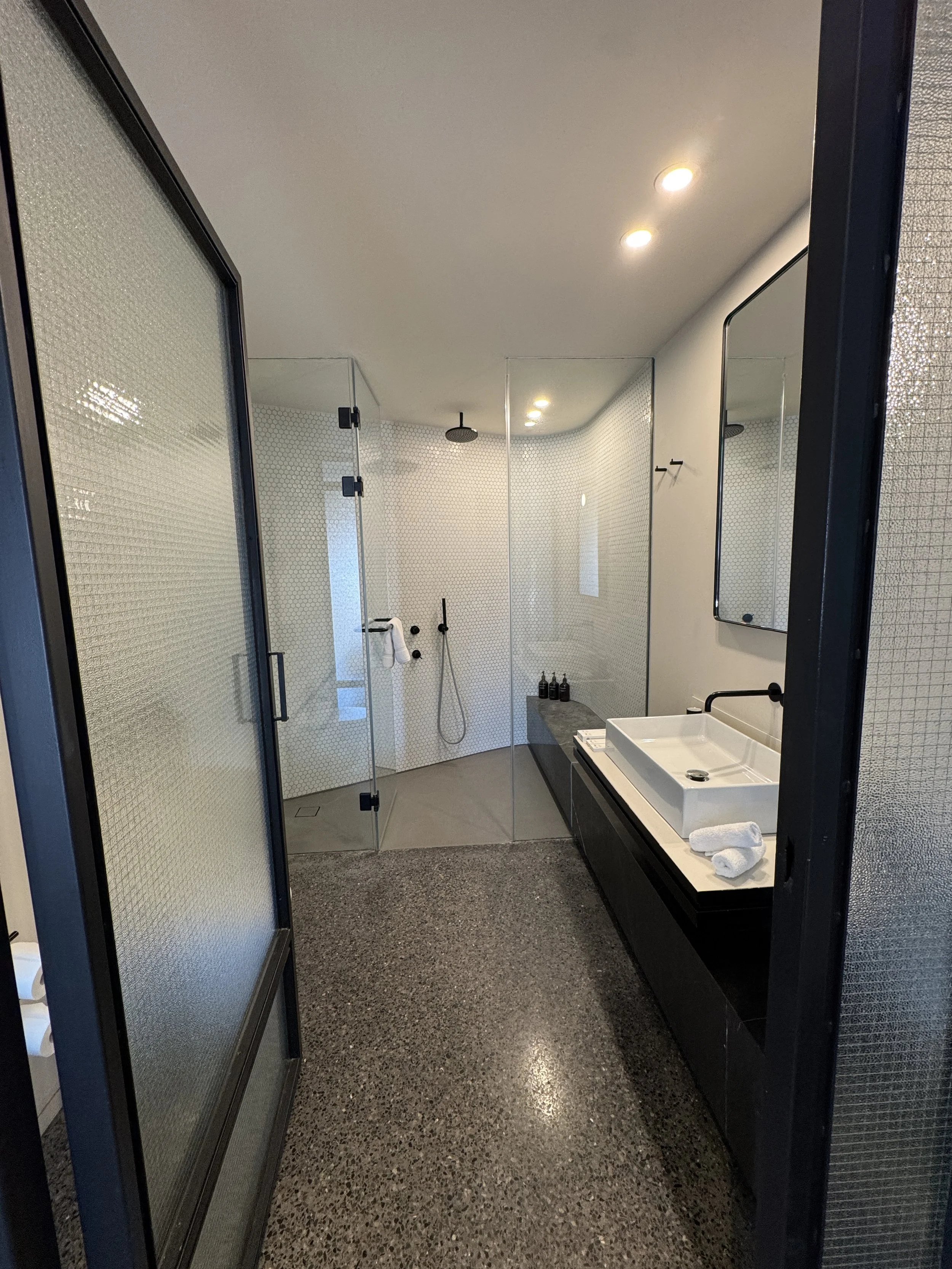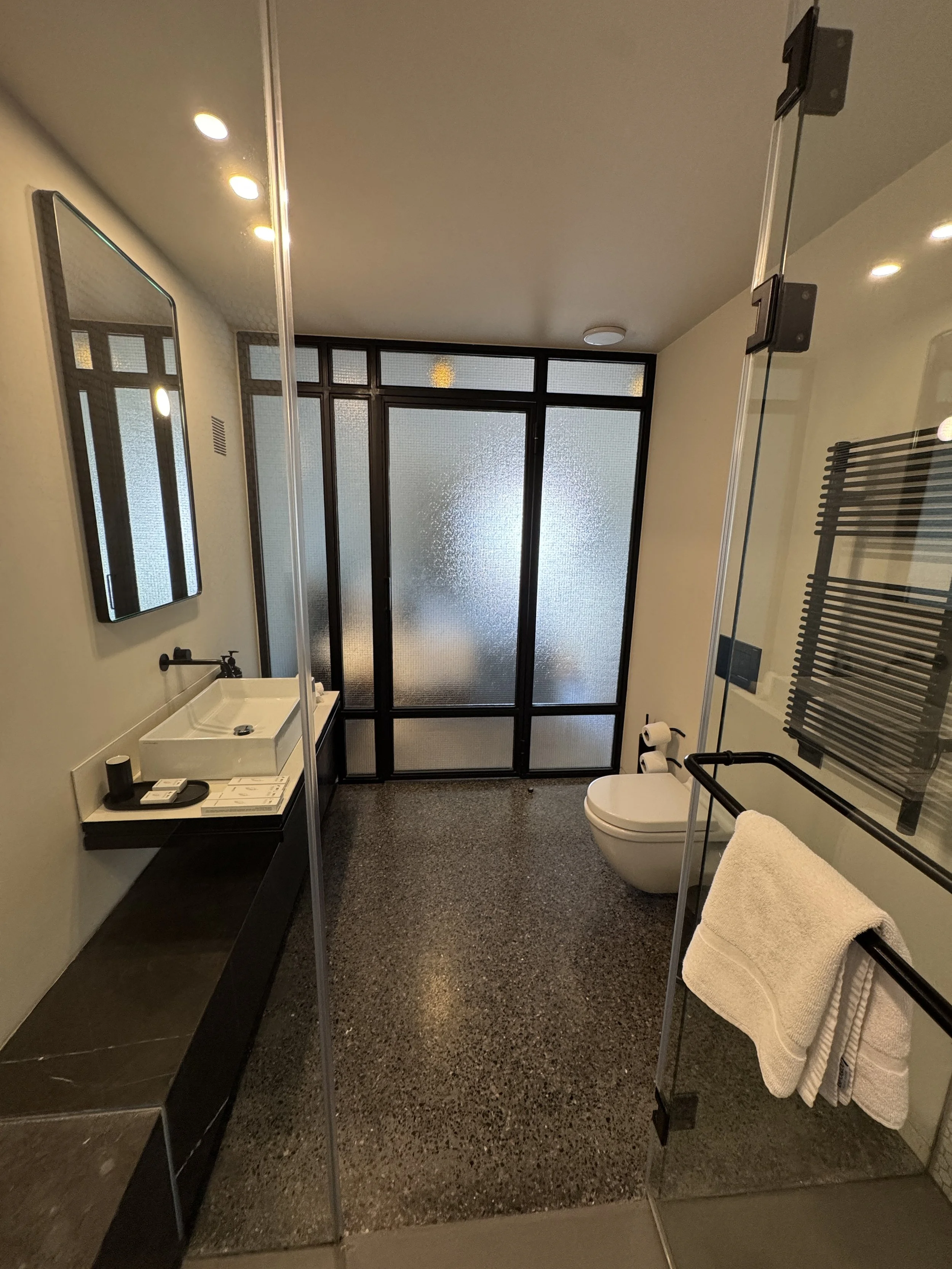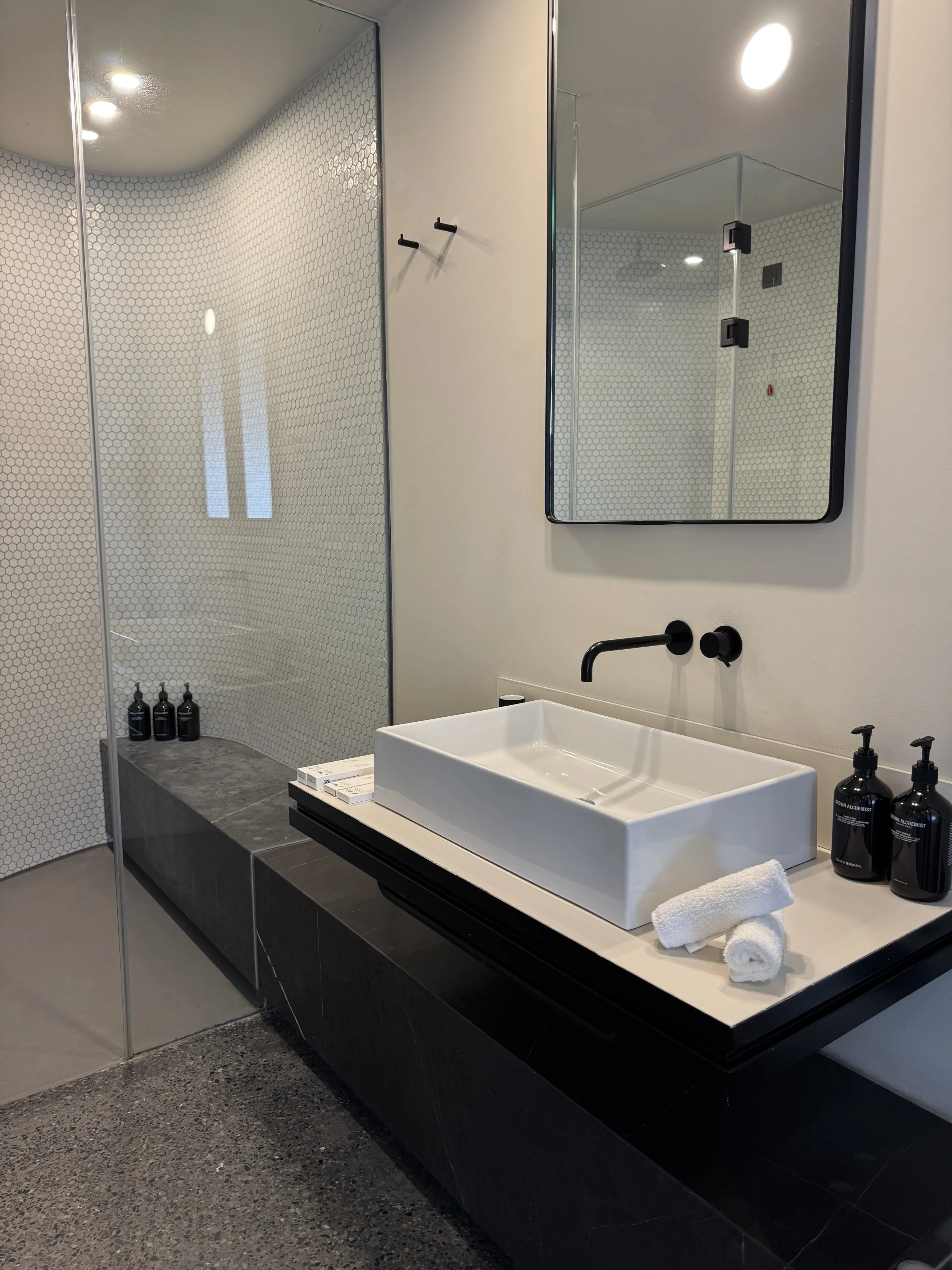 Inside, thoughtful details made the suite feel both personal and polished. A handwritten welcome note and a small selection of Greek sweets awaited us on the writing desk — small gestures that truly make a difference. The bathroom, located opposite the bedroom, was beautifully designed: spacious, bright, and equipped with a huge walk-in shower and a large vanity desk. Toiletries were from Grown Alchemist, a high-end natural brand whose scent filled the space with understated sophistication. There was also a complete range of guest amenities — from a toothbrush set to shaving kits — meaning you could forget half your toiletry bag and still be perfectly fine. One detail that deserves praise is the in-room ordering system via the television. Curious, I decided to test it and ordered a bottle of rosé sparkling wine. To my surprise, it was delivered to our room within twenty minutes, without any service charge. It’s rare to see such efficiency and integration work so seamlessly in a boutique property. Despite its central location, the soundproofing at Perianth Hotel was exceptional. Our suite remained perfectly quiet throughout the night — a true luxury in a city as lively as Athens. Having previously stayed in a nearby hotel on a busy street, this peaceful night’s sleep was a pleasant revelation.