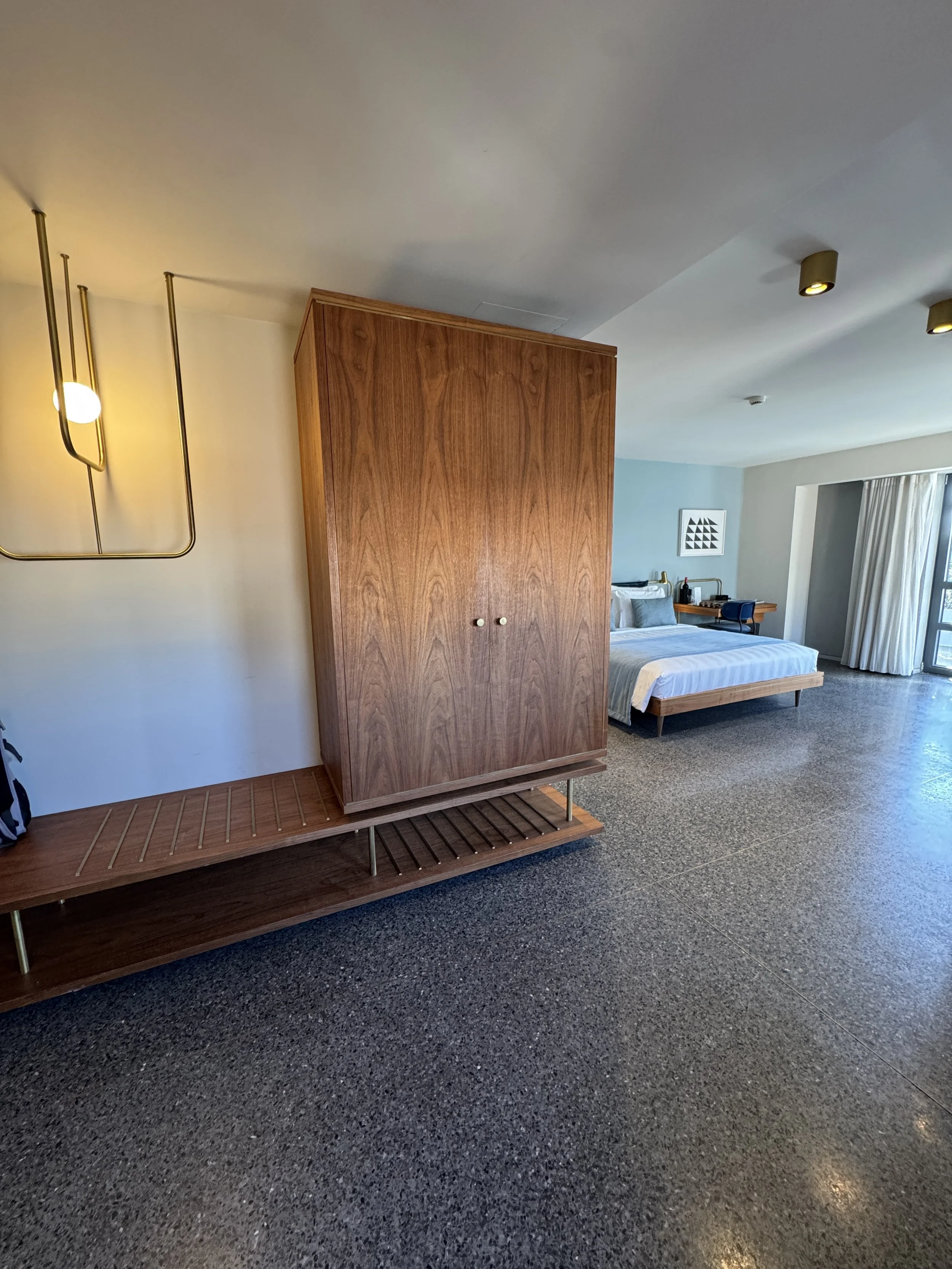 Our Junior Suite was located on the fifth floor, just beneath the hotel’s exclusive penthouse — the only room on the sixth floor. As soon as we entered, we were greeted by a long hallway that instantly gave the space a residential feel. On the left, a large wardrobe provided ample storage, while to the right, a stylish bar area featured a Nespresso coffee machine and a complimentary minibar stocked exclusively with Greek products. I always appreciate when hotels integrate local brands; it gives an authentic sense of place. The suite opened into a bright, minimalist bedroom that housed a comfortable double bed, a writing desk, a large television, and an armchair with a small coffee table. While I did miss a more extensive seating area — perhaps a sofa — the generous size of the room more than compensated for it. Yet the true highlight of this Junior Suite was not indoors at all: the vast private terrace with panoramic views of the Acropolis and Athens’ old town. In summer, this terrace becomes the living room. We spent much of our time there, listening to Greek music, sipping local beer, and later celebrating the start of our holidays with a chilled bottle of sparkling wine — a thoughtful welcome gift from the hotel. The terrace was almost as large as the bedroom itself, and it transformed our stay from a simple city visit into a serene urban escape above the rooftops of Athens.