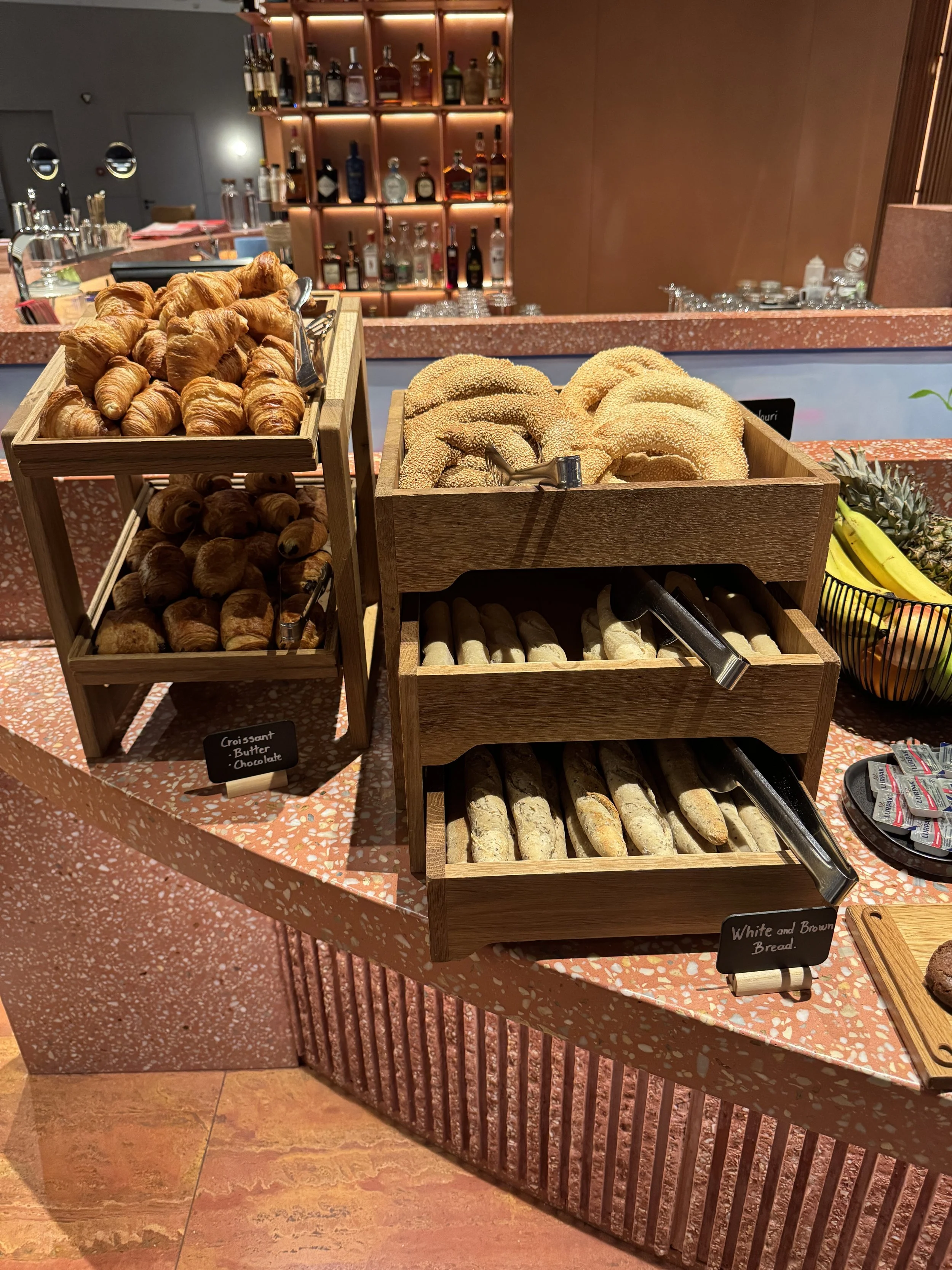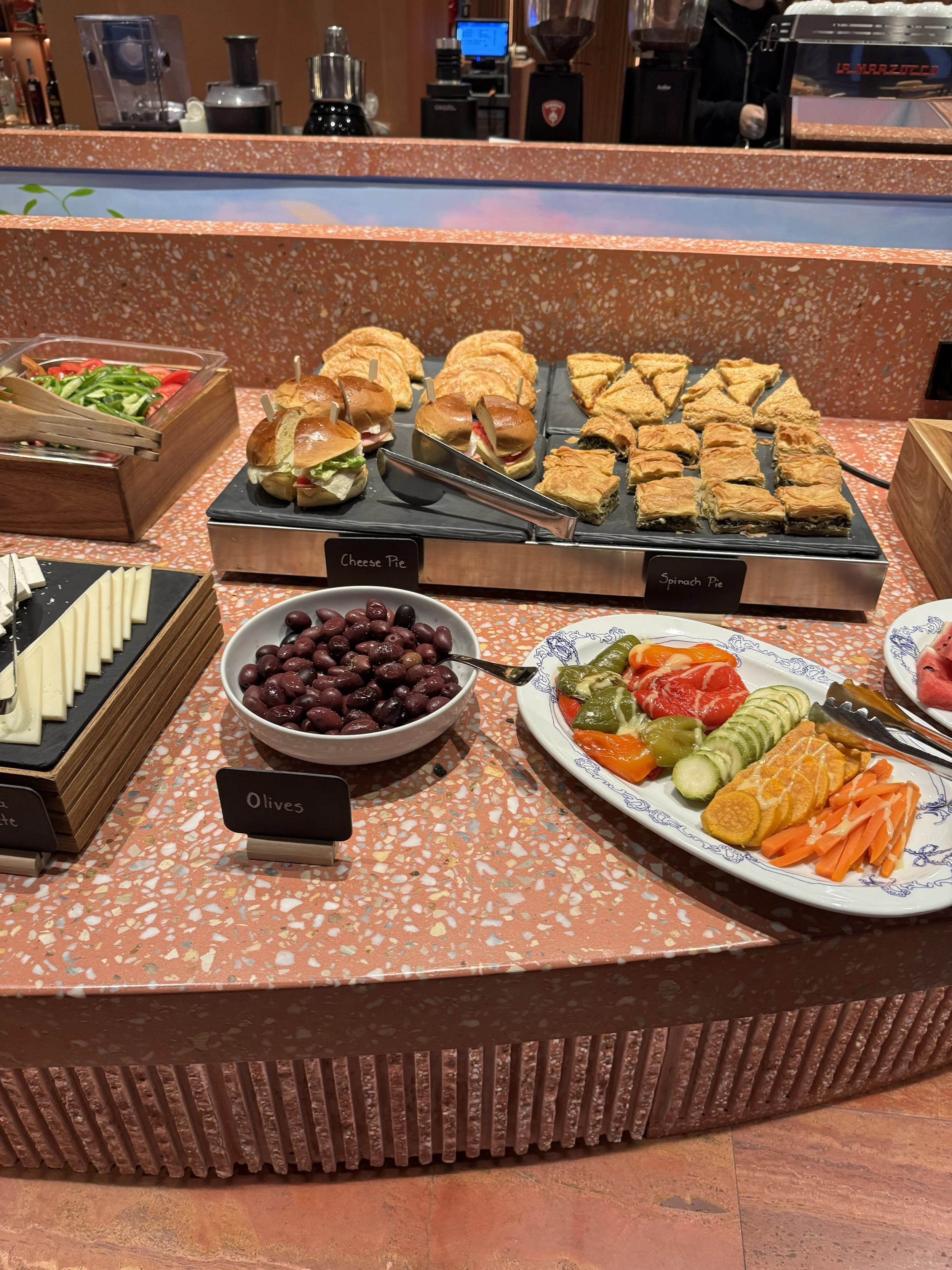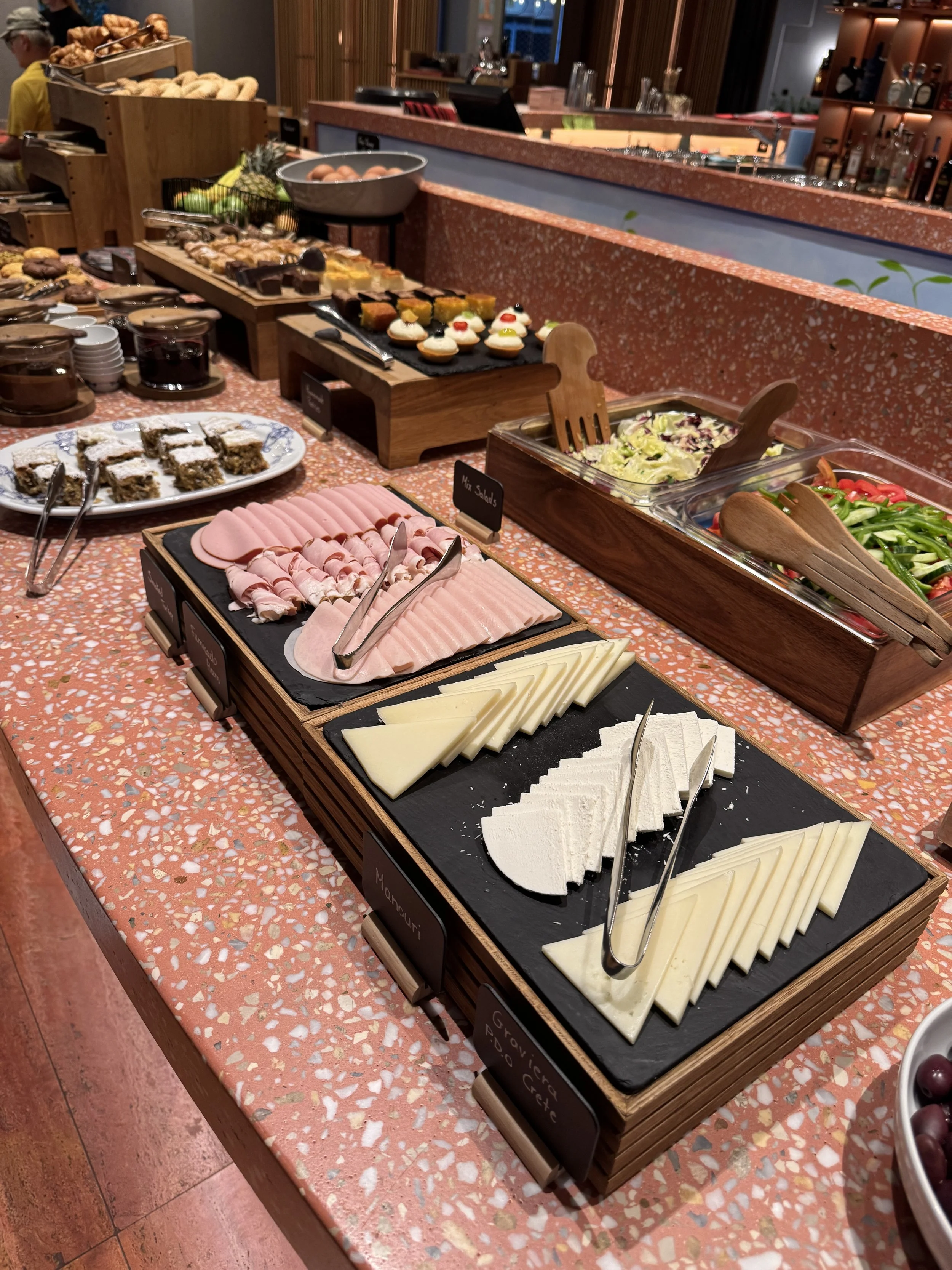 Breakfast is served at Anther Restaurant, the hotel’s elegant ground-floor dining venue that spills out onto Erinis Square. On that late August morning, we had an early ferry to catch, so we arrived at opening time, expecting to be the first guests. To our surprise, a few other early risers — travelers fresh off a red-eye flight — were already waiting. Within half an hour, the restaurant had filled up, proof that a new breed of visitors now prefers to enjoy breakfast early before hiking up to the Acropolis ahead of the midday heat. The breakfast spread was small but well-curated, focusing on quality over quantity. The buffet featured local specialties — freshly baked pies, cheese, olives, Greek yogurt with honey, and seasonal fruit — complemented by an à la carte menu offering several egg dishes including omelettes and scrambled eggs with a variety of toppings. Coffee and juices were served at the table by a charming and efficient team. We opted for the buffet to save time and enjoyed delicious ham and cheese sandwiches, Greek pastries, and a light salad — a refreshing way to start the day, especially if you want to maintain a bit of balance while traveling in Greece (though good luck with that). Had we not been rushing to the port, I would have gladly lingered longer — the atmosphere is inviting, the music mellow, and the natural light streaming through the large windows gives the space a calm morning energy.