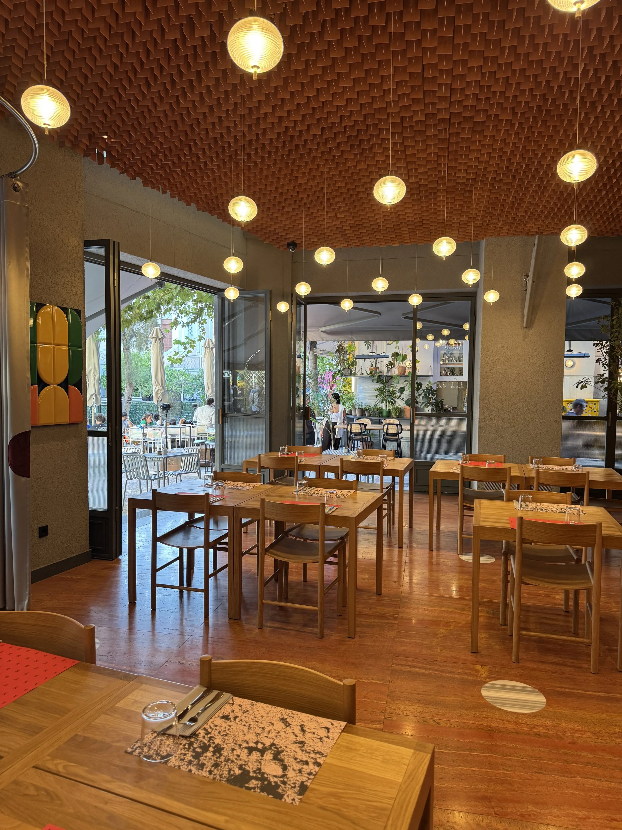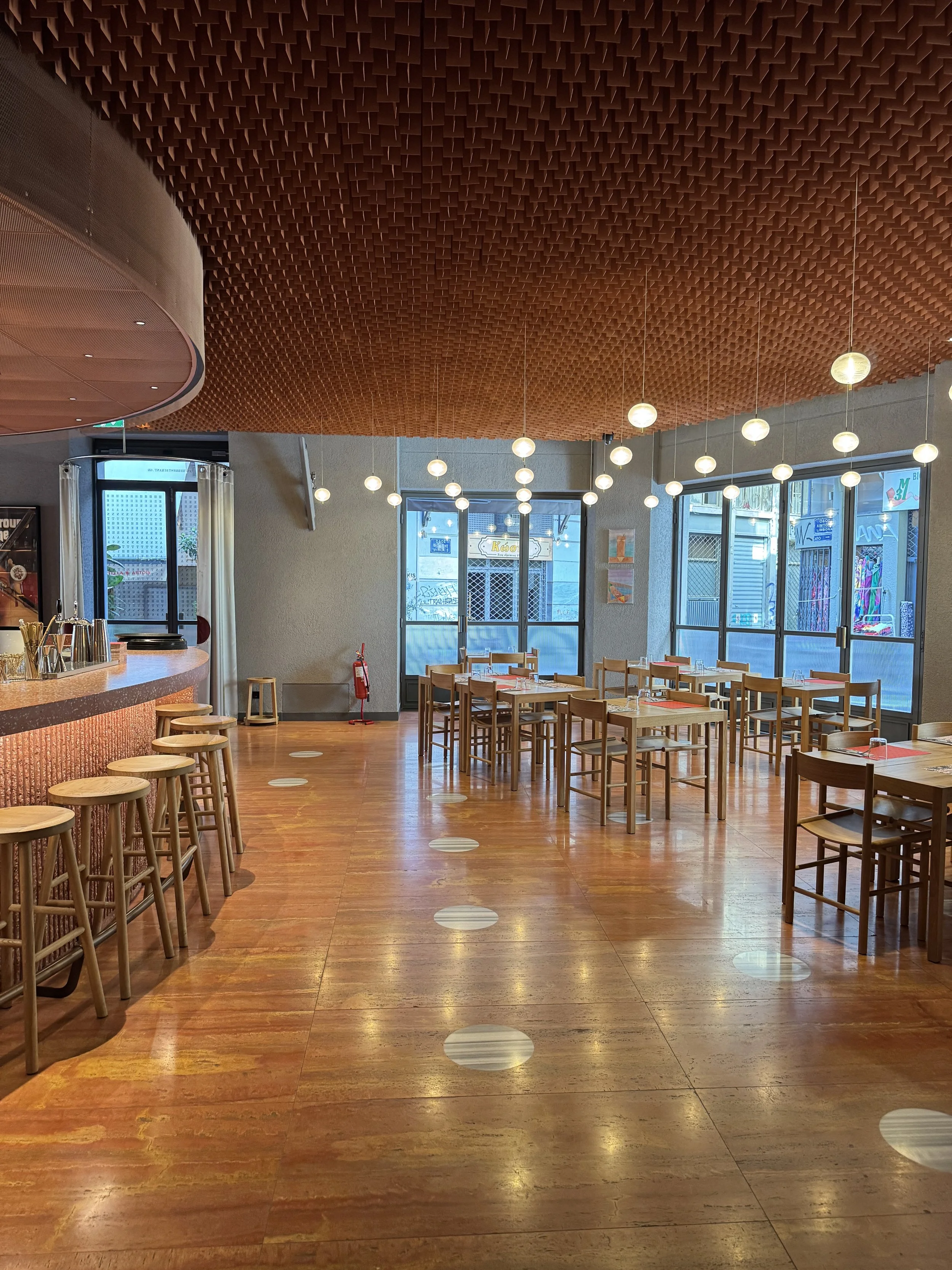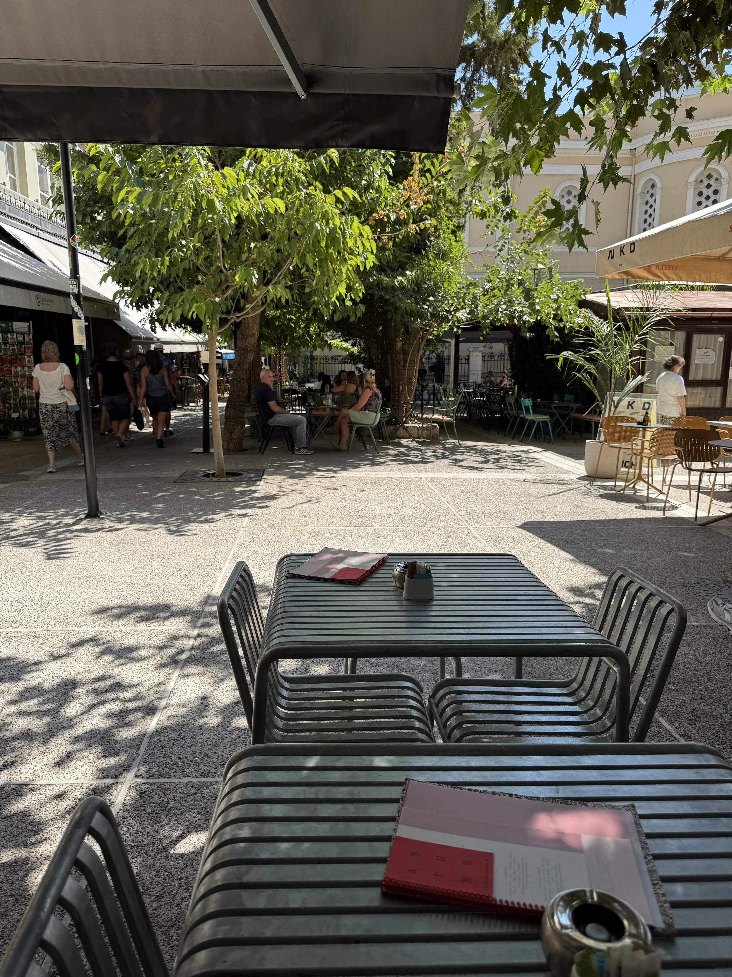 Breakfast is served at Anther Restaurant, the hotel’s elegant ground-floor dining venue that spills out onto Erinis Square. On that late August morning, we had an early ferry to catch, so we arrived at opening time, expecting to be the first guests. To our surprise, a few other early risers — travelers fresh off a red-eye flight — were already waiting. Within half an hour, the restaurant had filled up, proof that a new breed of visitors now prefers to enjoy breakfast early before hiking up to the Acropolis ahead of the midday heat. The breakfast spread was small but well-curated, focusing on quality over quantity. The buffet featured local specialties — freshly baked pies, cheese, olives, Greek yogurt with honey, and seasonal fruit — complemented by an à la carte menu offering several egg dishes including omelettes and scrambled eggs with a variety of toppings. Coffee and juices were served at the table by a charming and efficient team. We opted for the buffet to save time and enjoyed delicious ham and cheese sandwiches, Greek pastries, and a light salad — a refreshing way to start the day, especially if you want to maintain a bit of balance while traveling in Greece (though good luck with that). Had we not been rushing to the port, I would have gladly lingered longer — the atmosphere is inviting, the music mellow, and the natural light streaming through the large windows gives the space a calm morning energy.