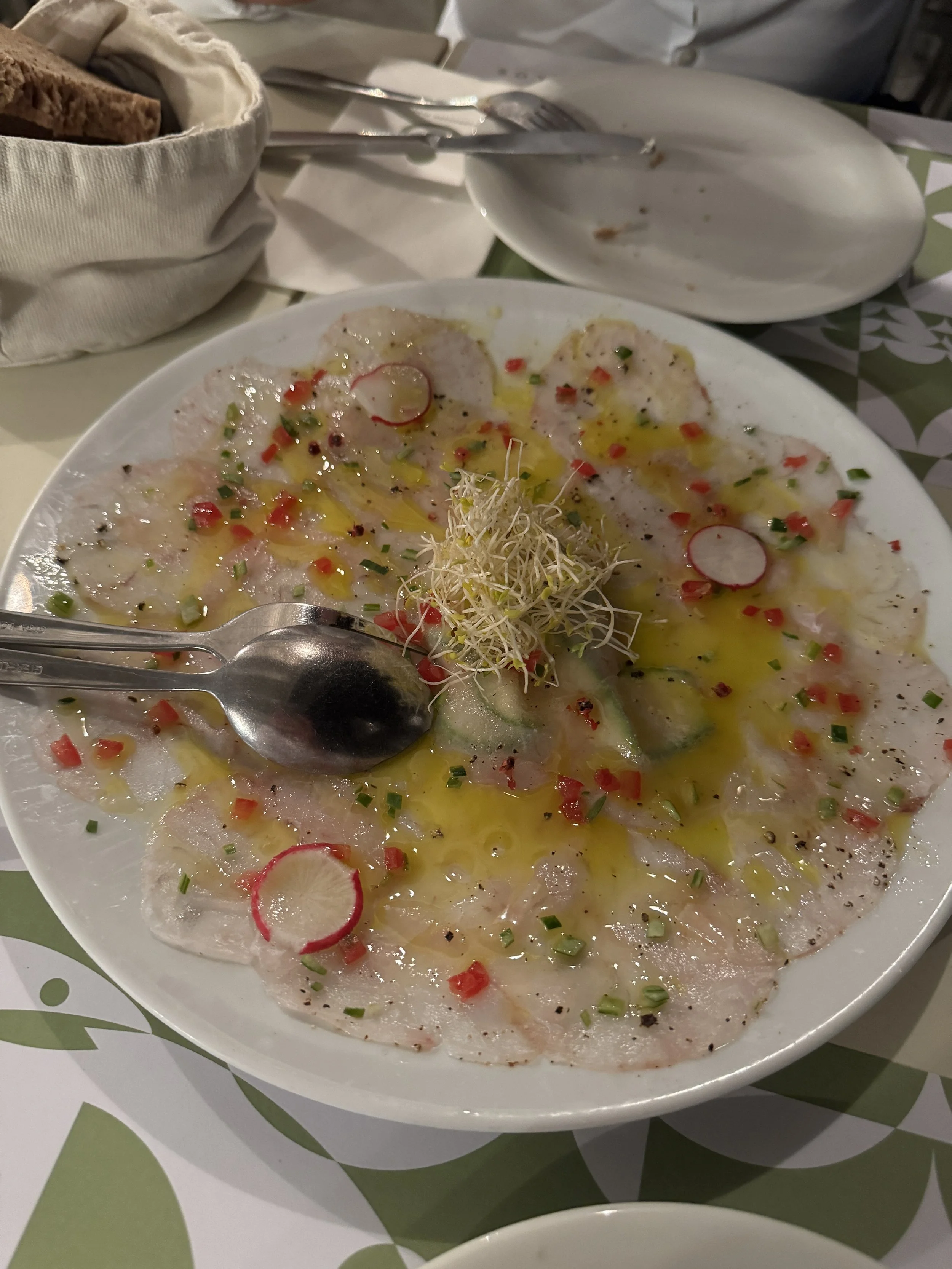 One of the more unusual aspects of Phos Milos is its lack of on-site dining. There is no breakfast buffet, no restaurant, no room service. At first glance, this might seem like a drawback. But in practice, it proved to be one of the hotel’s strengths. Each suite’s kitchen allows for DIY breakfasts, while the lobby fridge is stocked with complimentary water, beers, and a curated wine selection. Need beach towels? Simply help yourself to the oversized blue ones available in the lobby. The entire setup reflects Alex’s philosophy: keep things simple, do the basics right, and give guests the freedom to explore. And explore we did. On Alex’s recommendation, we had breakfast one morning at Hanabi, a Japanese restaurant by night and café by day in Pollonia. Their Avocado Eggs Benedict on a croissant was a revelation, and the laid-back atmosphere along the port was the perfect start to the day. Dinner in Pollonia was equally memorable. Tables are set up right on the sand, the sea lapping just meters away. At Yialos, another of Alex’s tips, we enjoyed some of the freshest seafood of our entire trip. From raw tuna and seabass carpaccio to local catch of the day, it was simple, unfussy, and unforgettable. This is where Phos Milos truly shines: by not offering food, it encourages guests to immerse themselves in the local scene, to discover Pollonia’s charm and flavors rather than hiding away in a hotel restaurant.