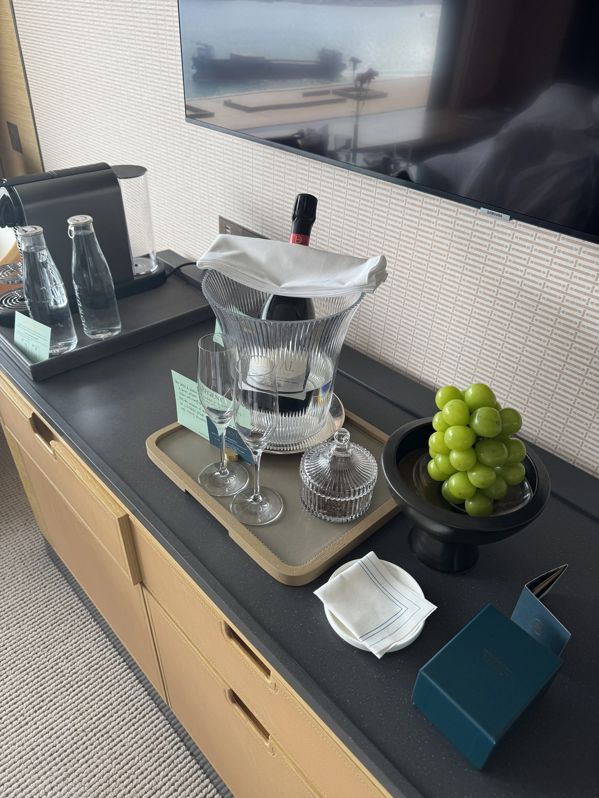 Speaking of thoughtful touches, our welcome amenities included a bowl of delicious, oversized white wine grapes, a few fine chocolates, and a chilled bottle of champagne. The wardrobe, while elegantly designed, offered just enough space for a two-night stay, although it didn’t quite accommodate my Rimowa cabin trolley. As is common in many city hotels, suitcase space is limited, so I’d recommend upgrading to a larger room category if you plan to stay longer or aren’t traveling light.