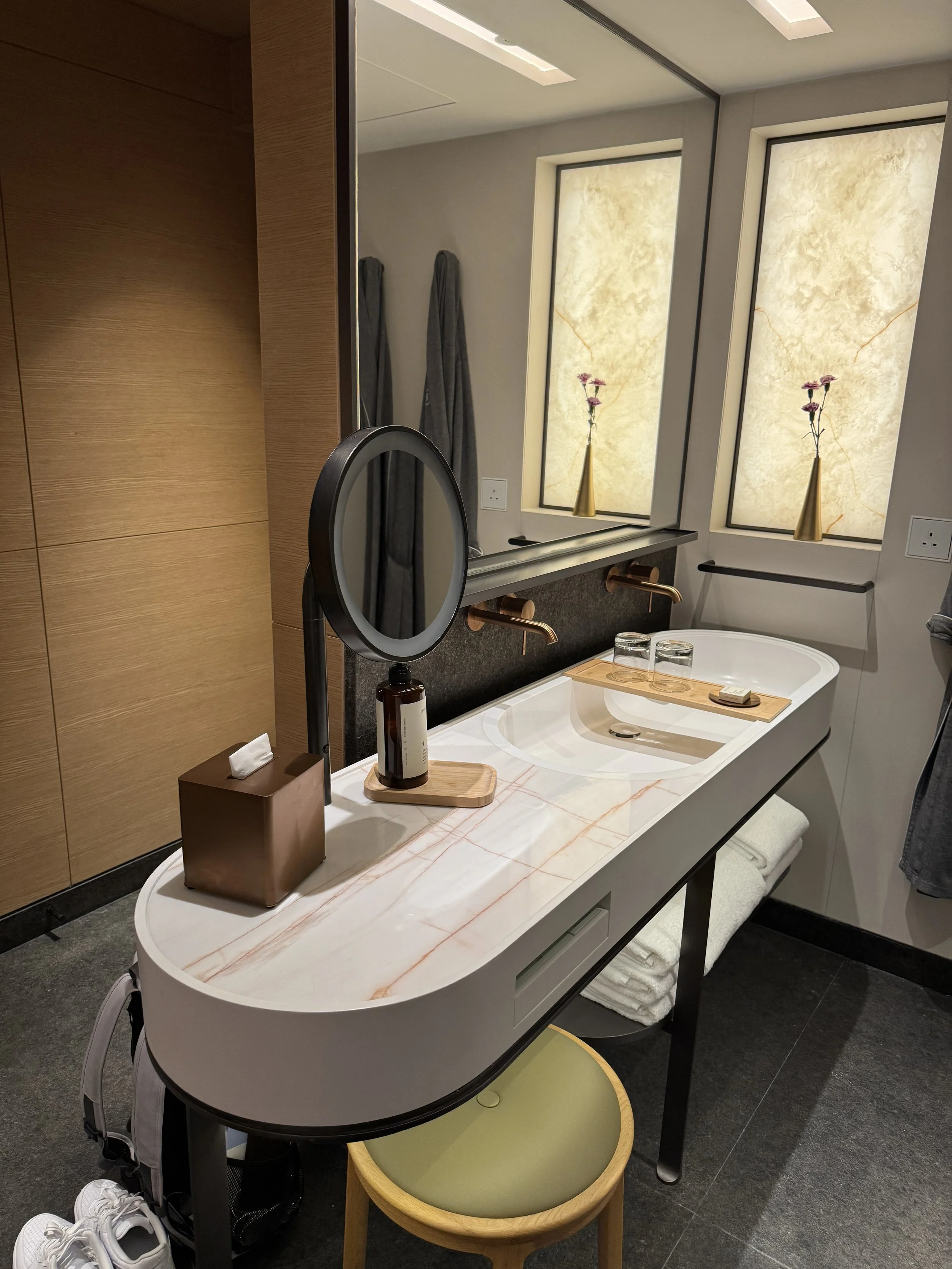 Now, let’s address one of the most talked-about features of the rooms at Regent Hong Kong: the open-plan bathroom. Polarizing to some, adored by others, this layout has been purposefully designed to make the most of the iconic views — even from the bathtub or shower. And what a bathtub it is: possibly the deepest I’ve ever encountered in a hotel, complete with an infinity-edge design. You don’t need to crane your neck in any direction to soak in the skyline. The bathroom also includes a single vanity with dual faucets (ideal for couples), a walk-in rain shower, and a separate toilet.