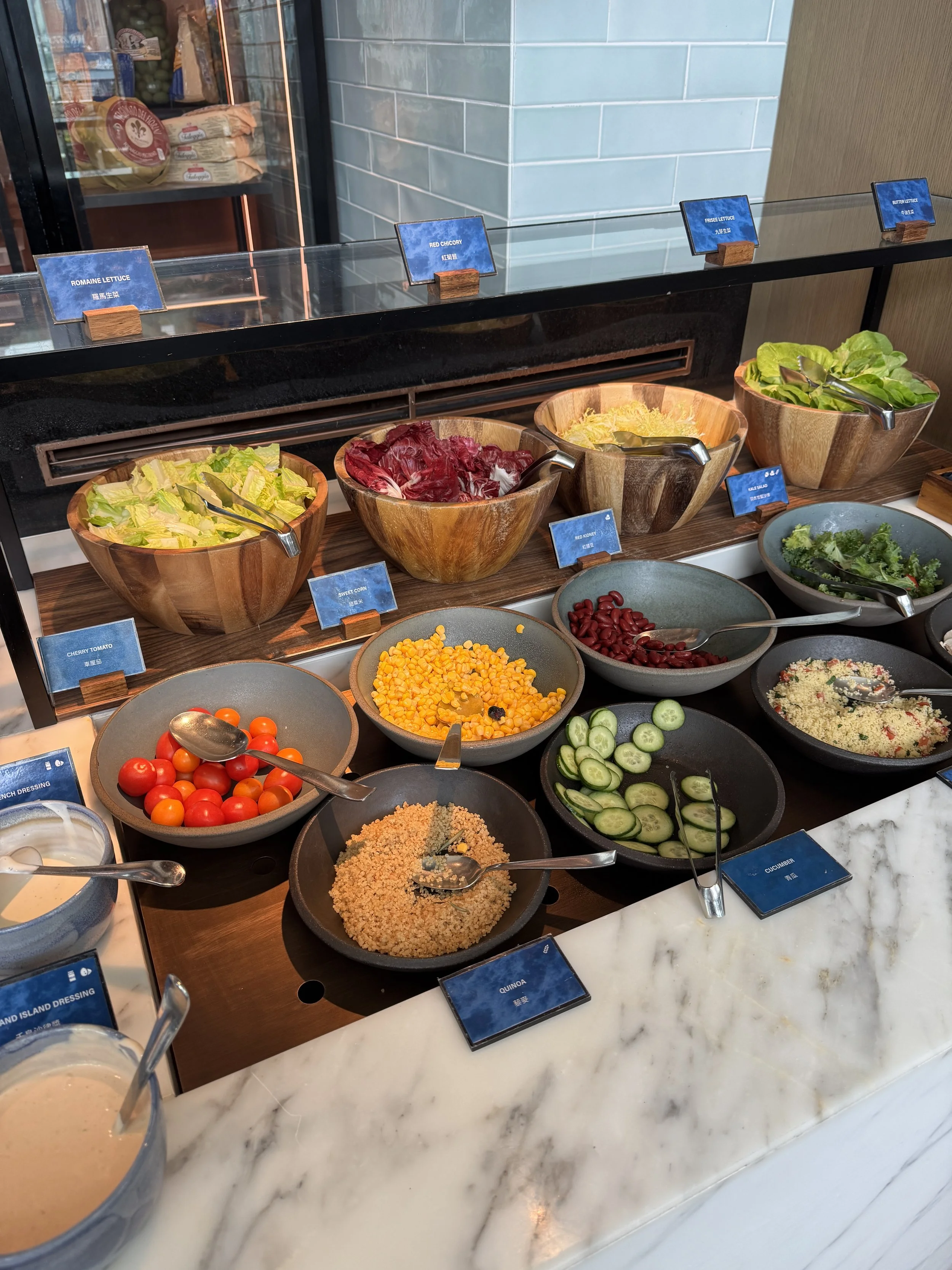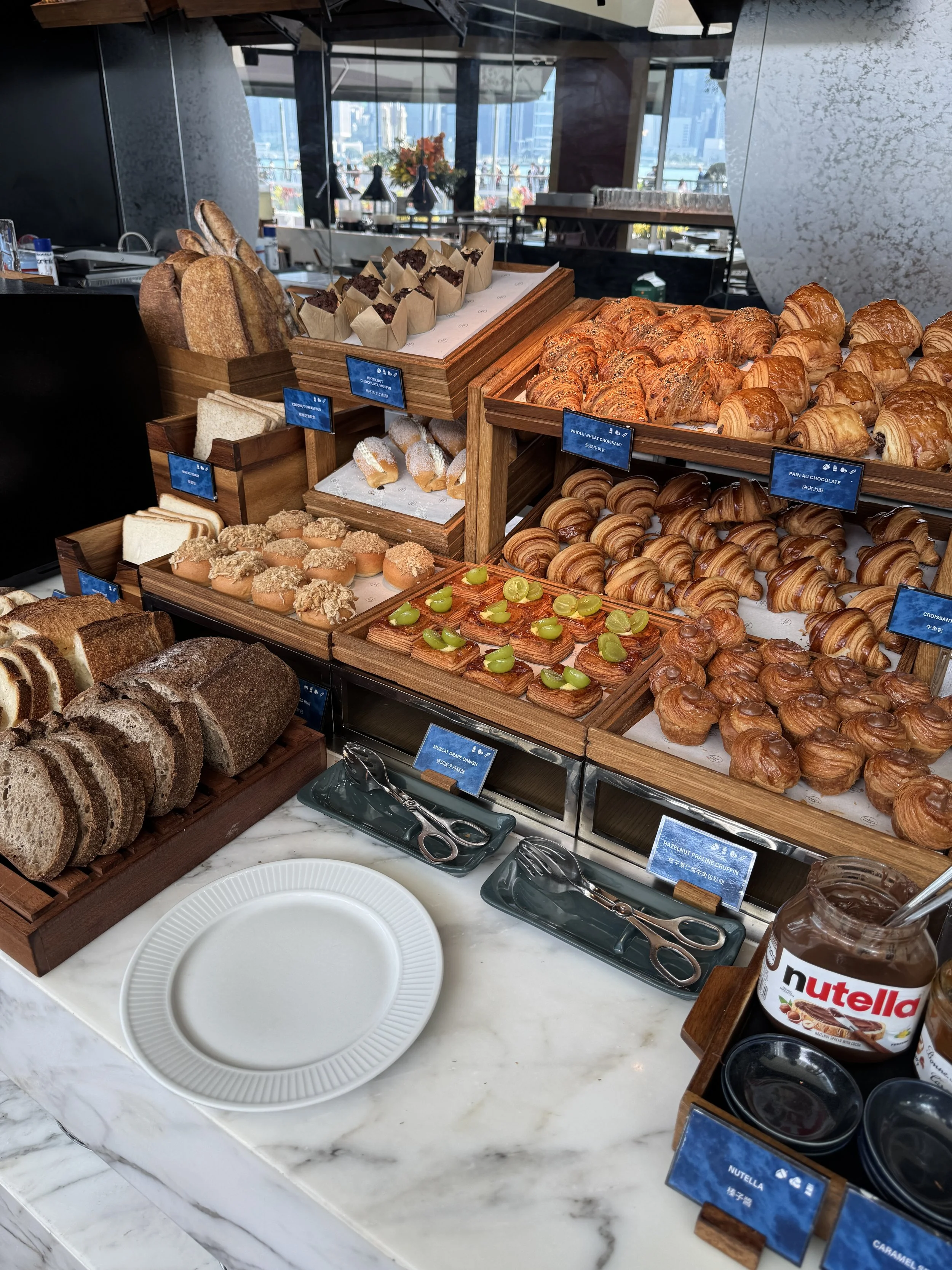 Culinary-wise, we limited ourselves to breakfast and a final dinner at The Steak House. Breakfast is served buffet-style in the main restaurant, Harbourside, which also offers views over the harbour, as its name suggests. I’d read some negative reviews beforehand regarding the buffet, but I found the opposite to be true. Everything was of excellent quality. Though most of the service is self-serve (except for coffee and tea), the variety was impressive. I even tried the Eggs Benedict — typically a risky buffet dish — and found it surprisingly enjoyable. The bread selection was outstanding, as were the fresh salads and the array of Asian dishes catering to the mostly local clientele. Despite the restaurant being fairly busy, the staff were always attentive and quick to offer refills on hot drinks.