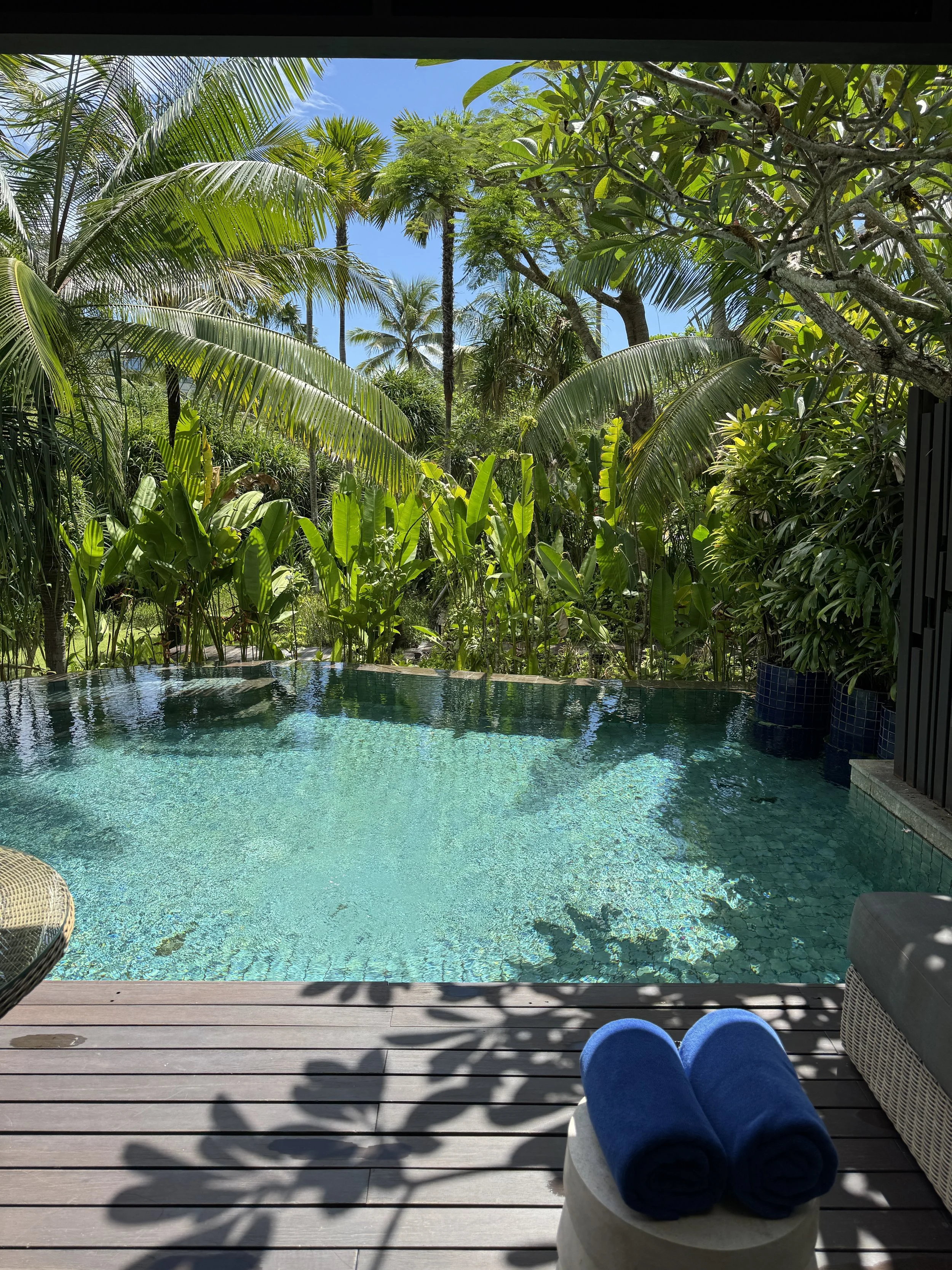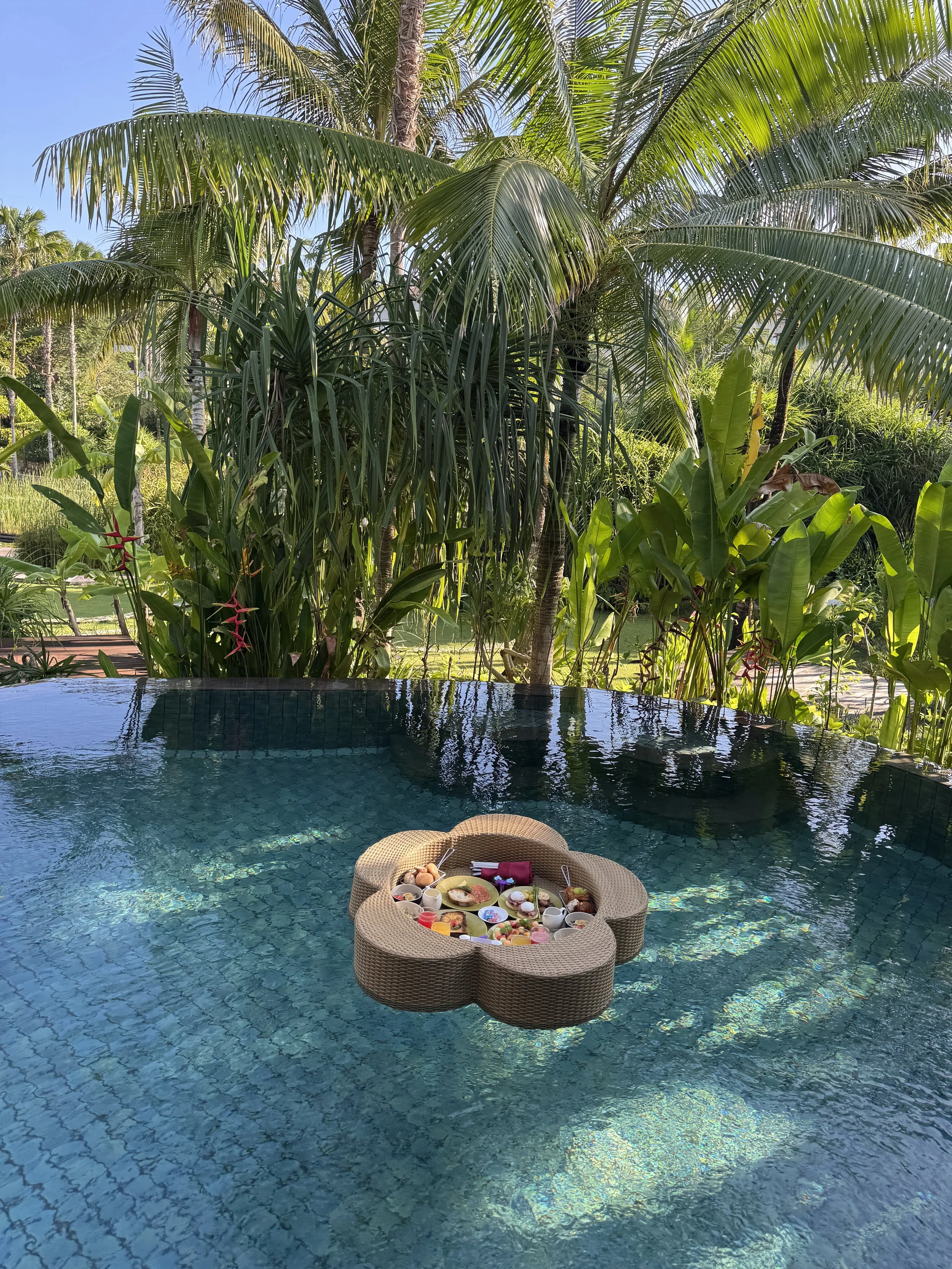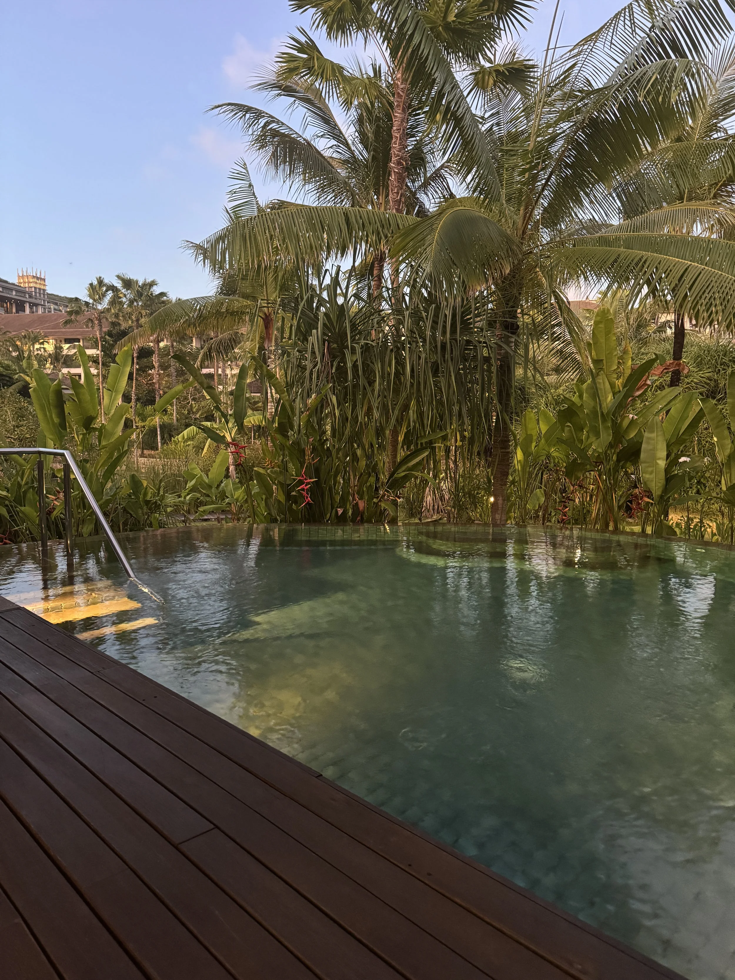 The villa’s private pool, accessible directly from the bedroom’s terrace, stretches alongside adjacent villas, separated by large decorative planters to ensure a sense of privacy. The experience of waking up early, taking a swim, and enjoying a rejuvenating outdoor shower in the morning sun was unforgettable—a rare luxury only a few get to enjoy regularly.