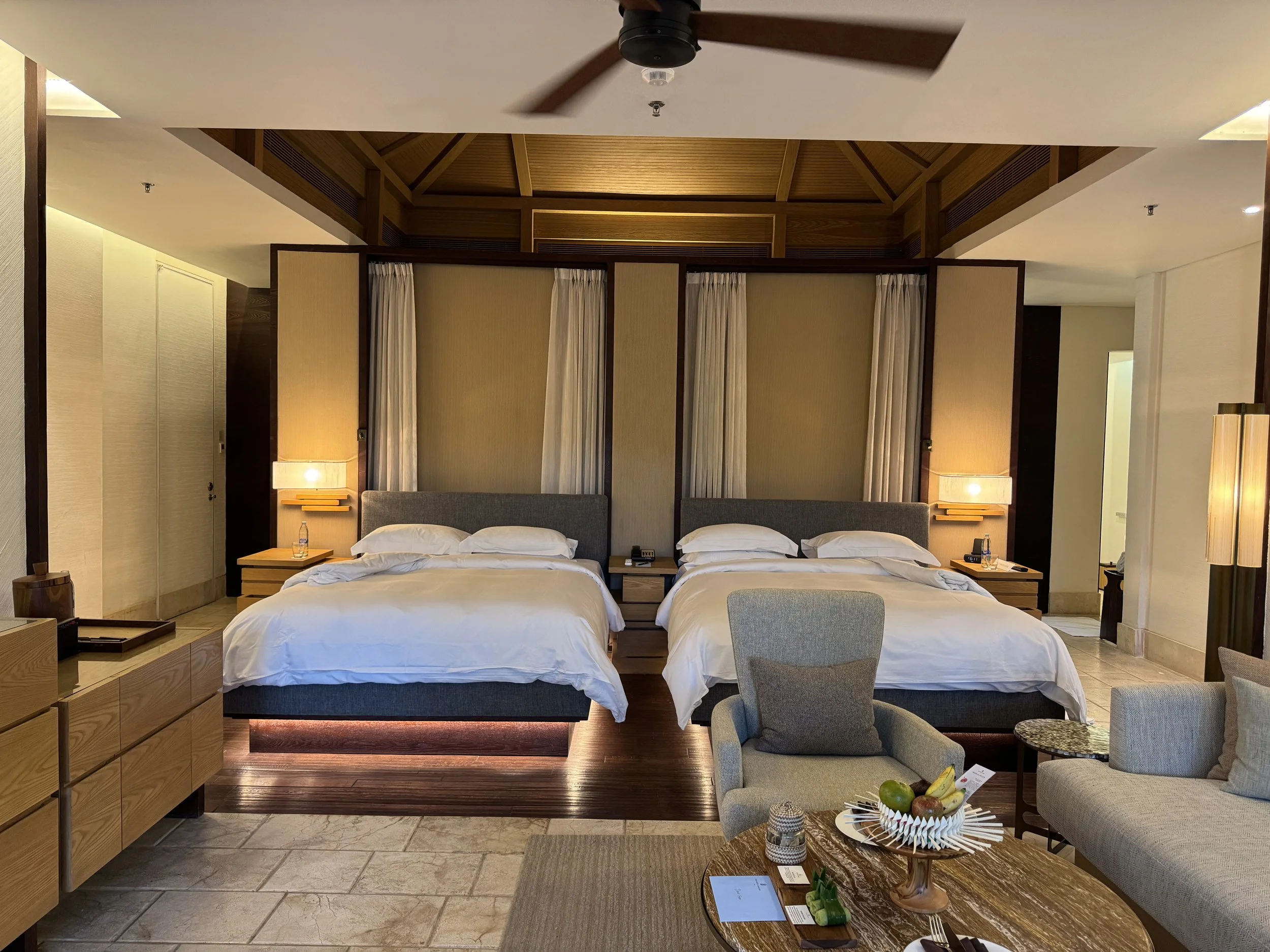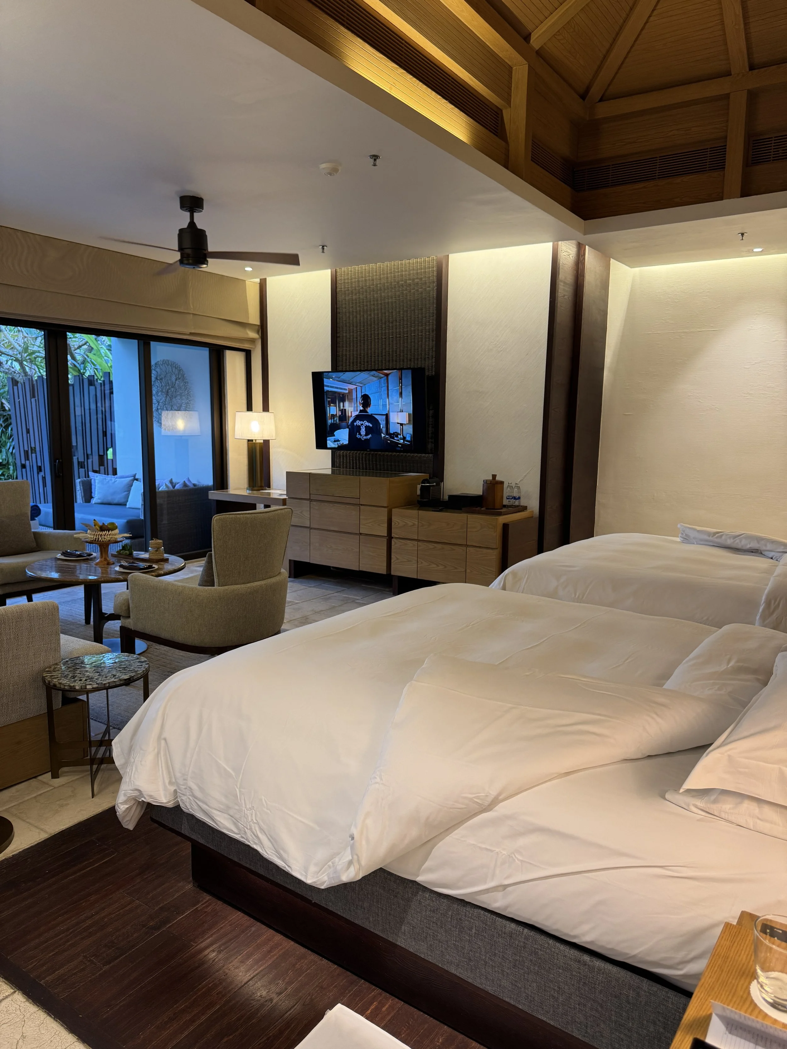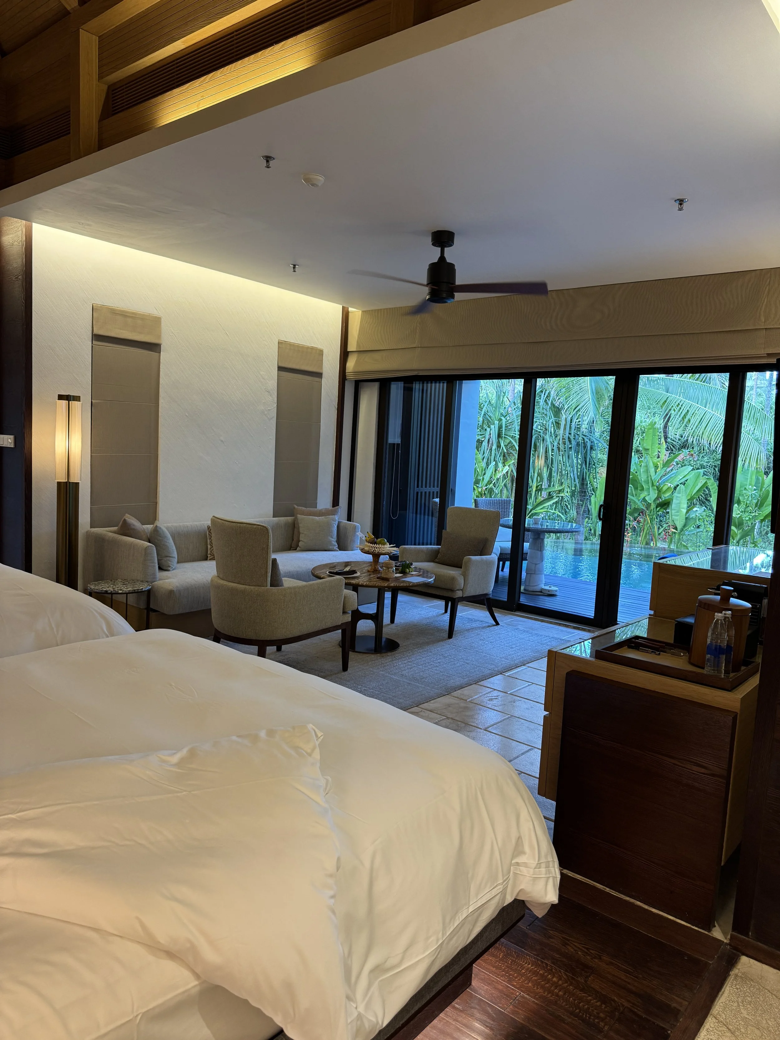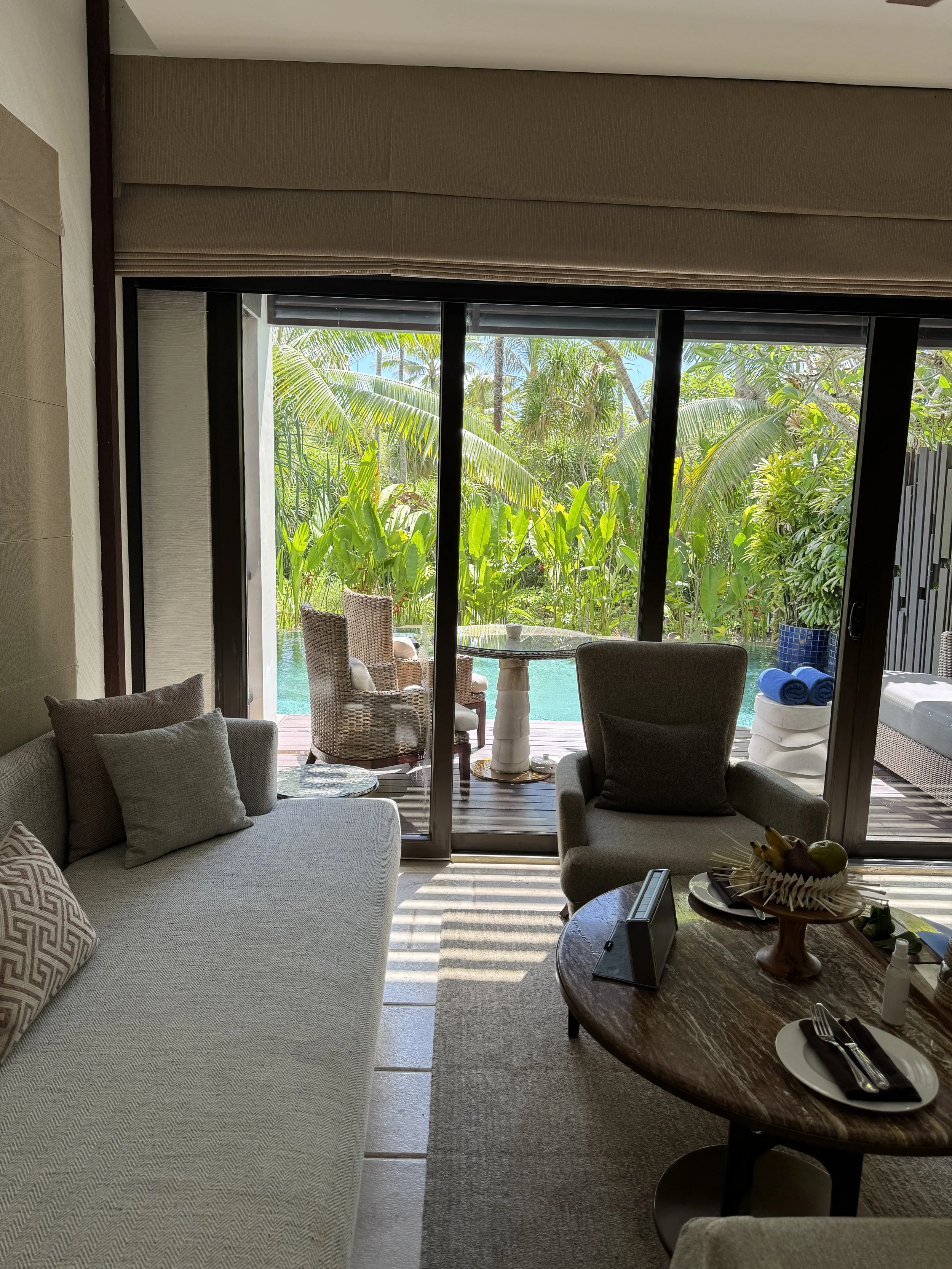 Our villa, one of the closest to the beach, was part of a trio of interconnected units. This layout is perfect for families or groups of friends traveling together. We had booked a Signature Pavilion Villa with a private pool, and I would highly recommend requesting a corner unit for enhanced privacy and additional daylight in the bathroom thanks to its side windows.