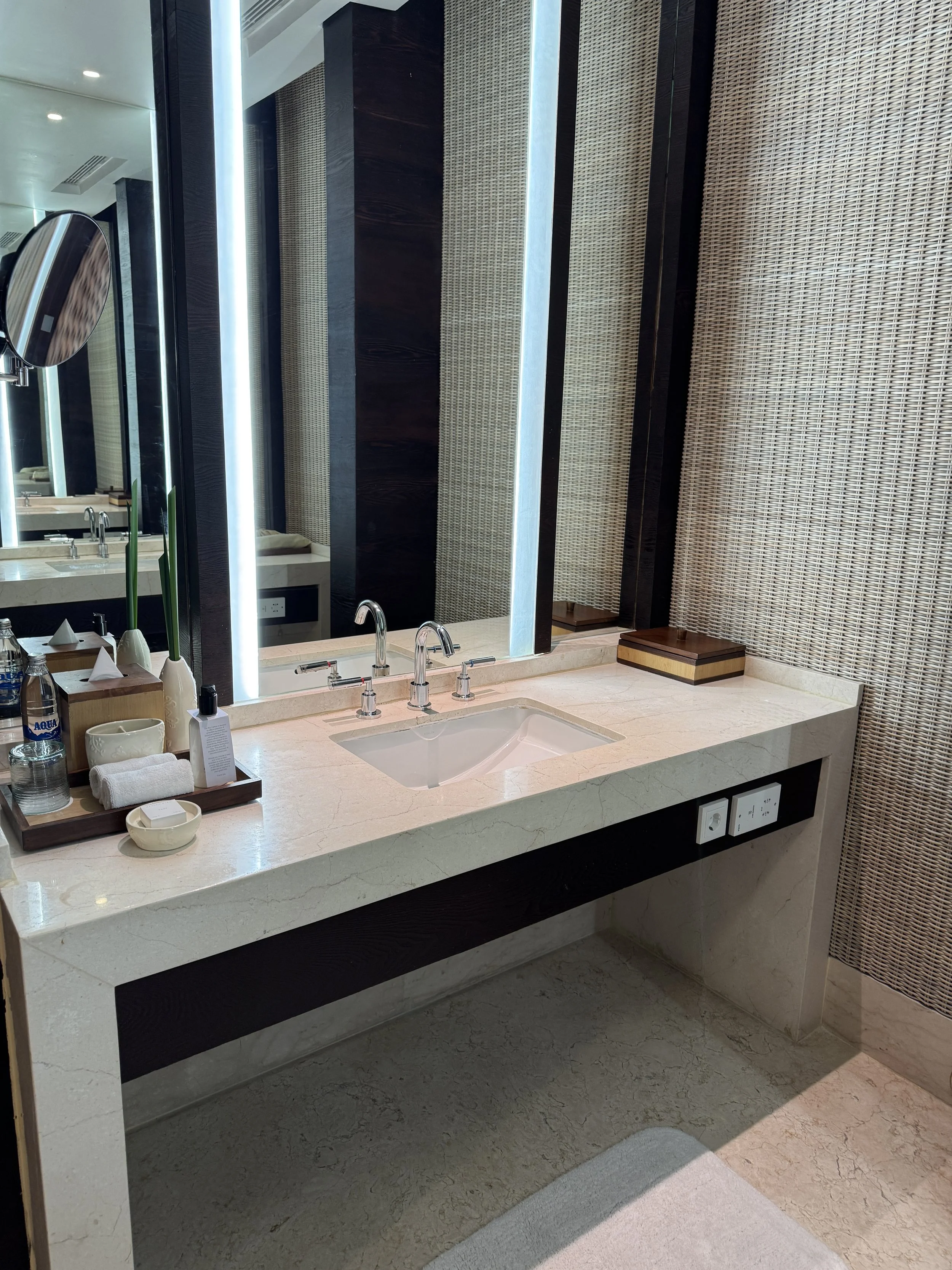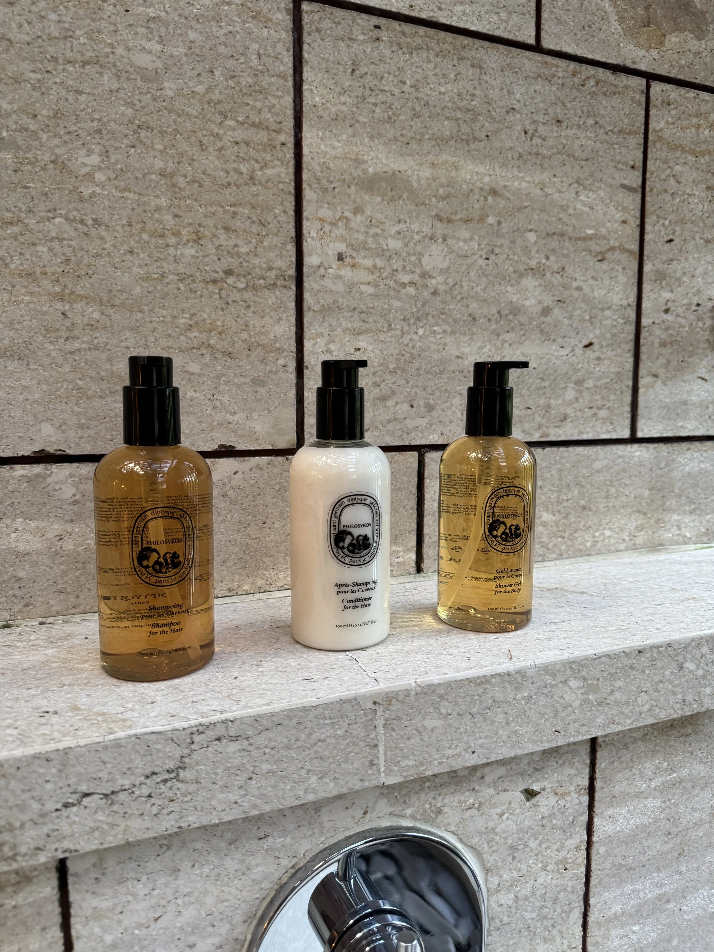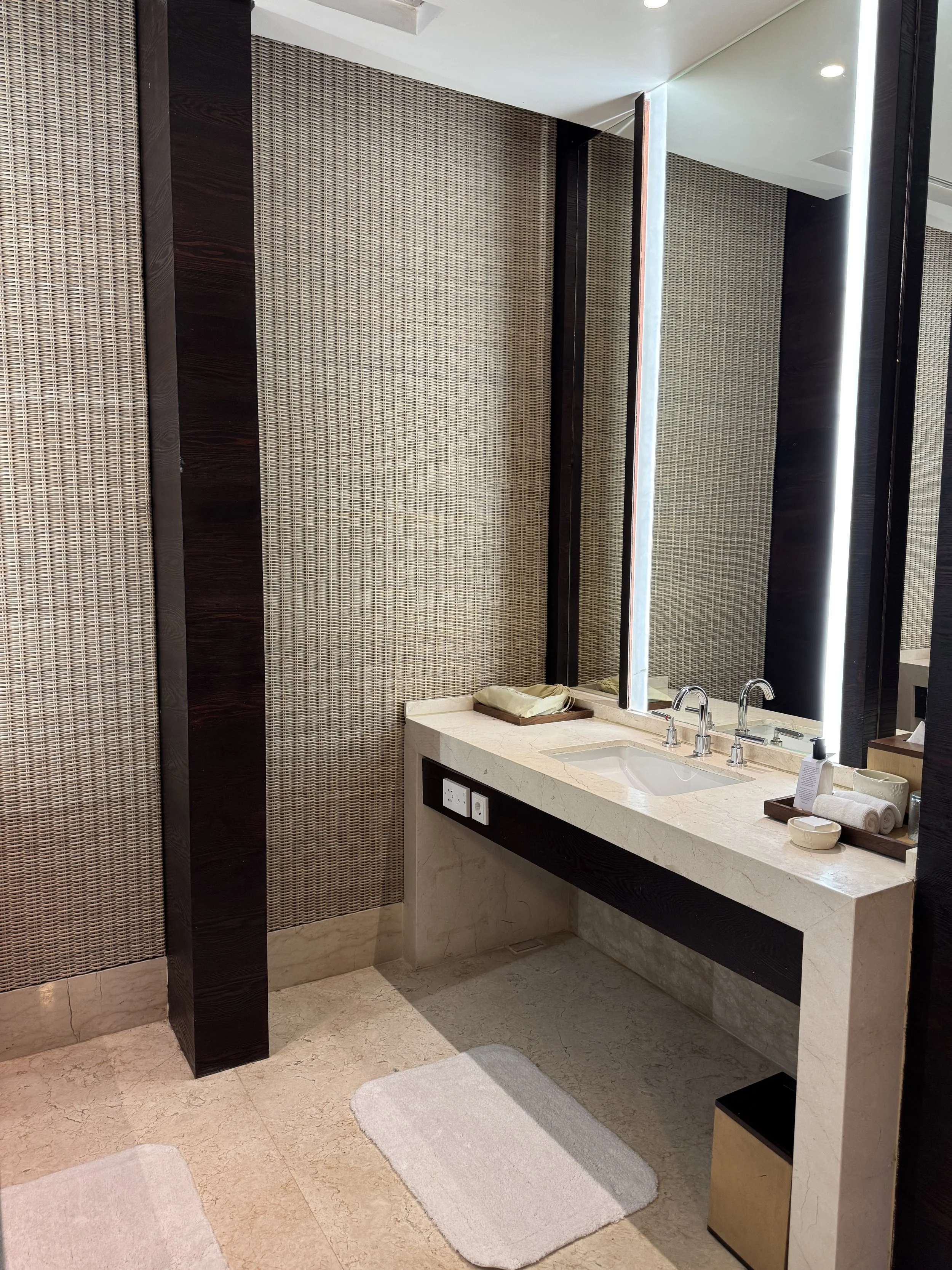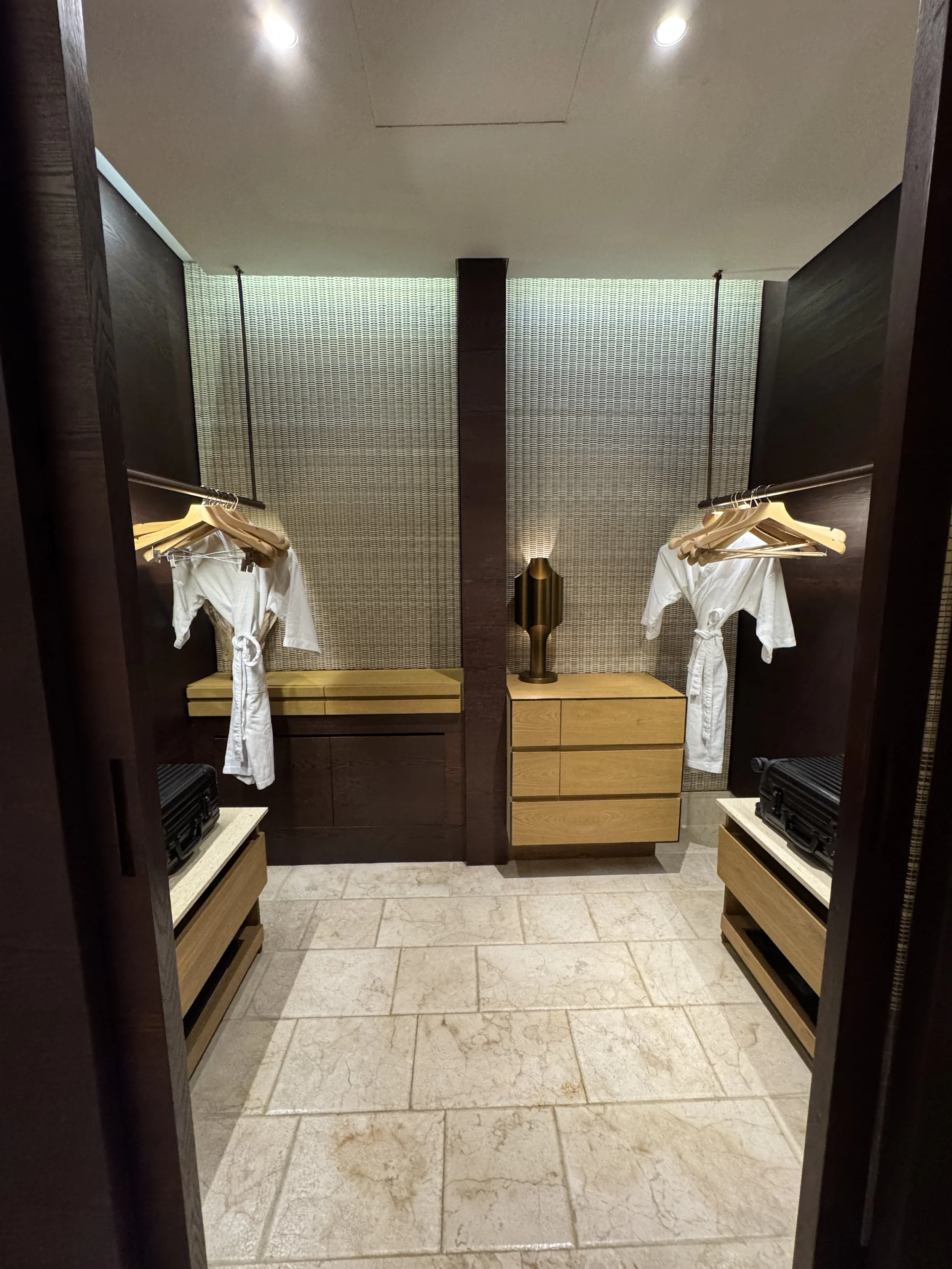 As we stepped inside, we were greeted by a spacious entrance hall with two wings. On one side, a large walk-in wardrobe—more than enough storage for a week-long stay. On the other, a stunning open-concept bathroom featuring double vanities, a Toto Japanese-style electric toilet, and a walk-in rainfall shower stocked with a generous array of full-size Diptyque toiletries. This shower connects to the outdoor bathing area, where you’ll find a soaking tub and an alfresco waterfall shower—also stocked with Diptyque products. While I loved indulging in these luxurious amenities, I was a little disappointed to find signage warning that guests who take the toiletries home would incur a charge. As someone who enjoys reliving hotel memories at home through scent, it nearly broke my heart to leave them behind.