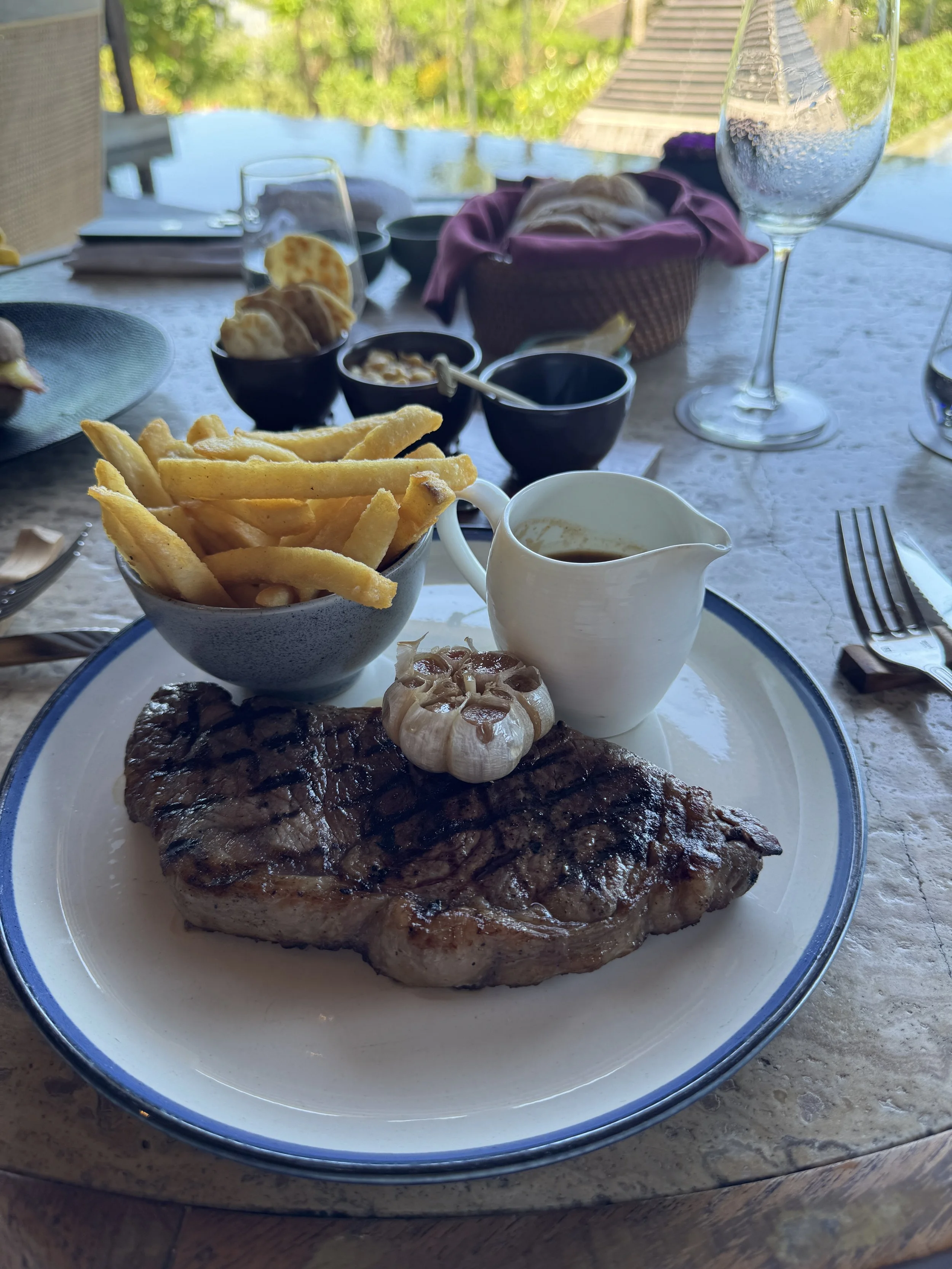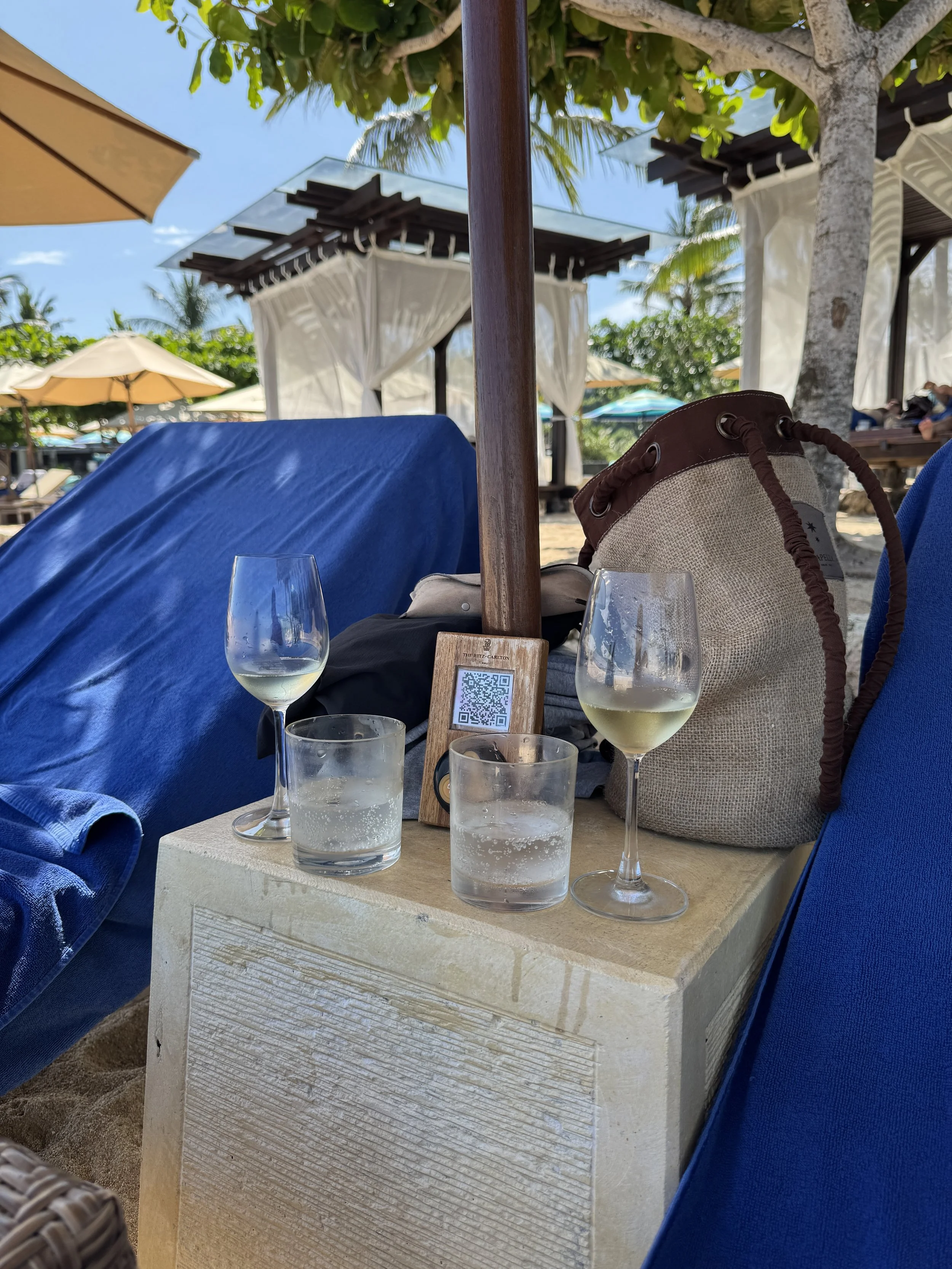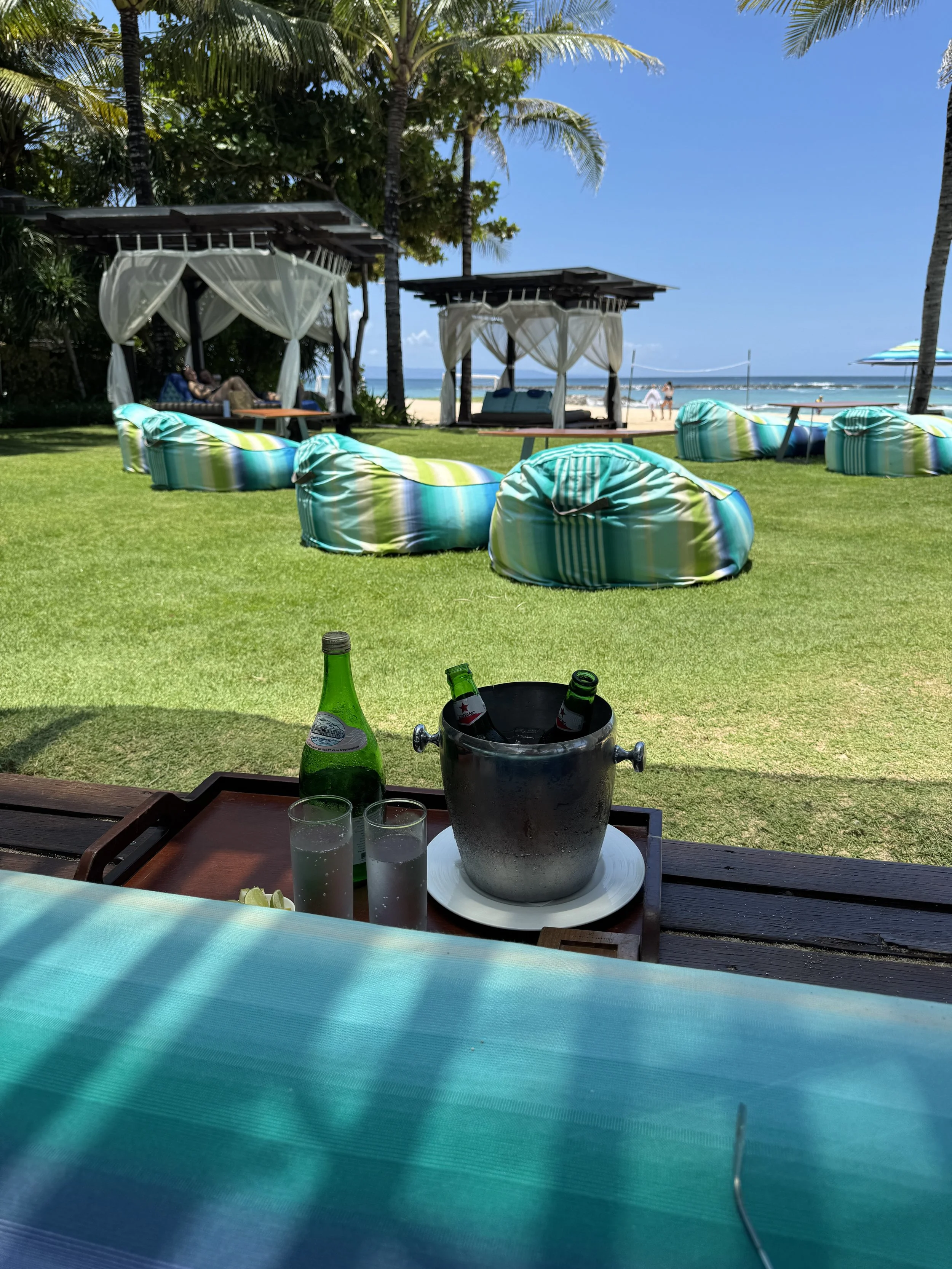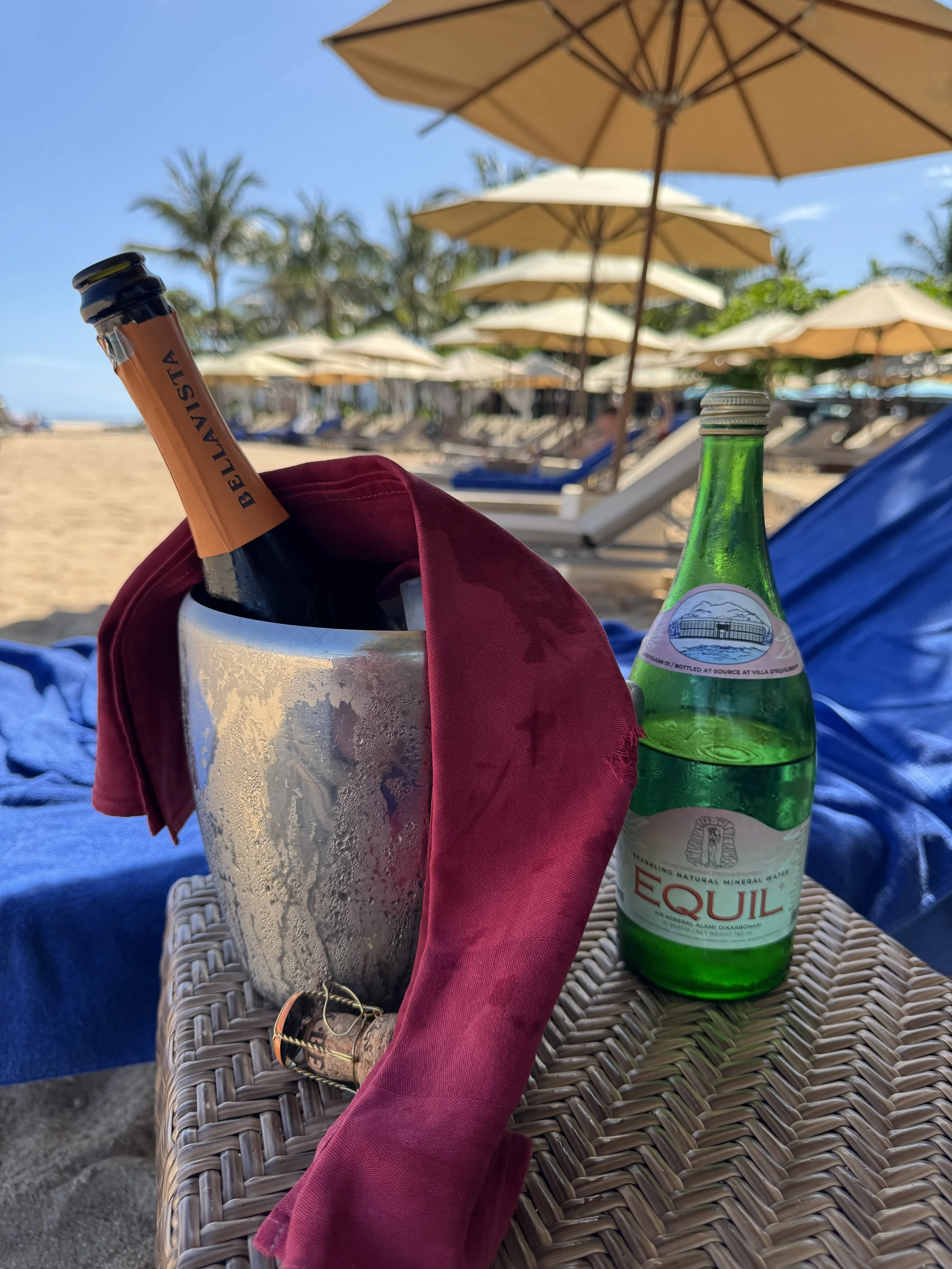 Ironically, despite having our own private pool, we only used it once. That’s a testament to the allure of the beachfront, which is arguably one of the most stunning in Bali. We spent the better part of our days lounging under umbrellas on soft white sand, sipping ice-cold Bintang beer and Bellavista Franciacorta—a delightful surprise to find this renowned Italian sparkling wine in Southeast Asia.