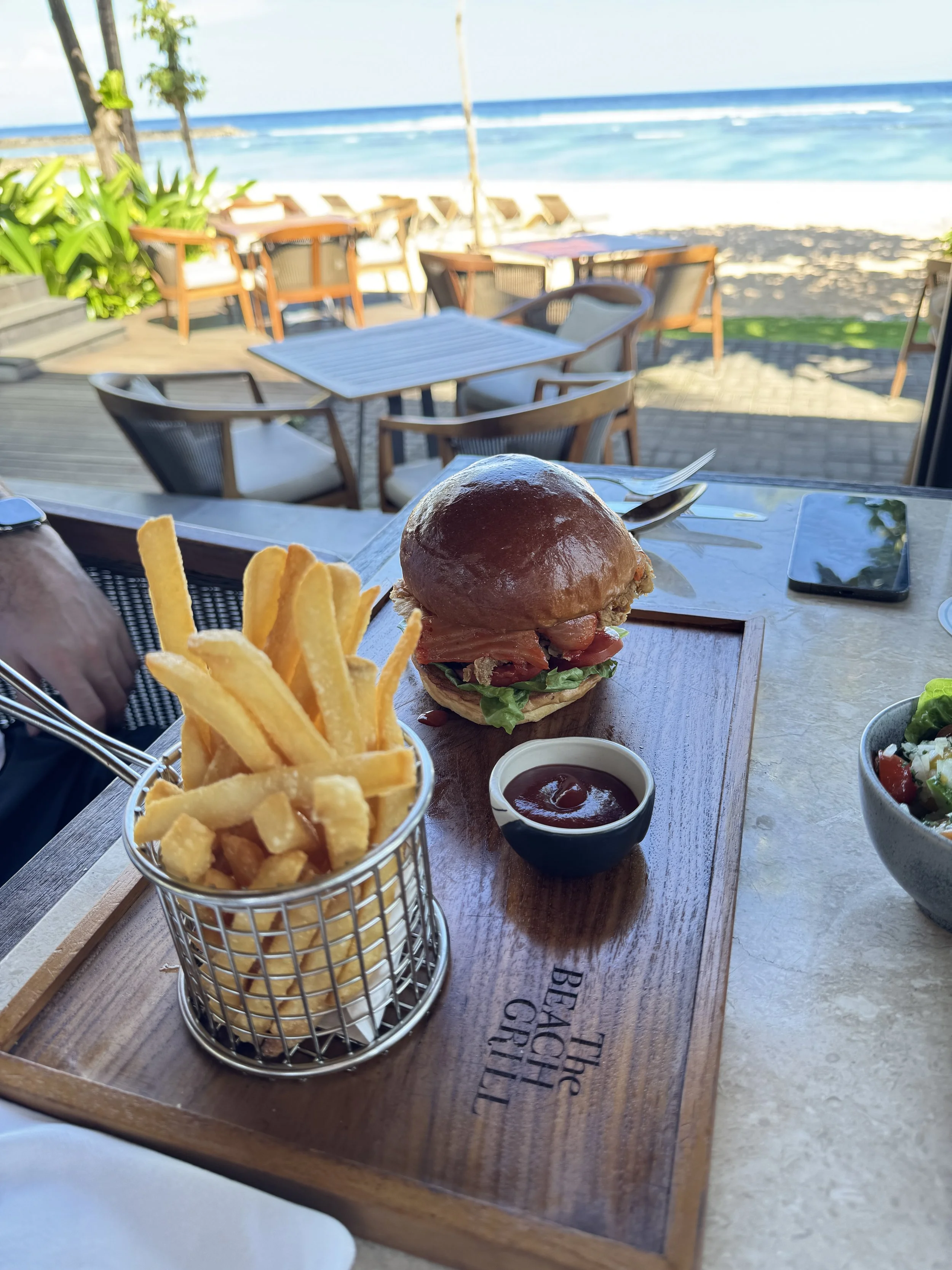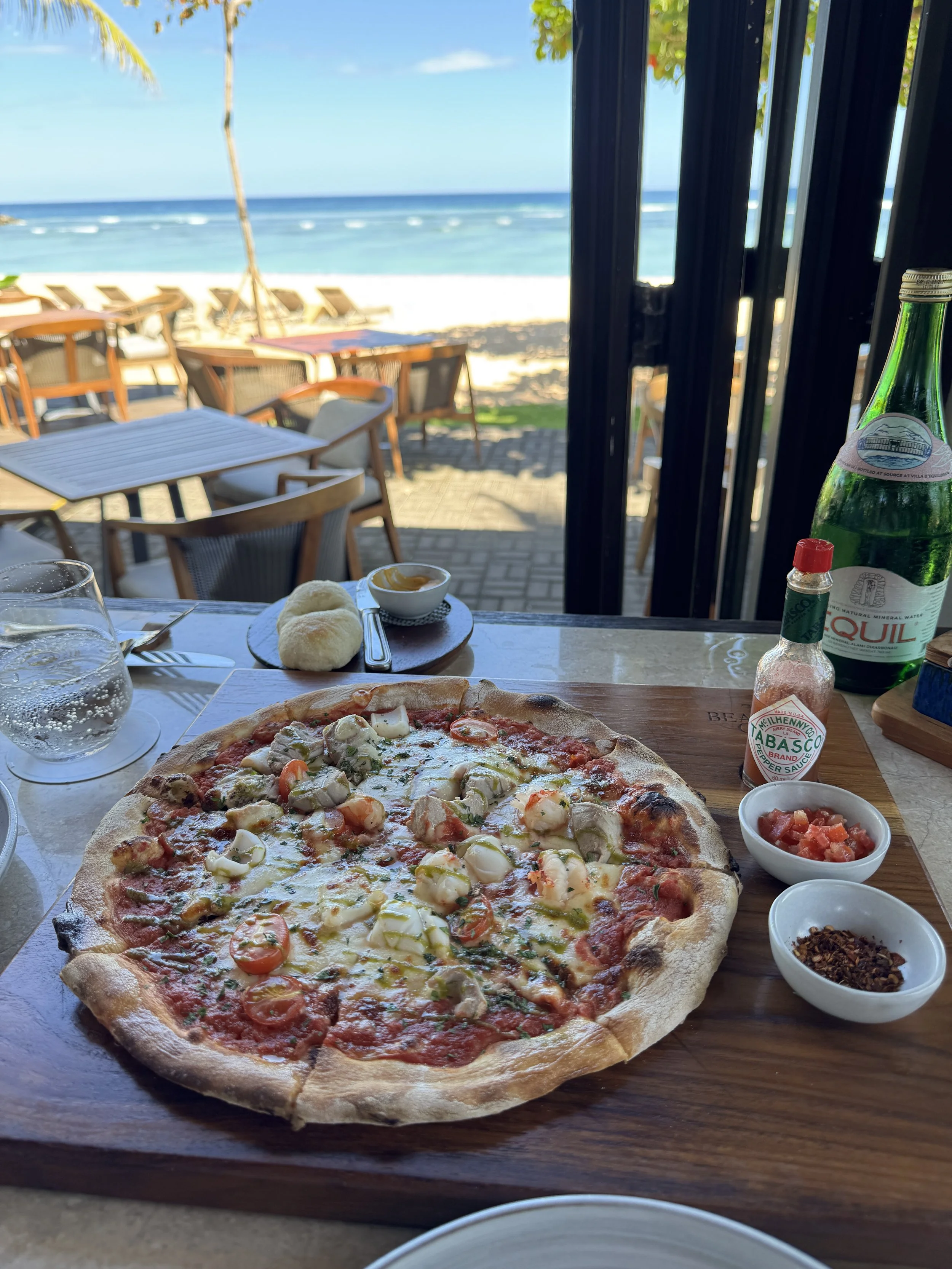Inspired to fully explore the property, we challenged ourselves to dine at every available restaurant during our stay. We began with lunch at the Beach Grill, a favorite of mine for its relaxed, western-style menu and beachfront location. We shared a pizza as a starter, then enjoyed a Korean BBQ burger and grilled beef skewers with pita. The meal was satisfying, and the fresh bread and pizza from the stone oven were highlights.