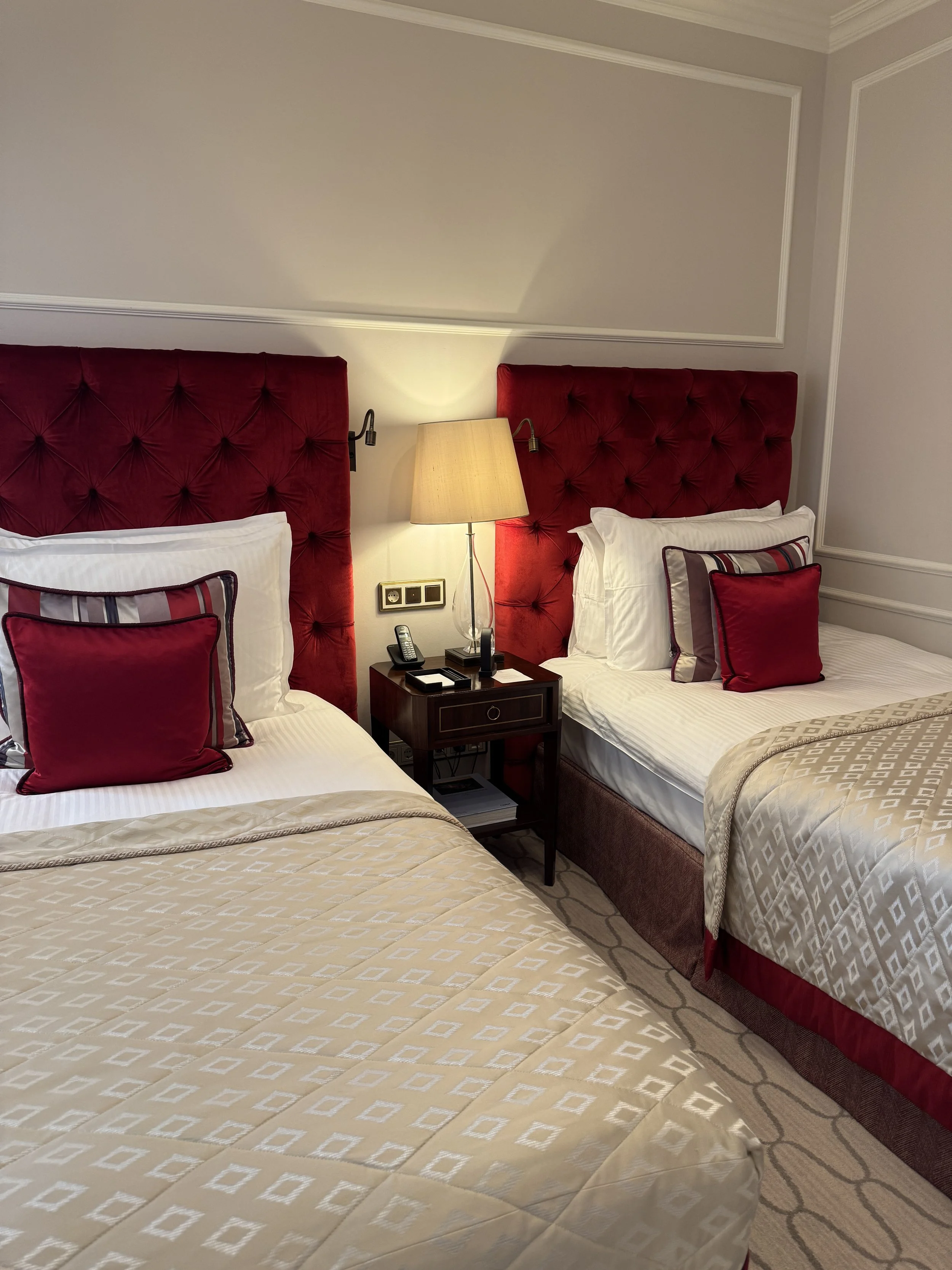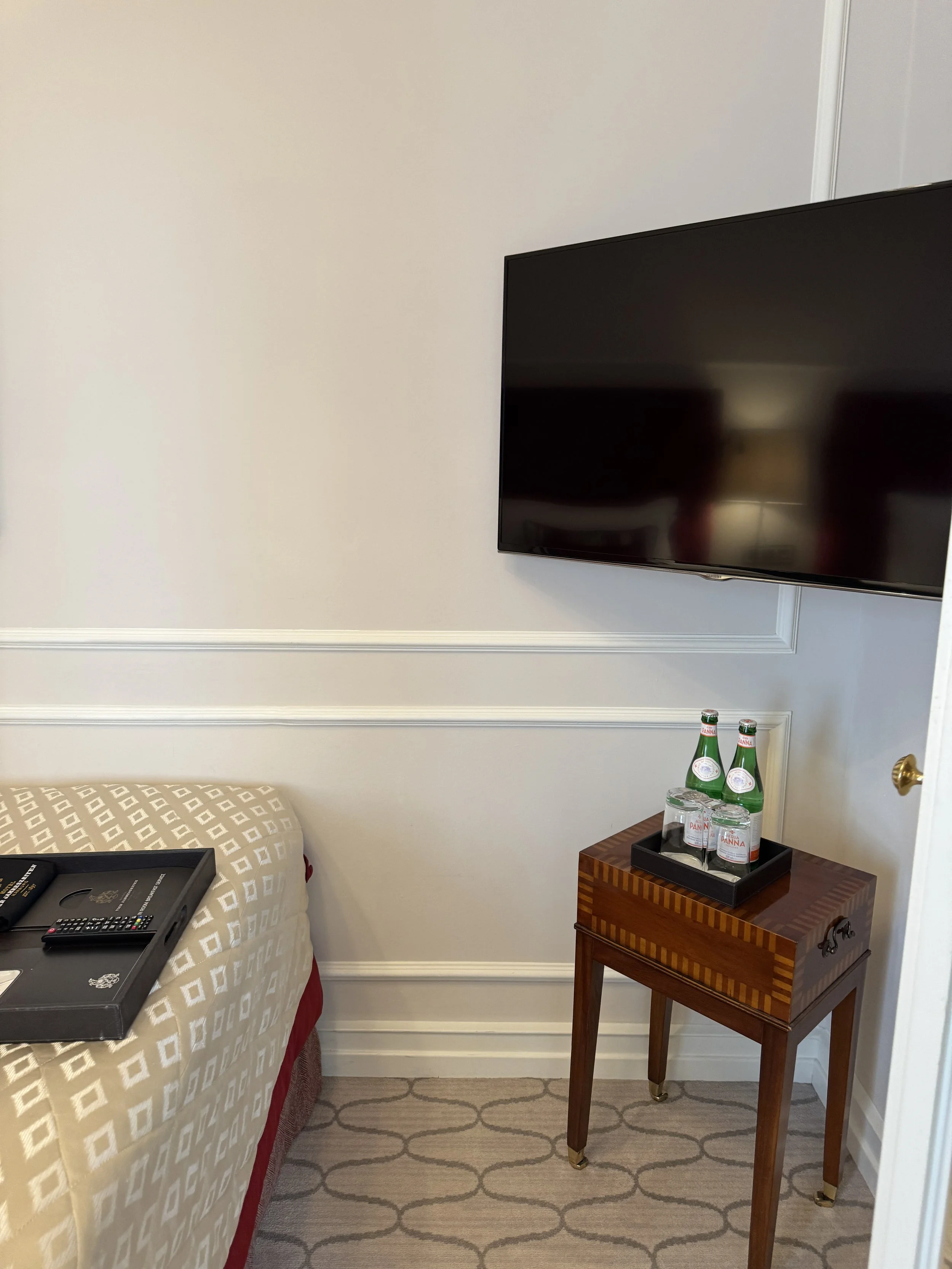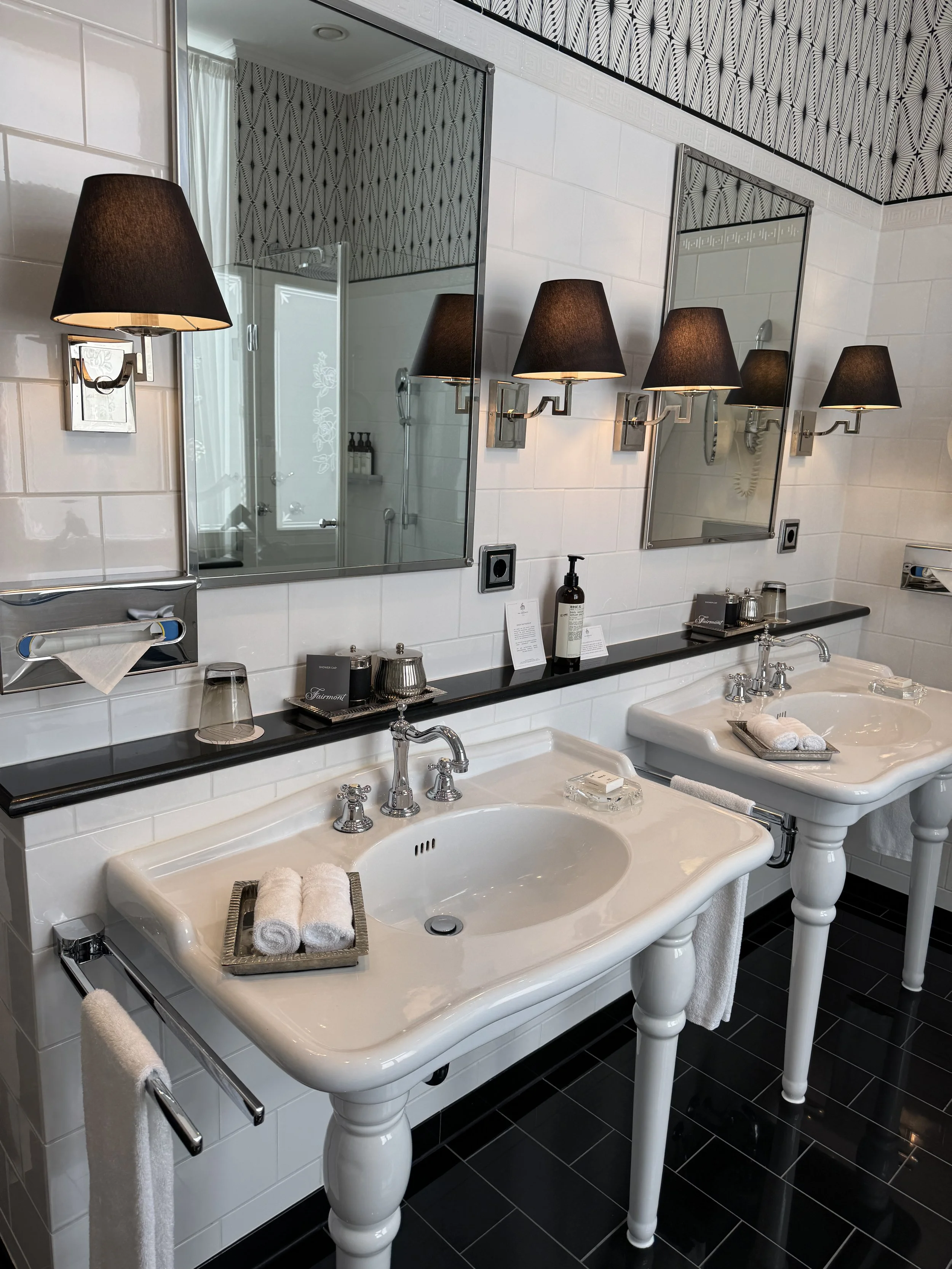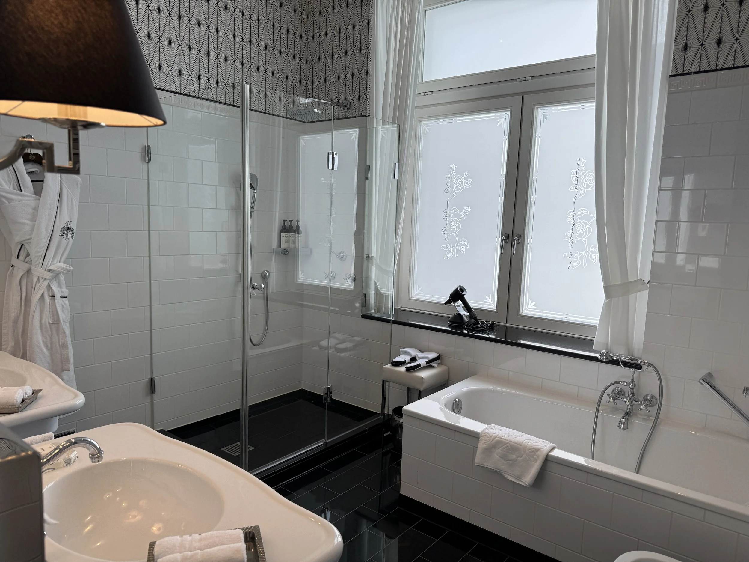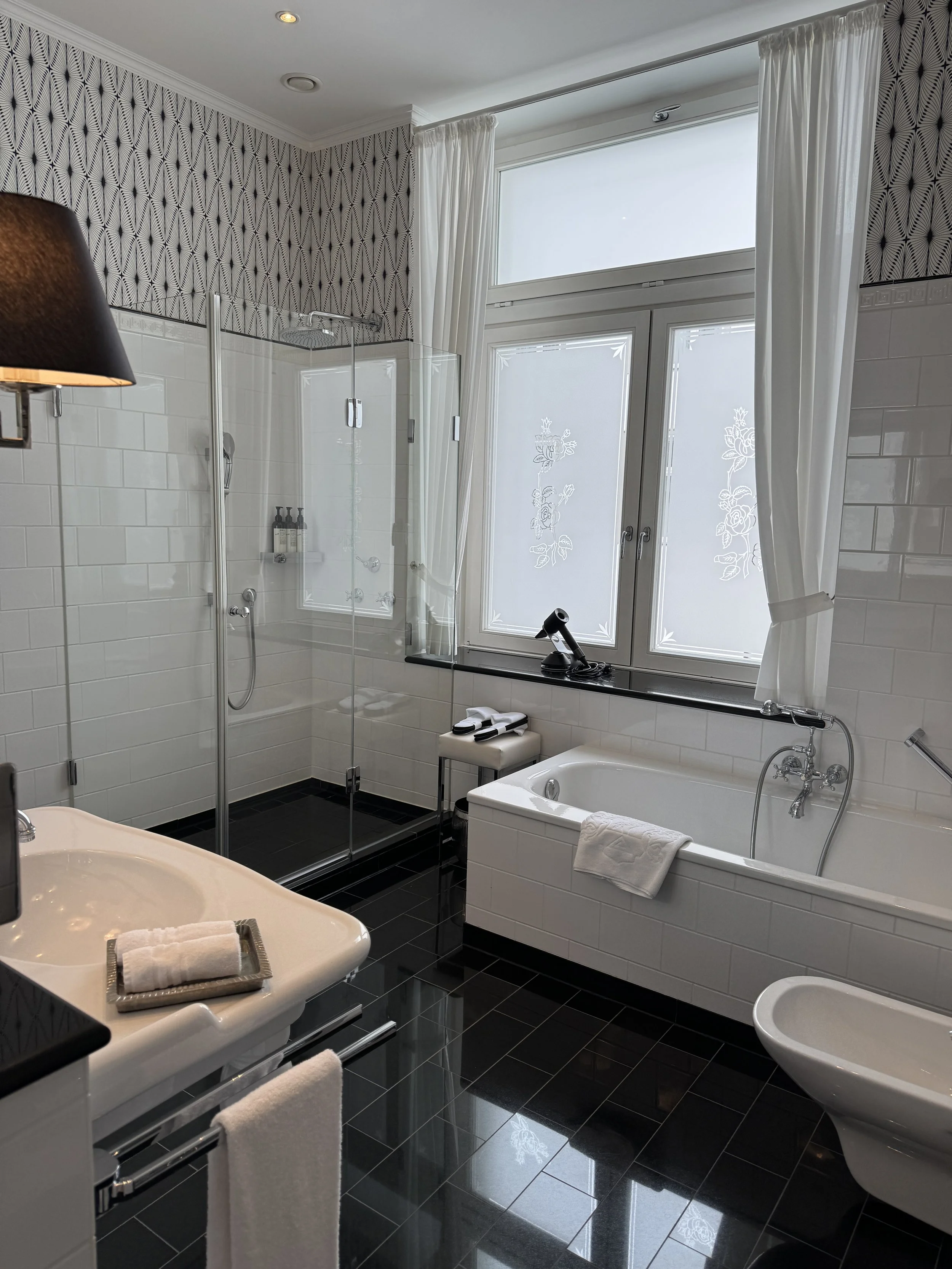 It was pleasing to see that the bathrooms were renovated in a classic style without unnecessary extravagance. Elegant white and black tiles create a timeless look, complemented by high-quality fixtures and wonderfully scented Le Labo Rose toiletries. These amenities are among my absolute favorites — I even use the fragrance myself — so this was an easy 10/10. Towels were extremely plush, and the twice-daily housekeeping service was impeccable. We had a spacious walk-in shower with excellent water pressure, a deep bathtub, double vanities, and a separate toilet with its own small sink — absolutely everything we could have wished for during this mother-son trip.