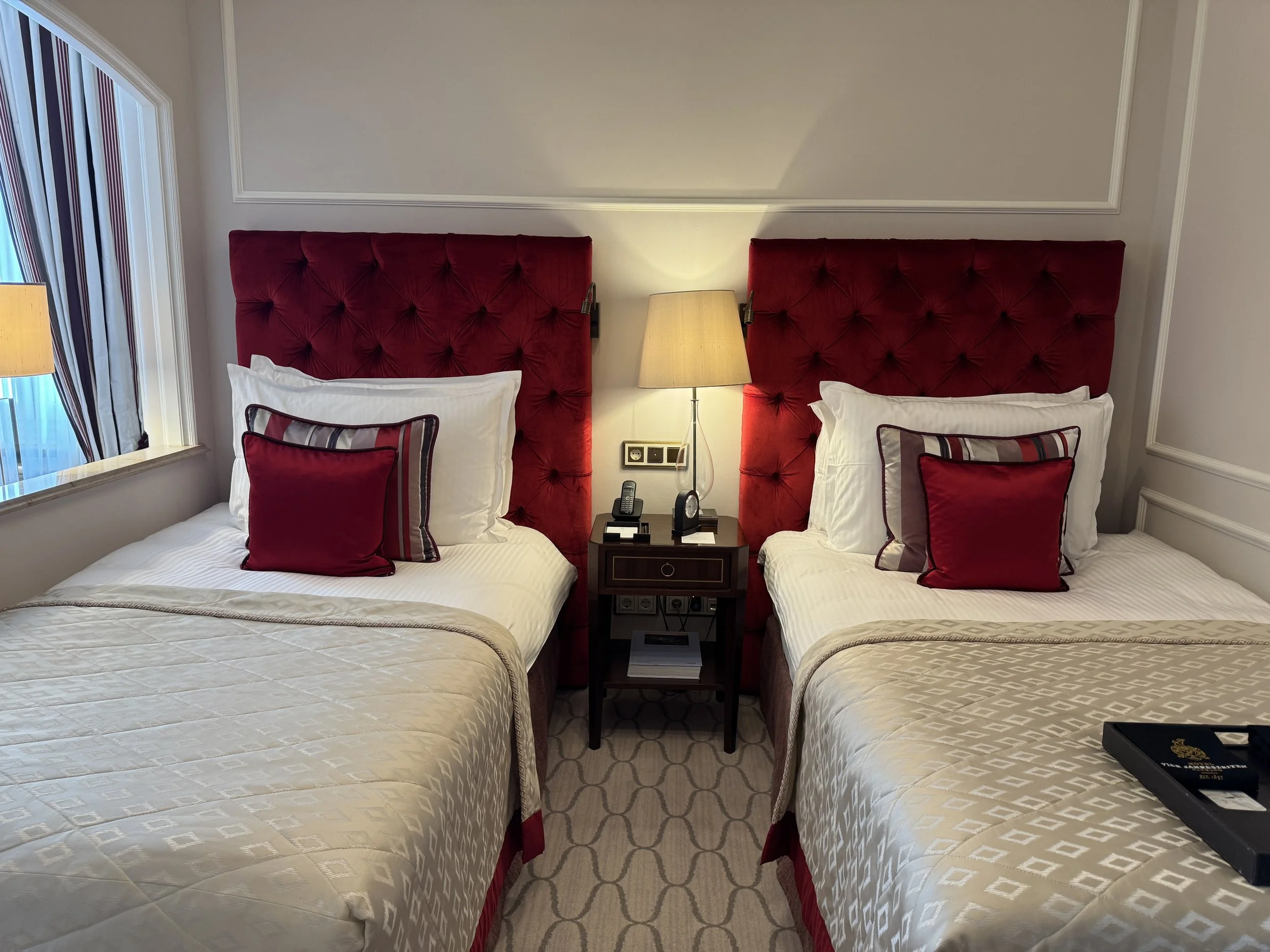 The suite’s living room featured a comfortable sofa, armchair, and a proper desk area. The large windows overlooked a beautifully maintained inner courtyard that felt bright and serene despite being inaccessible. The bedroom, semi-separated, offered wonderfully comfortable twin beds as requested, a small vanity corner, and a spacious walk-in wardrobe. Two televisions were available, though I would have appreciated a Bluetooth speaker for music — a small but noticeable omission in an otherwise well-considered setup.