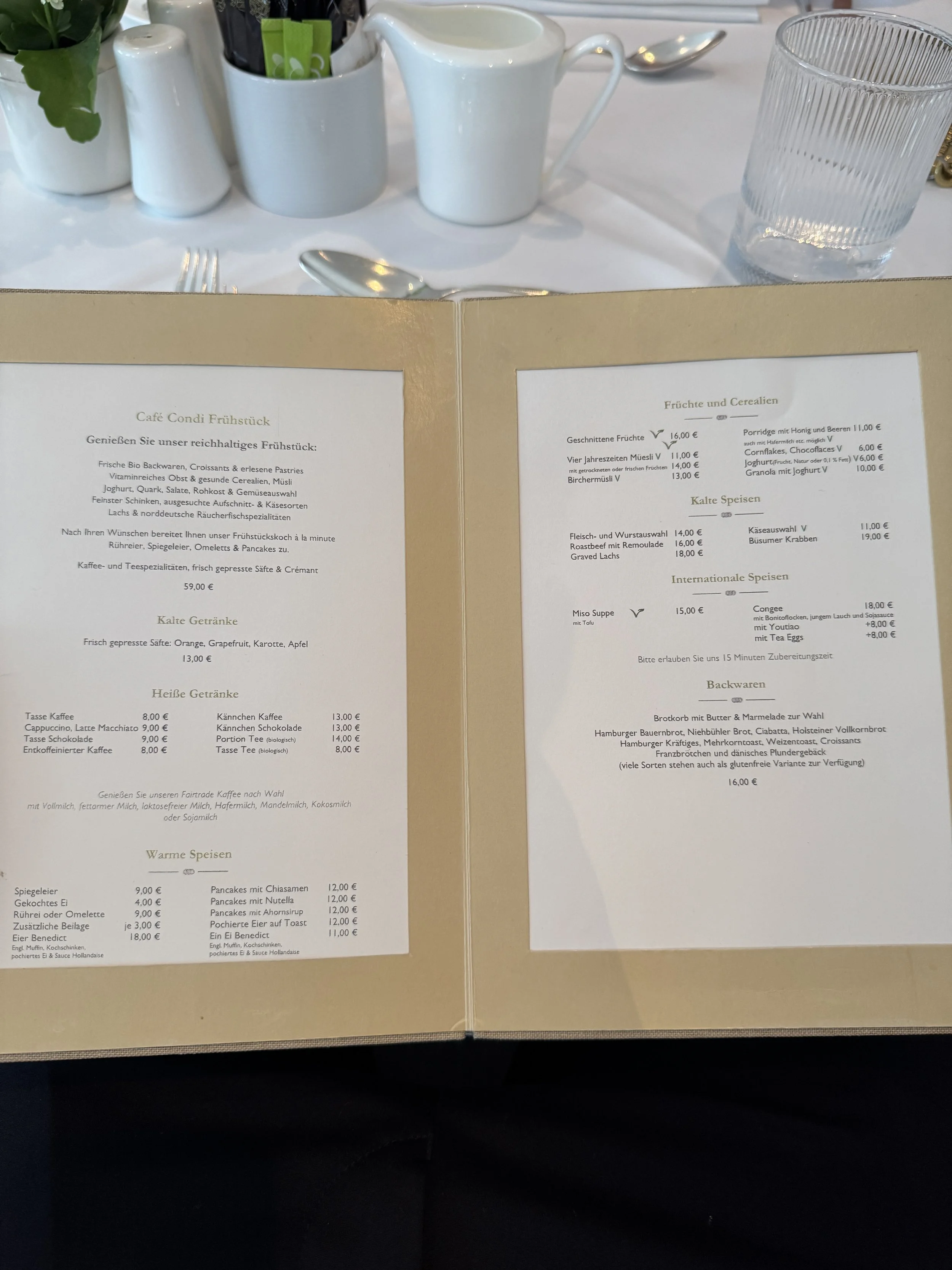 Since my mother is a great fan of breakfast and brunch, we thoroughly enjoyed our three mornings at Café Condi, which serves as the hotel’s breakfast venue with a full buffet. There is also an additional à-la-carte menu with dishes to order, all included in the bed-and-breakfast rate. We went for pancakes, excellent Eggs Benedict, and waffles, and I can confidently say this breakfast ranks among the best in Europe. The buffet presentation was beautiful, with small fridges, a live cooking station, a bakery section with a vast bread selection, and lovely, attentive service. Due to the relatively limited space, the café can feel a bit cramped when busy, so I recommend arriving early or closer to the end of breakfast service. Even when the café was almost at full capacity, our orders arrived on time and exactly as requested. I also appreciated that guests could choose to sit in the more elegant Grill restaurant for the same breakfast offering. It caters to two different design preferences, and next time I would likely choose the Grill, as I love its refined and sophisticated atmosphere.